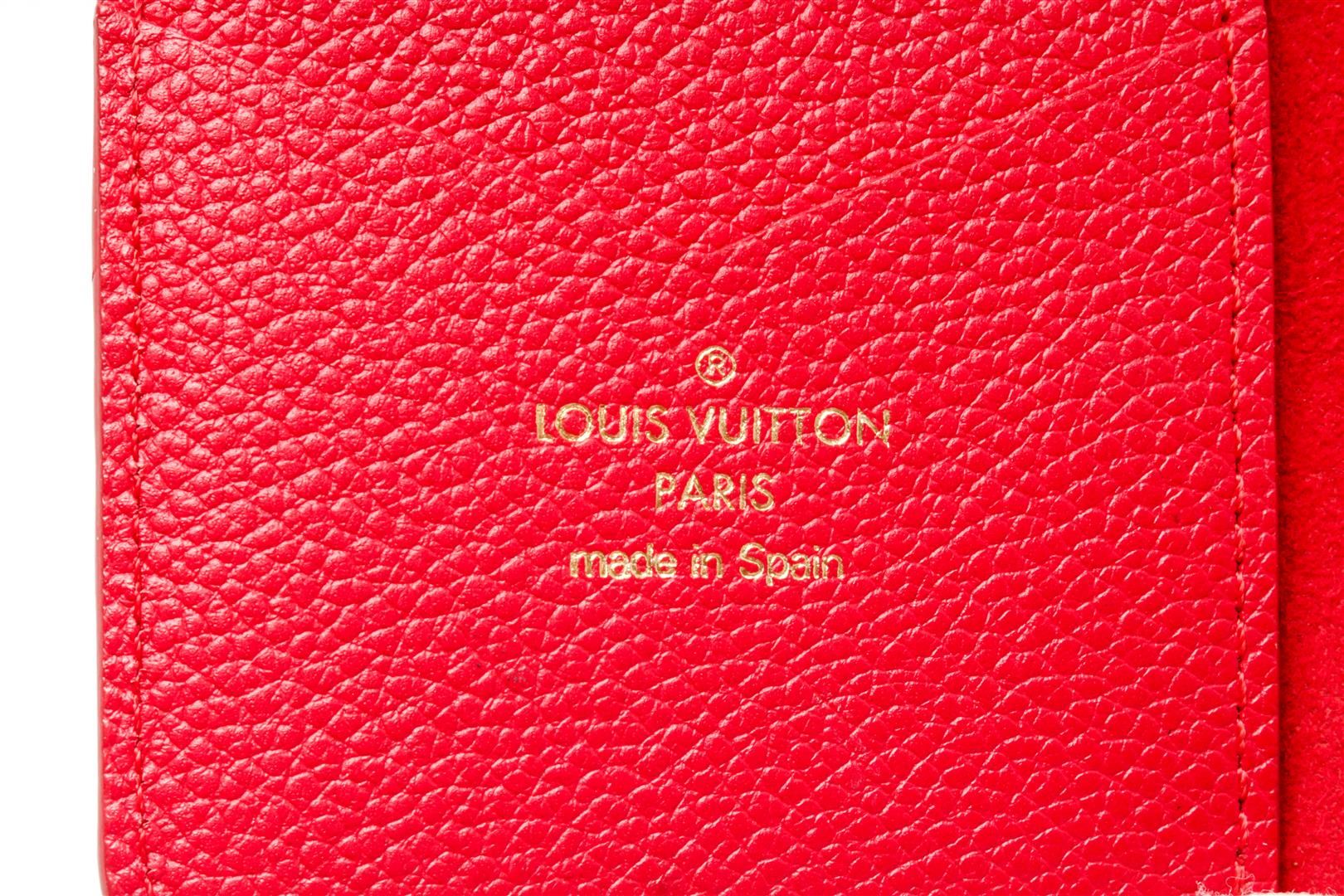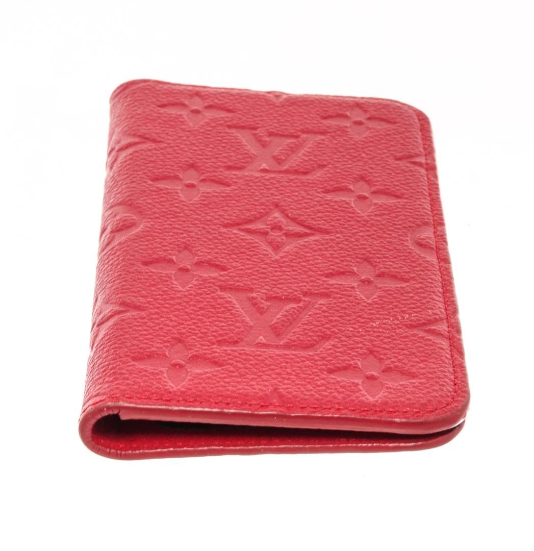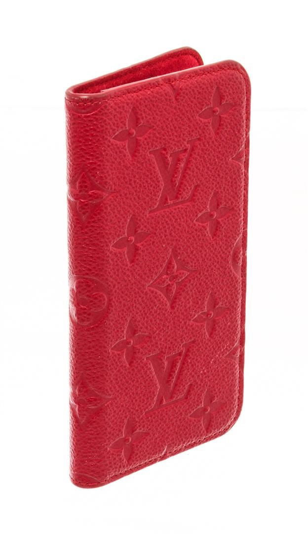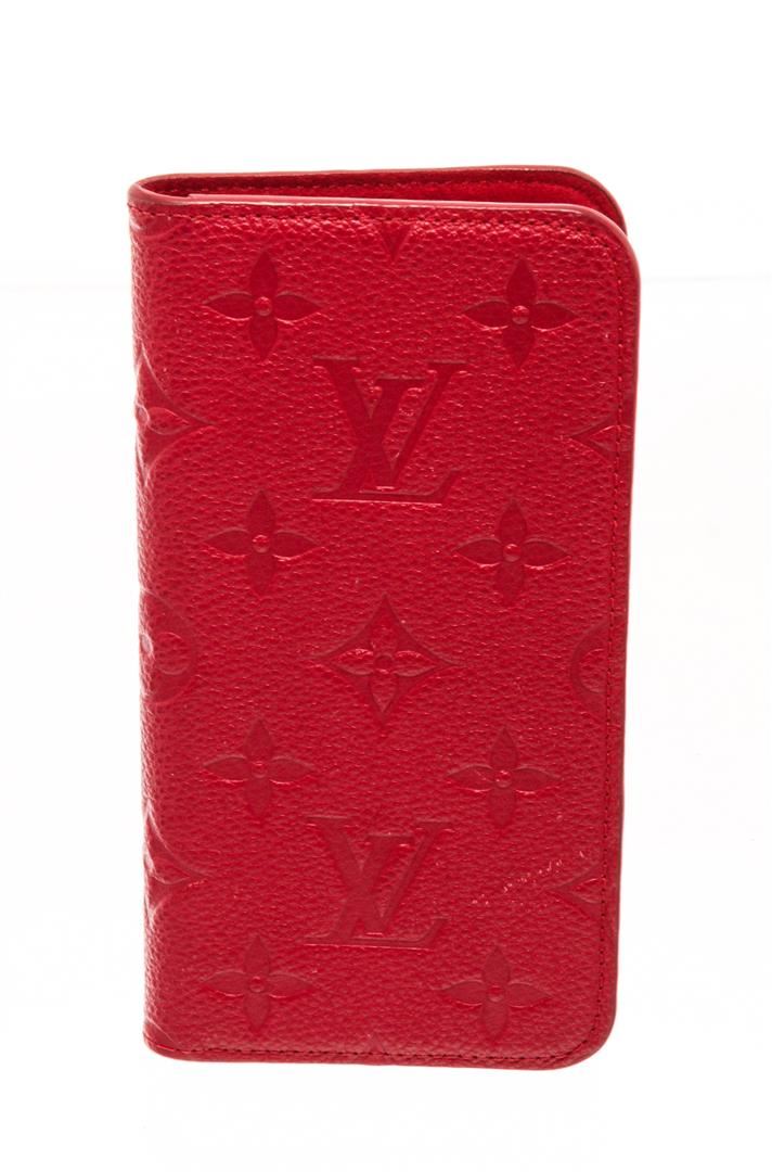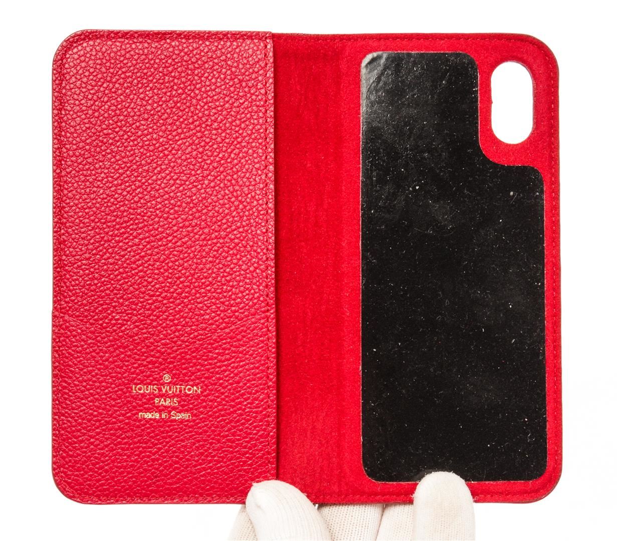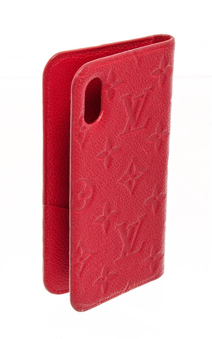 Louis Vuitton Red Leather Iphone XS Case. All available information is listed in the description and shown in the photos. Louis Vuitton Red Leather Empriente Iphone XS Case with slip pockets.