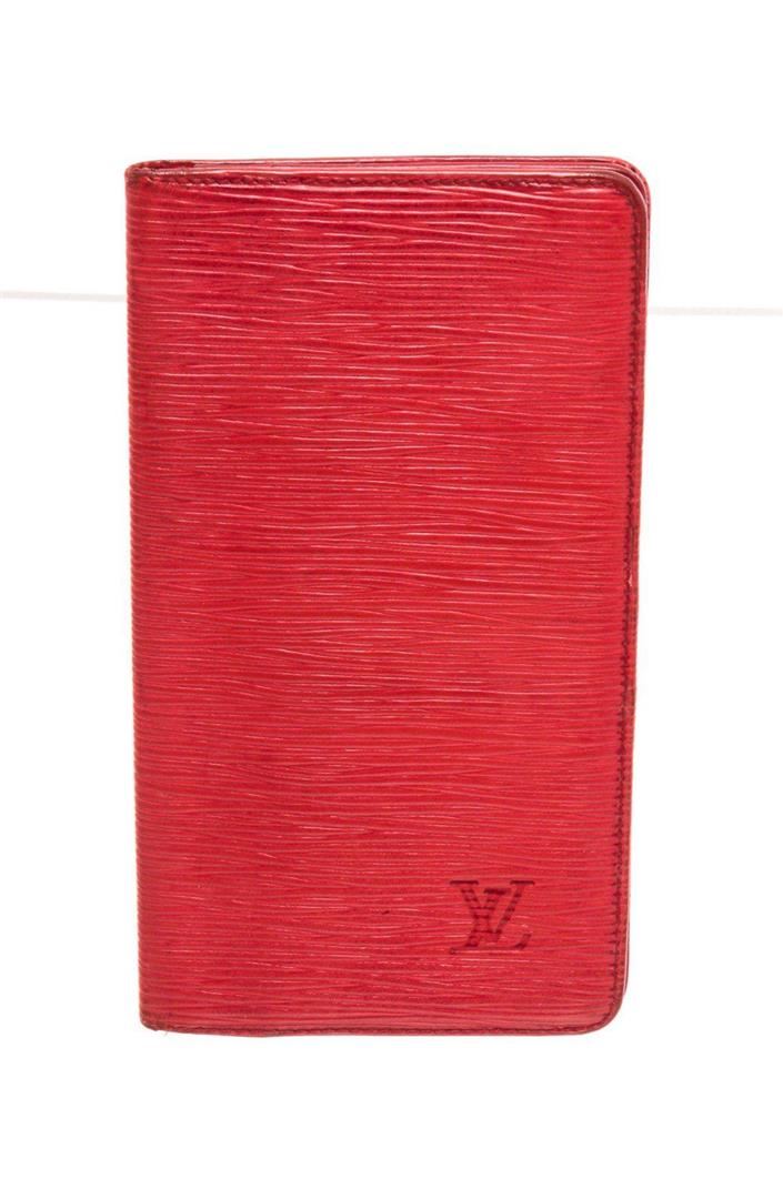 Louis Vuitton Red Leather Long Card Wallet with material epi leather, gold-tone hardware, interior card holder pockets, trim tan vachetta leather and flap closure. Measurements: Length 6.5 in / 17 cm Width 3.5 in / 9 cm Height 0.25 in / 1 cm Condition: Pre-Owned Good overall, please see photographs for detail.