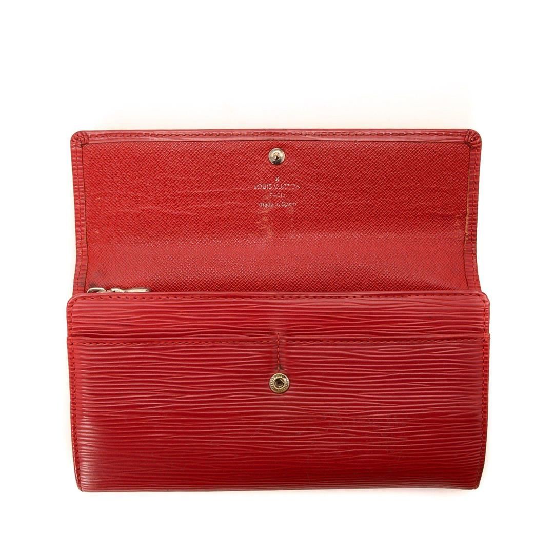 Louis Vuitton Red Monogram Carmine Sarah Wallet with gold-tone hardware, monogram leather, tan vachetta leather trim, flap closure. Measurements: Length: 17.2 in / 44 cm Width: 5 in / 13 cm 14.1 in / 36 cm Condition: Pre-Owned Good overall, please see photographs for detail.