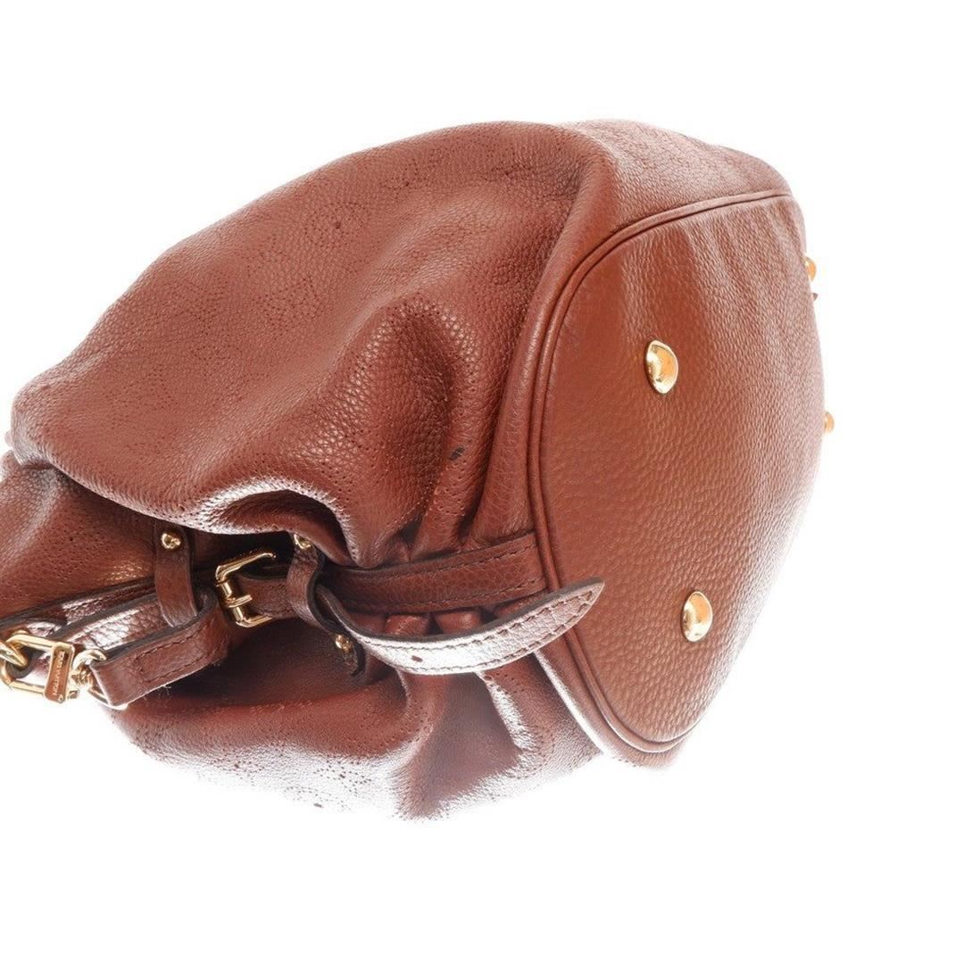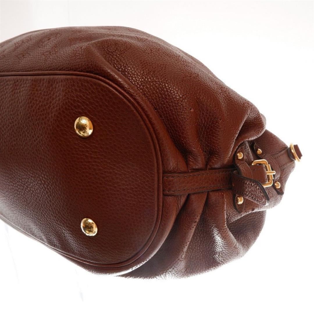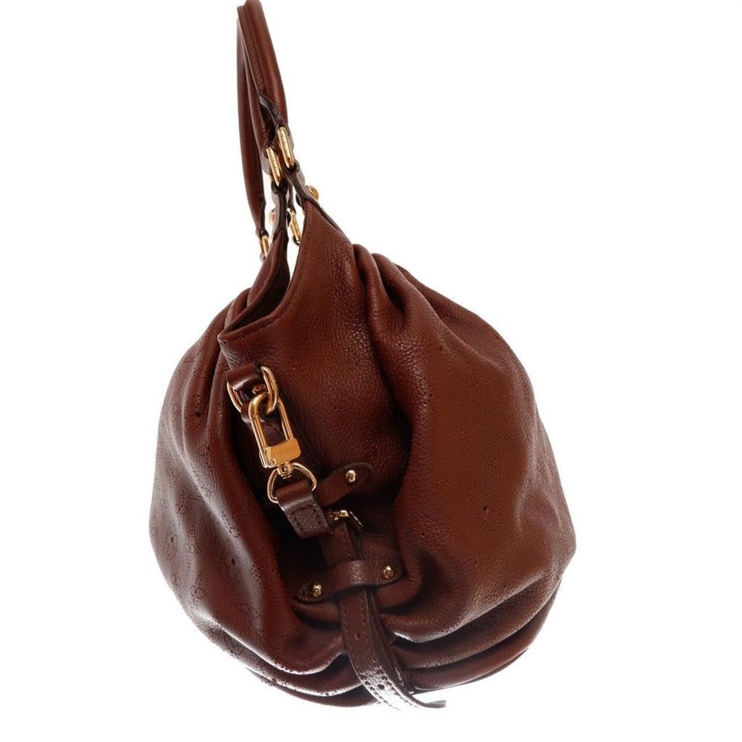 Red perforated monogram pattern Louis Vuitton Mahina XL hobo bog with calfskin leather, brown Alcantara interior lining, one zip pocket, double rolled leather handles, open top with leather flap tab and push-lock closure, gold-tone hardware.