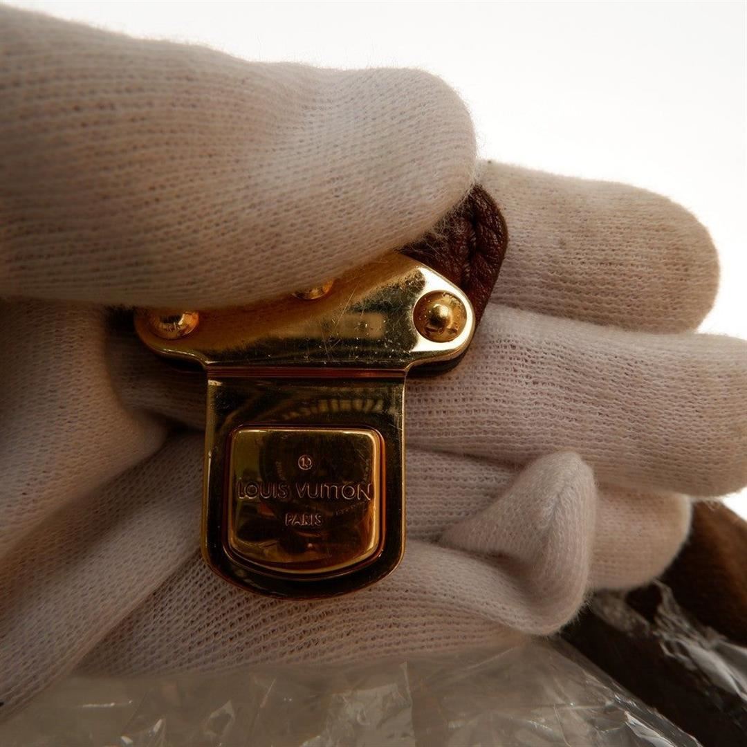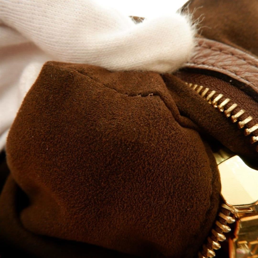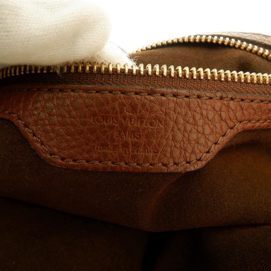 Red perforated monogram pattern Louis Vuitton Mahina XL hobo bog with calfskin leather, brown Alcantara interior lining, one zip pocket, double rolled leather handles, open top with leather flap tab and push-lock closure, gold-tone hardware.
