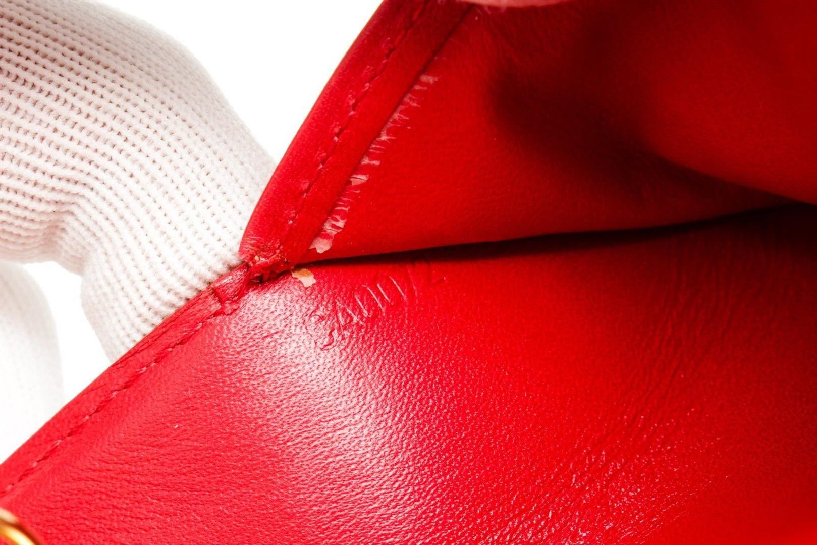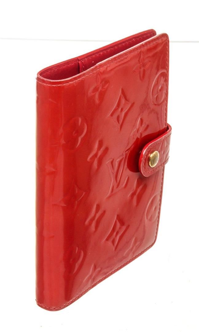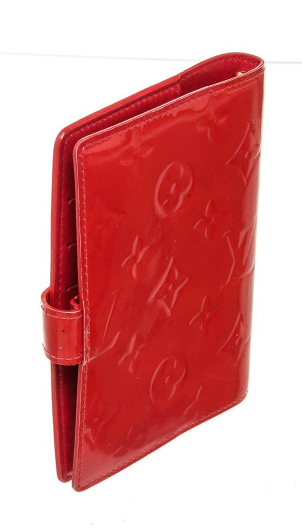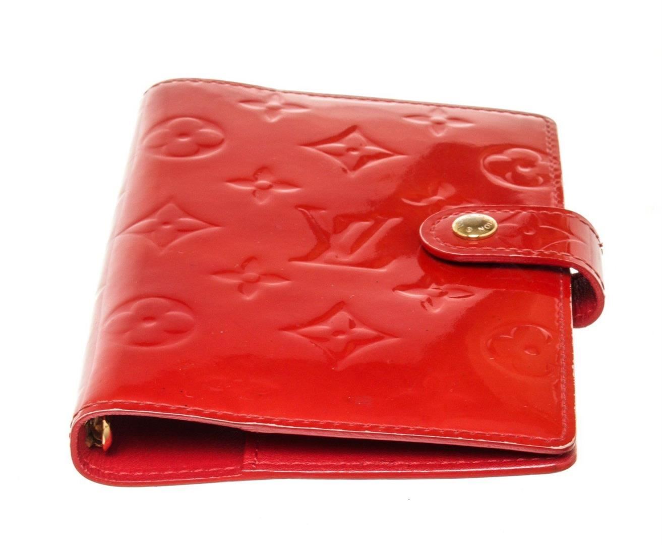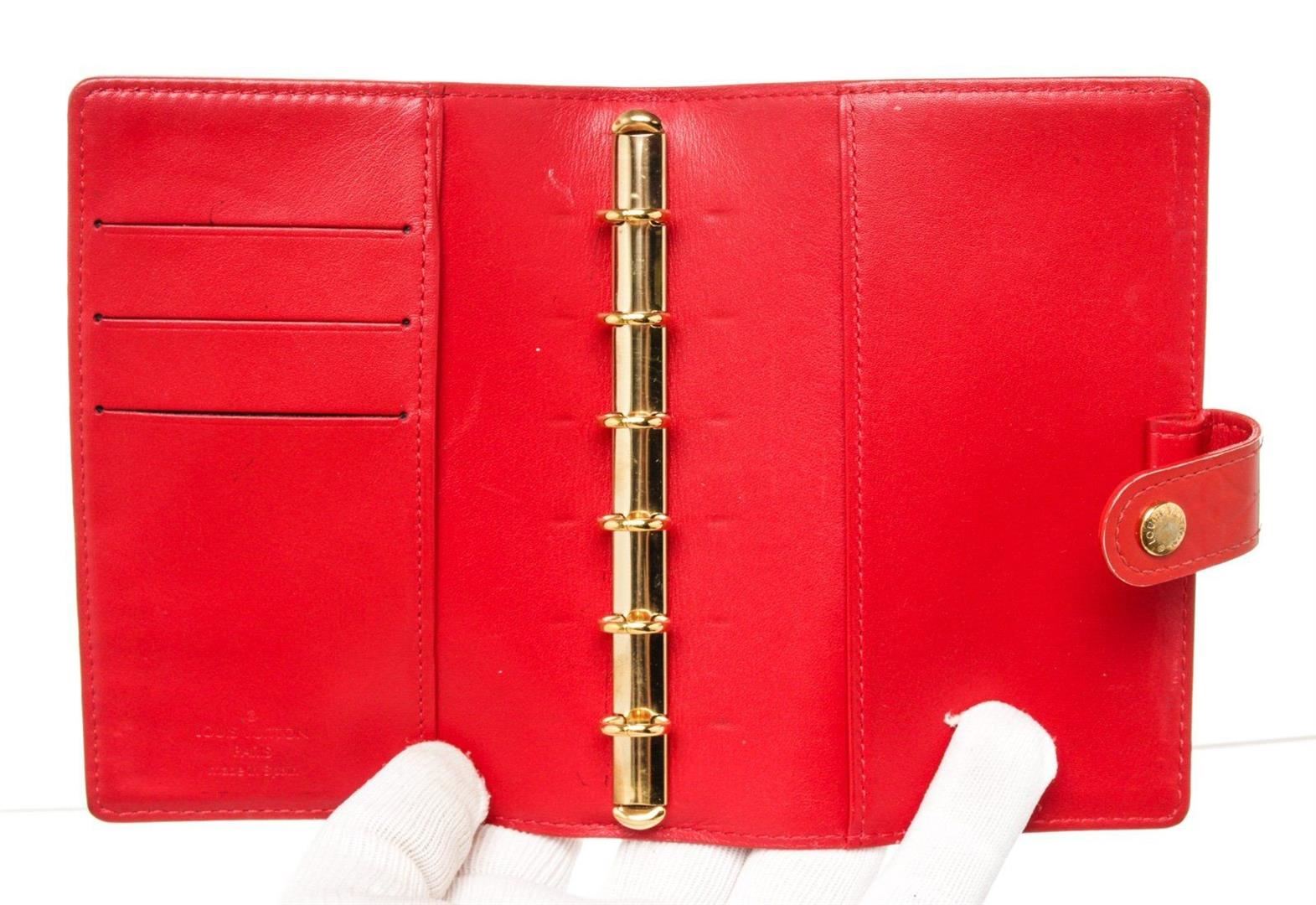 Louis Vuitton Red Monogram Vernis Leather Agenda PM Wallet with monogram vernis leather, silver-tone hardware, trim tan vachetta, leather leather lining, interior three compartments pocket and snap closure.