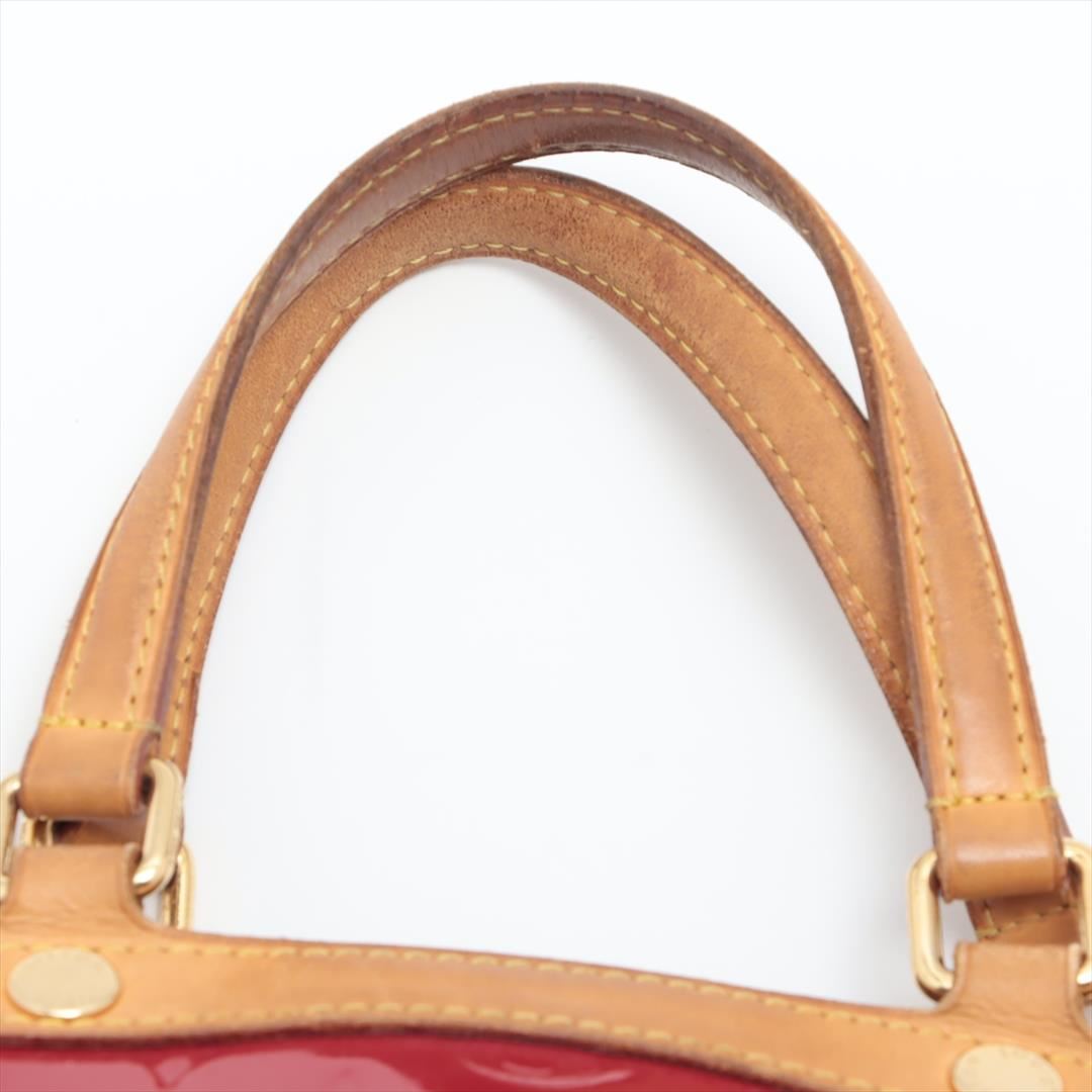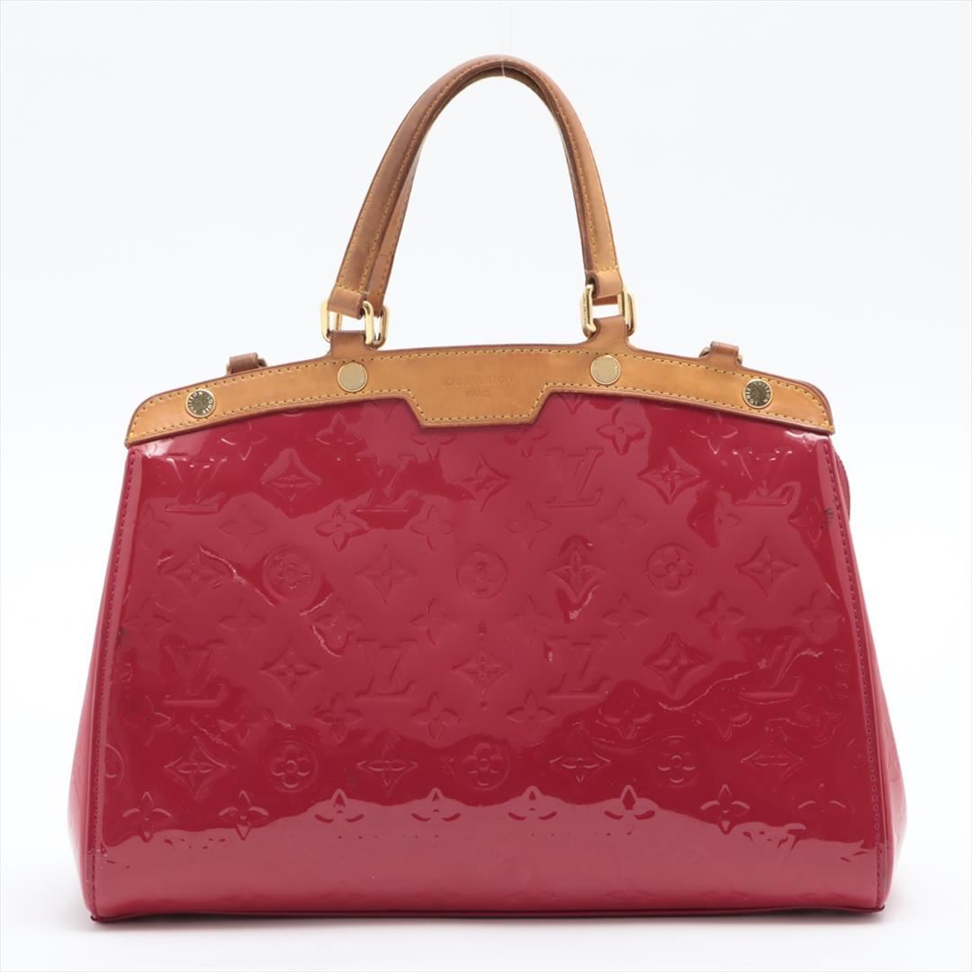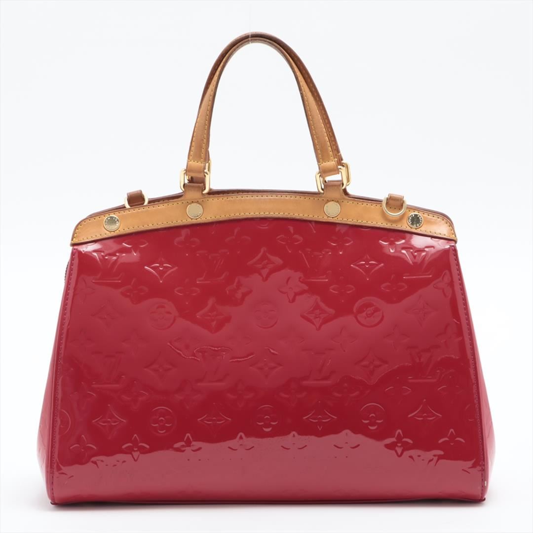 Red monogram Vernis leather Louis Vuitton Brea MM bag with gold-tone hardware, tan Vachetta leather trim, protective feet at base, tonal canvas lining, three interior pockets, dual flat handles and top zipper closure. 13.1"x4.9"x9.4"HD:4.4"/33.24cmx12.