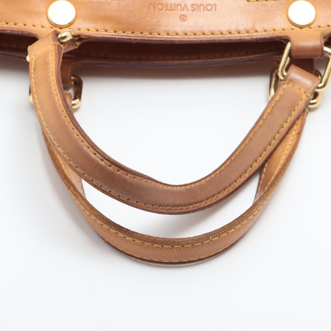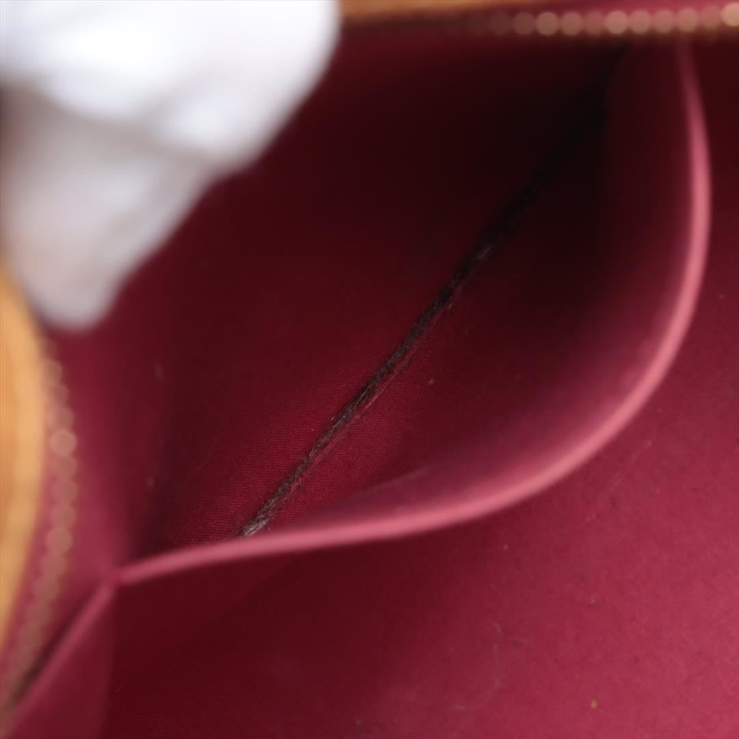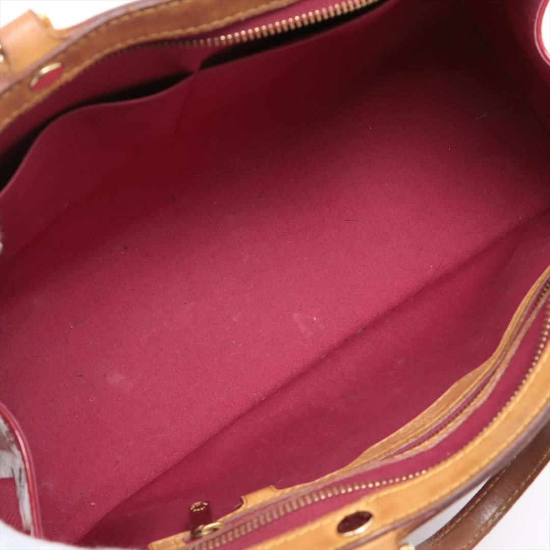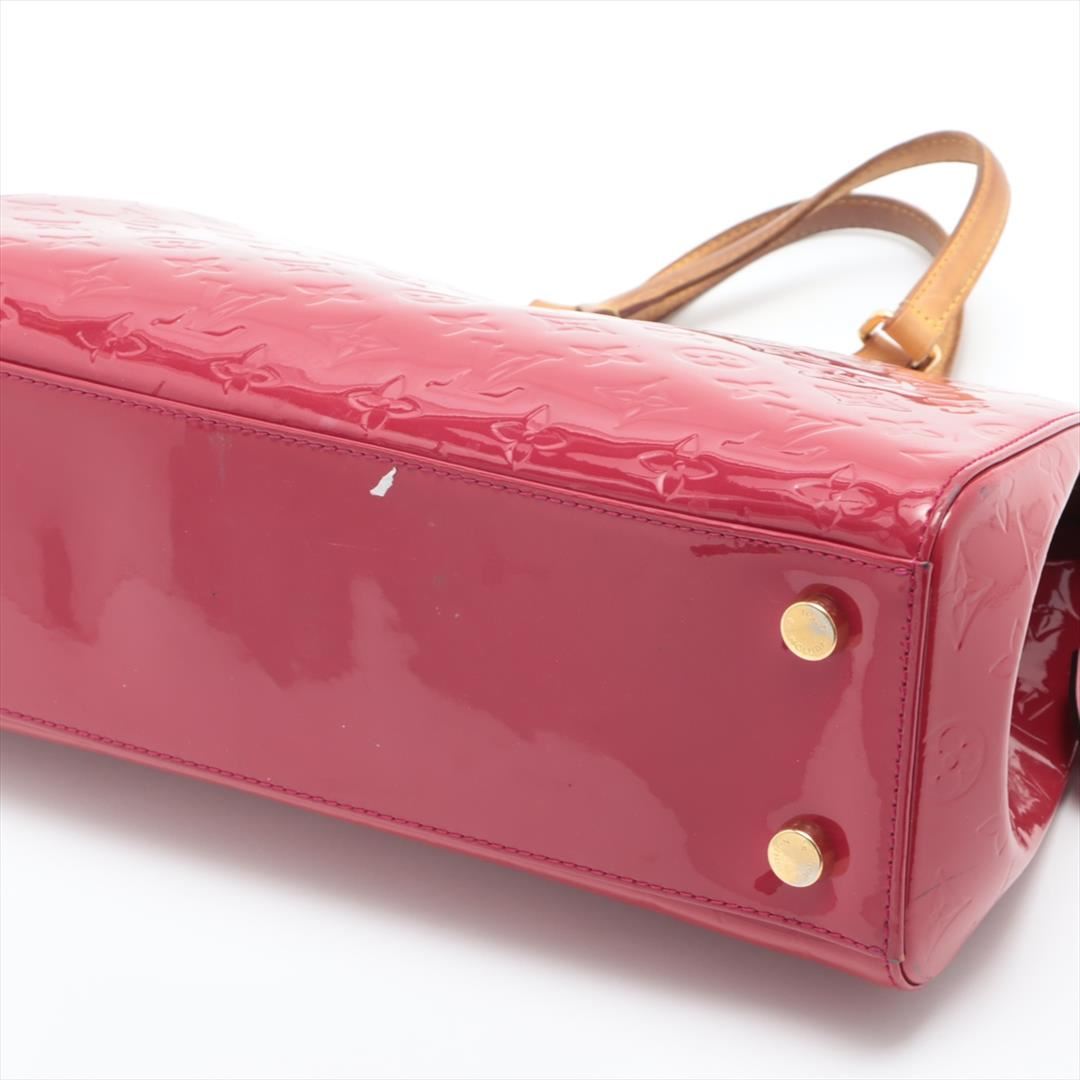 Red monogram Vernis leather Louis Vuitton Brea MM bag with gold-tone hardware, tan Vachetta leather trim, protective feet at base, tonal canvas lining, three interior pockets, dual flat handles and top zipper closure. 13.1"x4.9"x9.4"HD:4.4"/33.24cmx12.