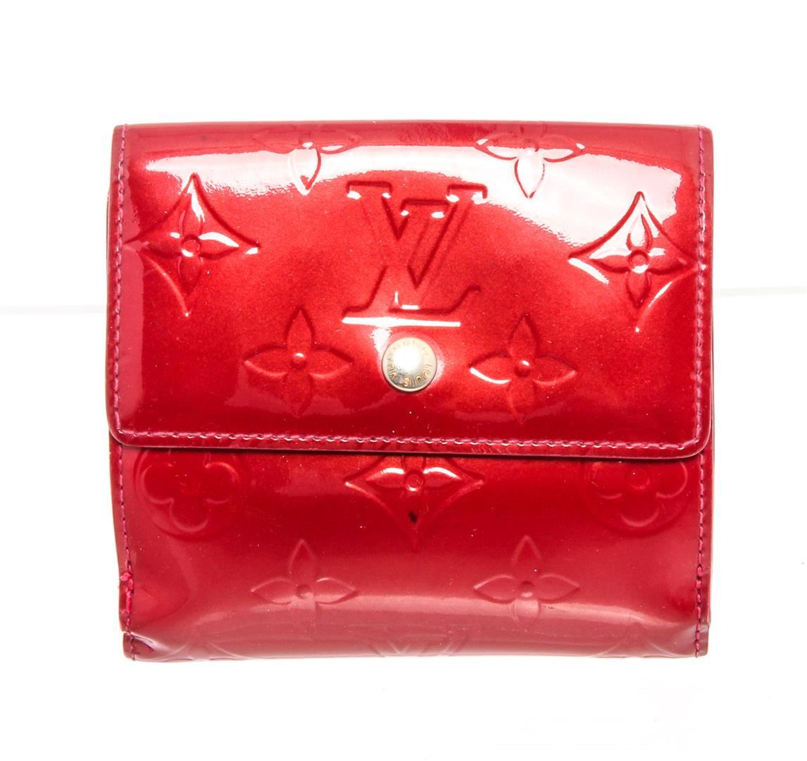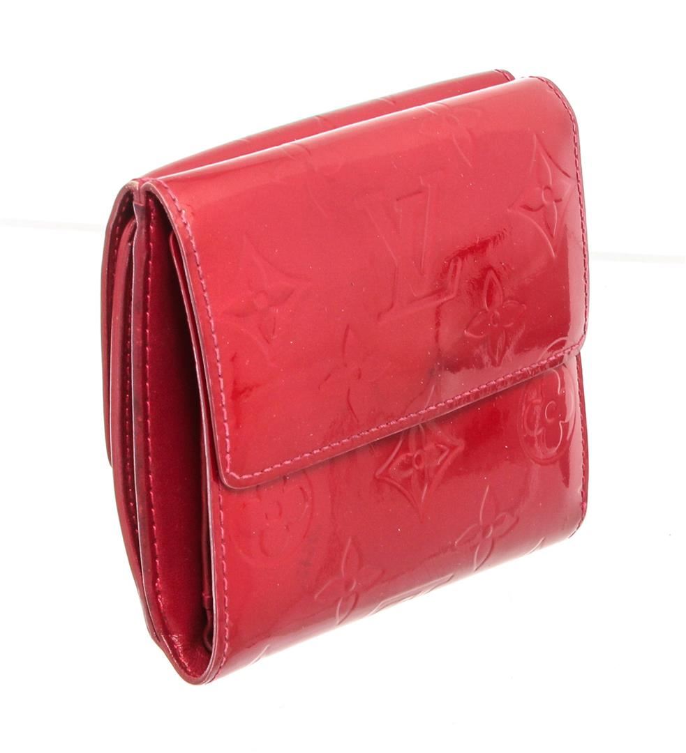 Red monogram Vernis leather Louis Vuitton Elise wallet with brass hardware, single flap pocket at front face, red leather lining, six card slots, single cash compartment, dual slip pockets and snap closure at flap. Please note: Initials S.N stamped on interior.