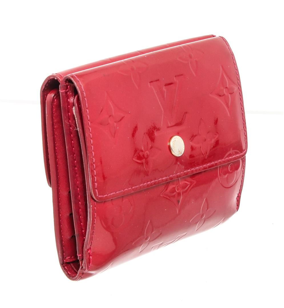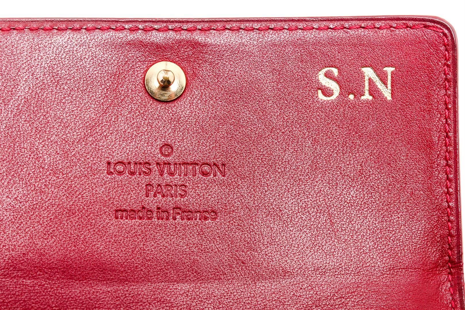 Red monogram Vernis leather Louis Vuitton Elise wallet with brass hardware, single flap pocket at front face, red leather lining, six card slots, single cash compartment, dual slip pockets and snap closure at flap. Please note: Initials S.N stamped on interior.
