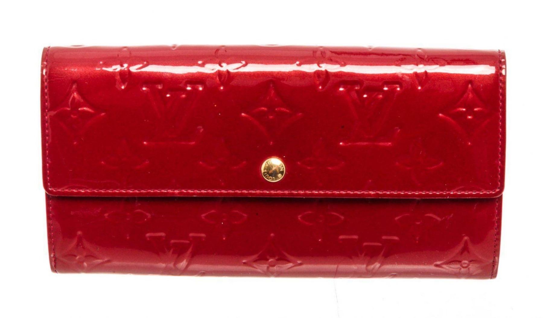 Louis Vuitton Red Monogram Vernis Leather Sarah Wallet. Louis Vuitton Red Monogram Vernis Leather Sarah Wallet with material monogram vernis leather, gold-tone hardware, three interior compartments pockets, trim tan vachetta leather and snap closure. MEA