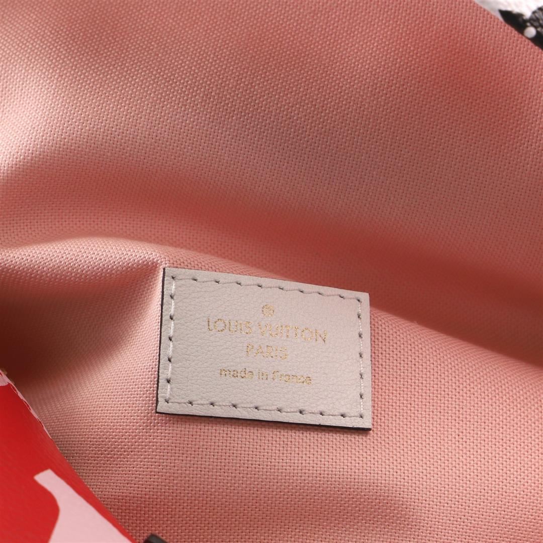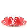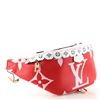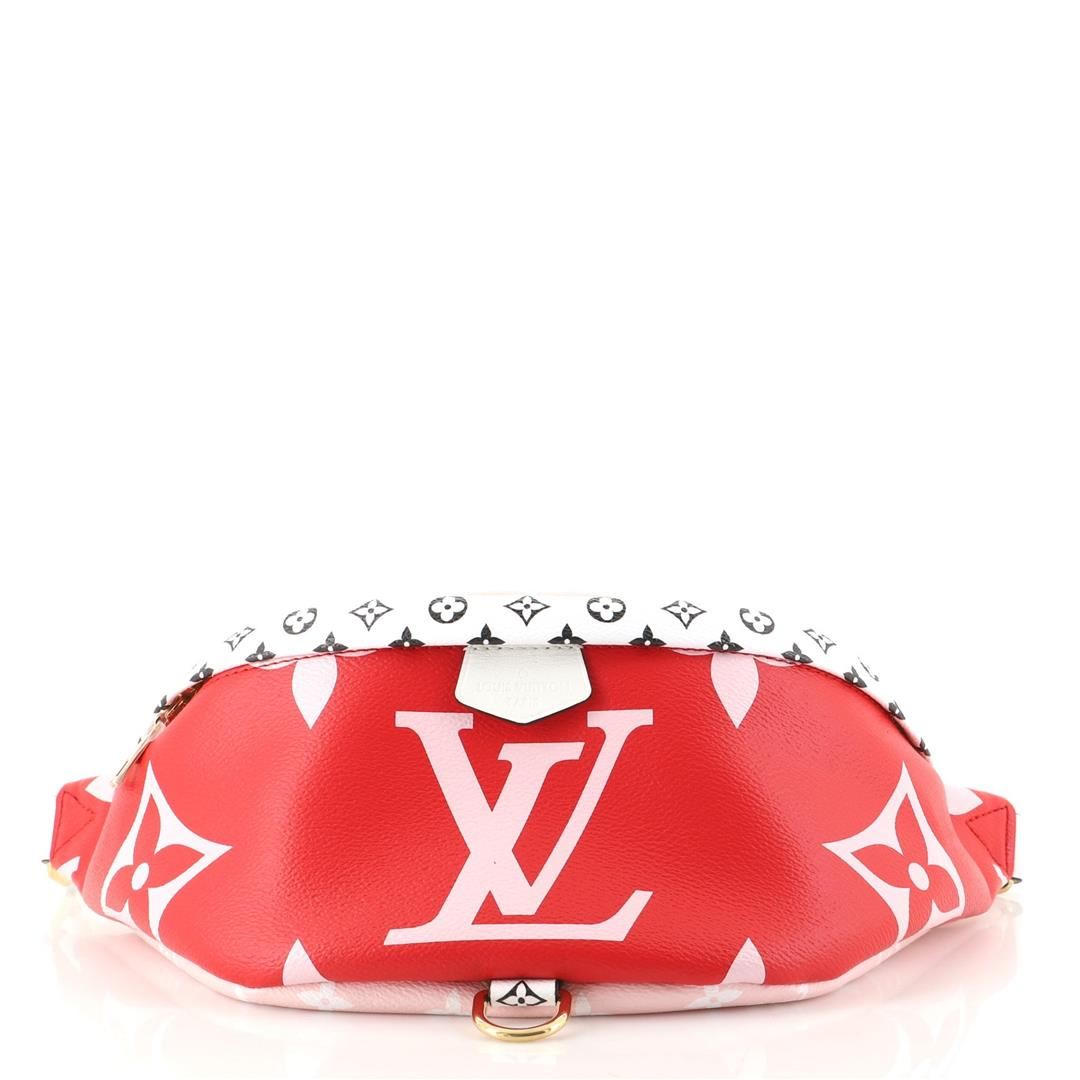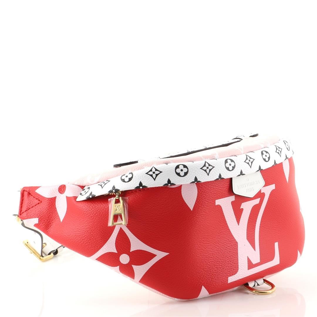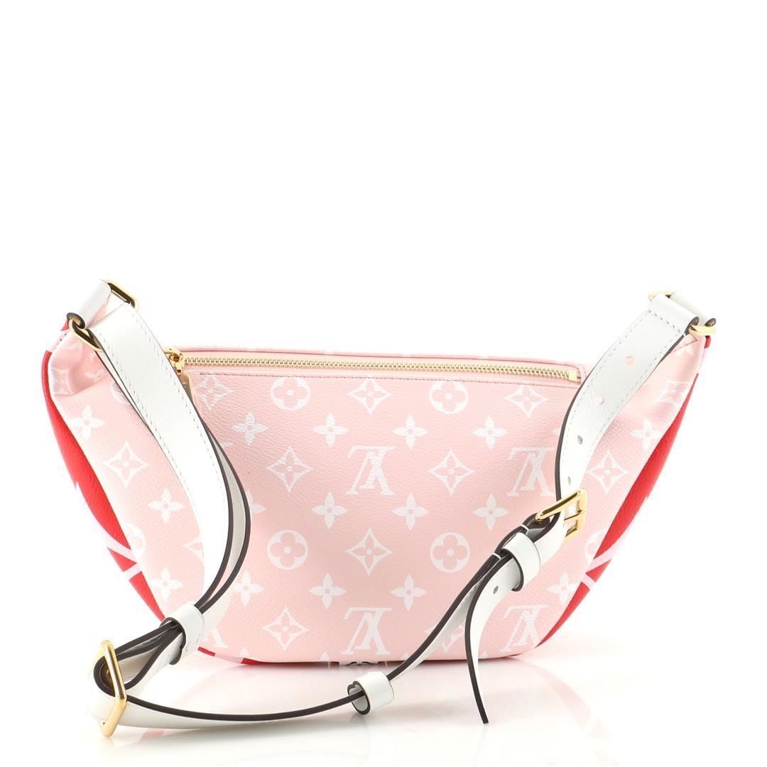 White and Red colored Giant Monogram coated canvas Louis Vuitton bumbag with gold-tone hardware, adjustable strap, pink textile lining at interior and zip closure at top. Height 5.5", Width 14.5", Depth 5", Strap Drop 11-14"