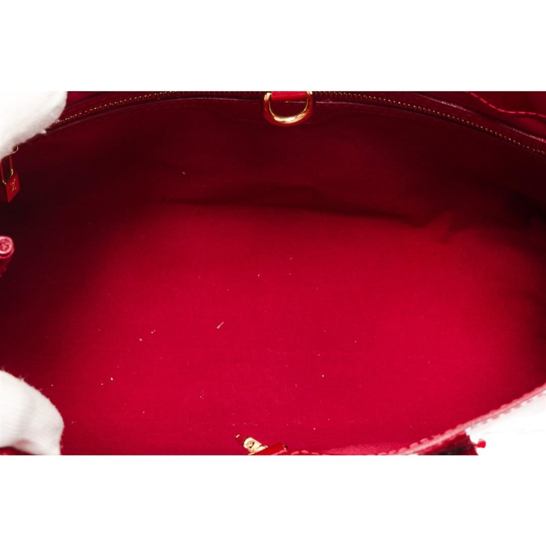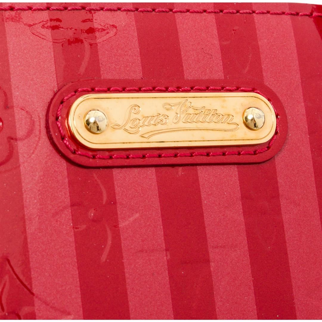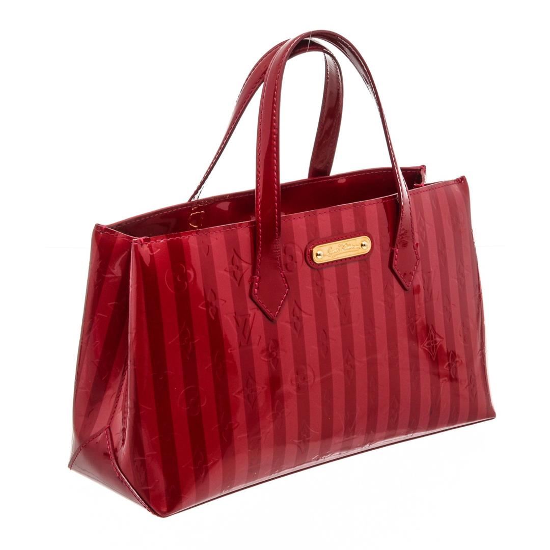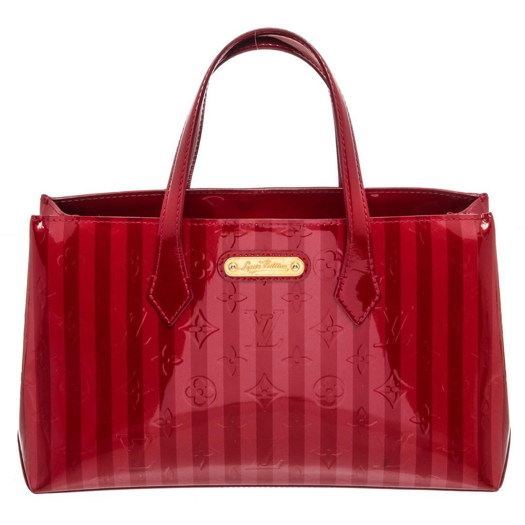 Monogram Vernis leather Louis Vuitton Wilshire PM with brass hardware, dual flat top handles, logo placard at front face, tonal canvas lining, single zip pocket at interior wall and clasp closure at top. Authentic.
