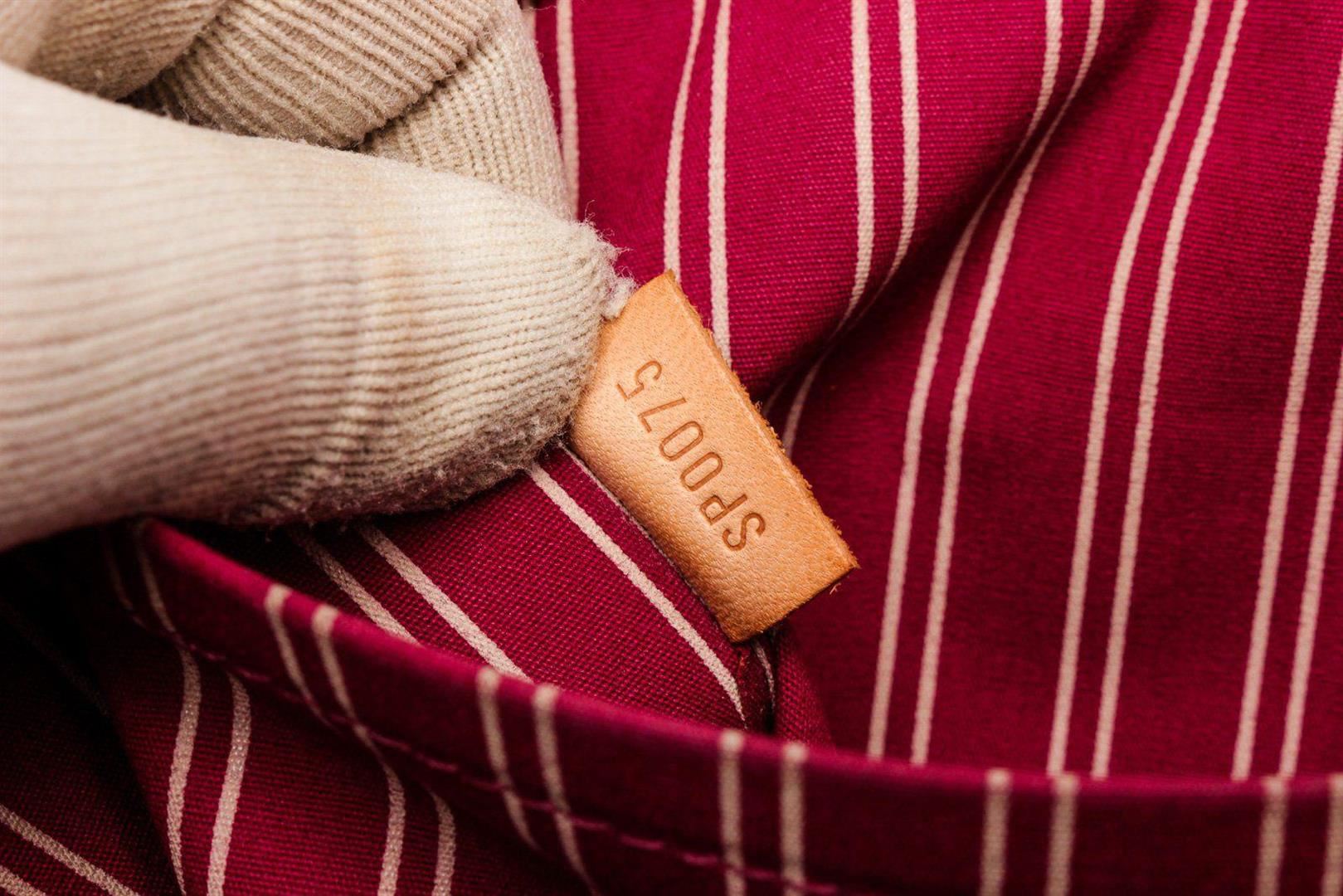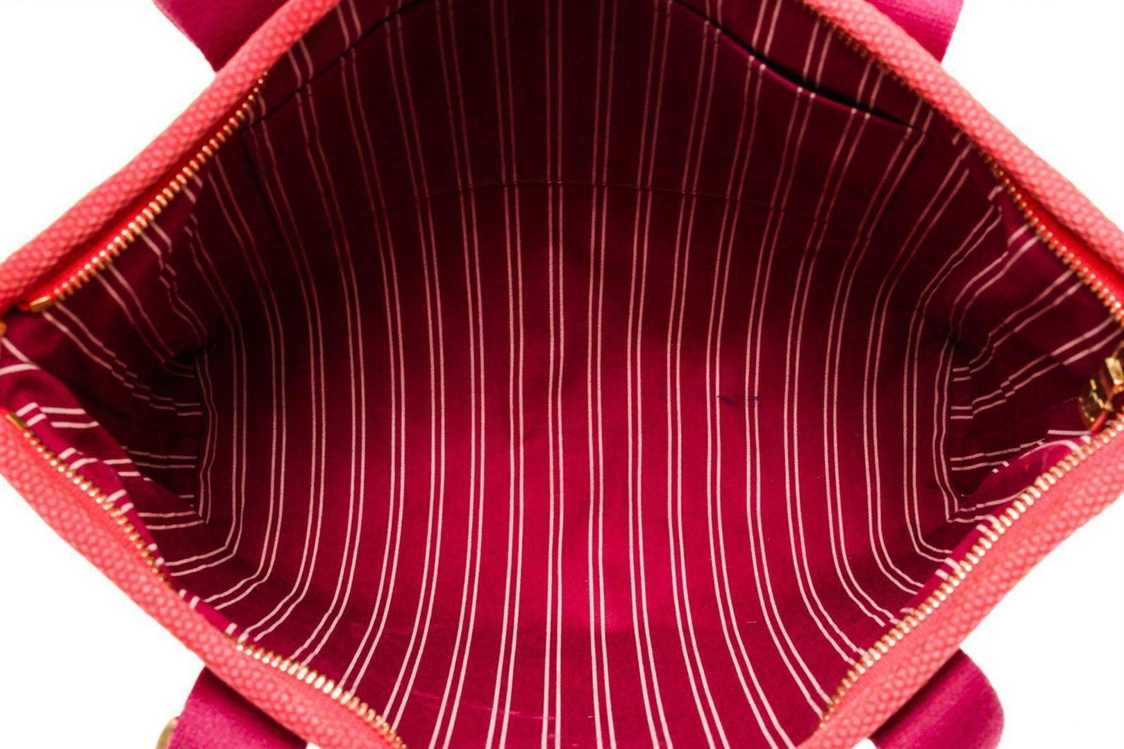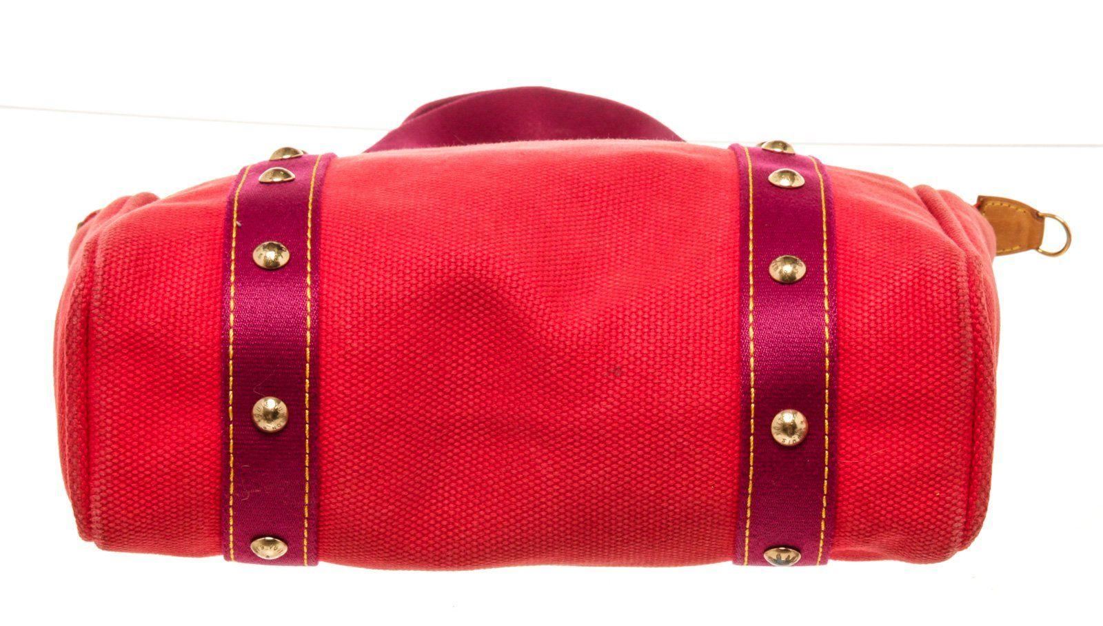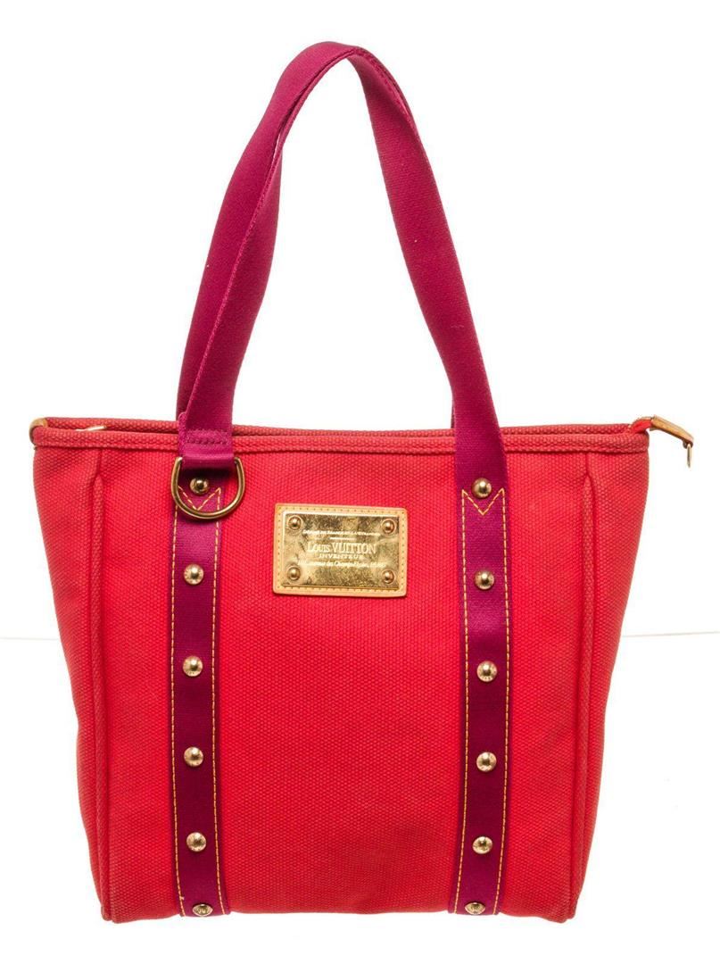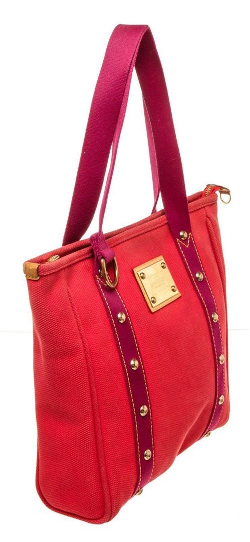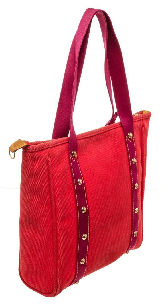 Louis Vuitton Red Purple Canvas Cabas Antigua MM Tote Bag with canvas, gold-tone hardware, trim leather, interior slip pockets, shoulder strap and zipper closure.