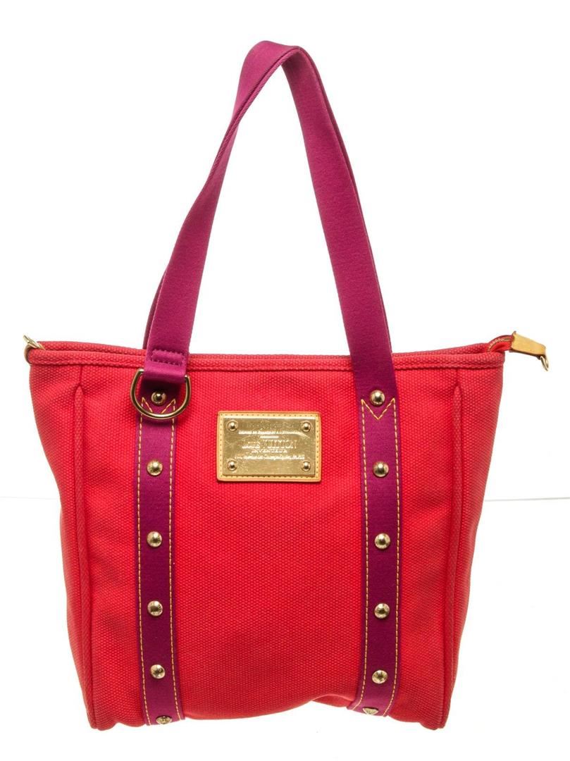 Louis Vuitton Red Purple Canvas Cabas Antigua MM Tote Bag with canvas, gold-tone hardware, trim leather, interior slip pockets, shoulder strap and zipper closure.