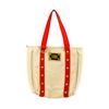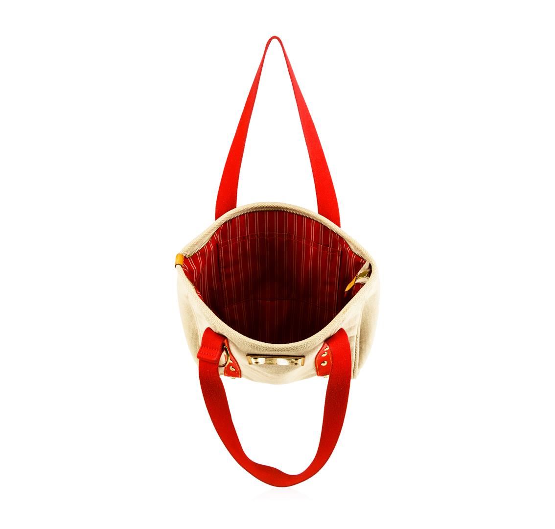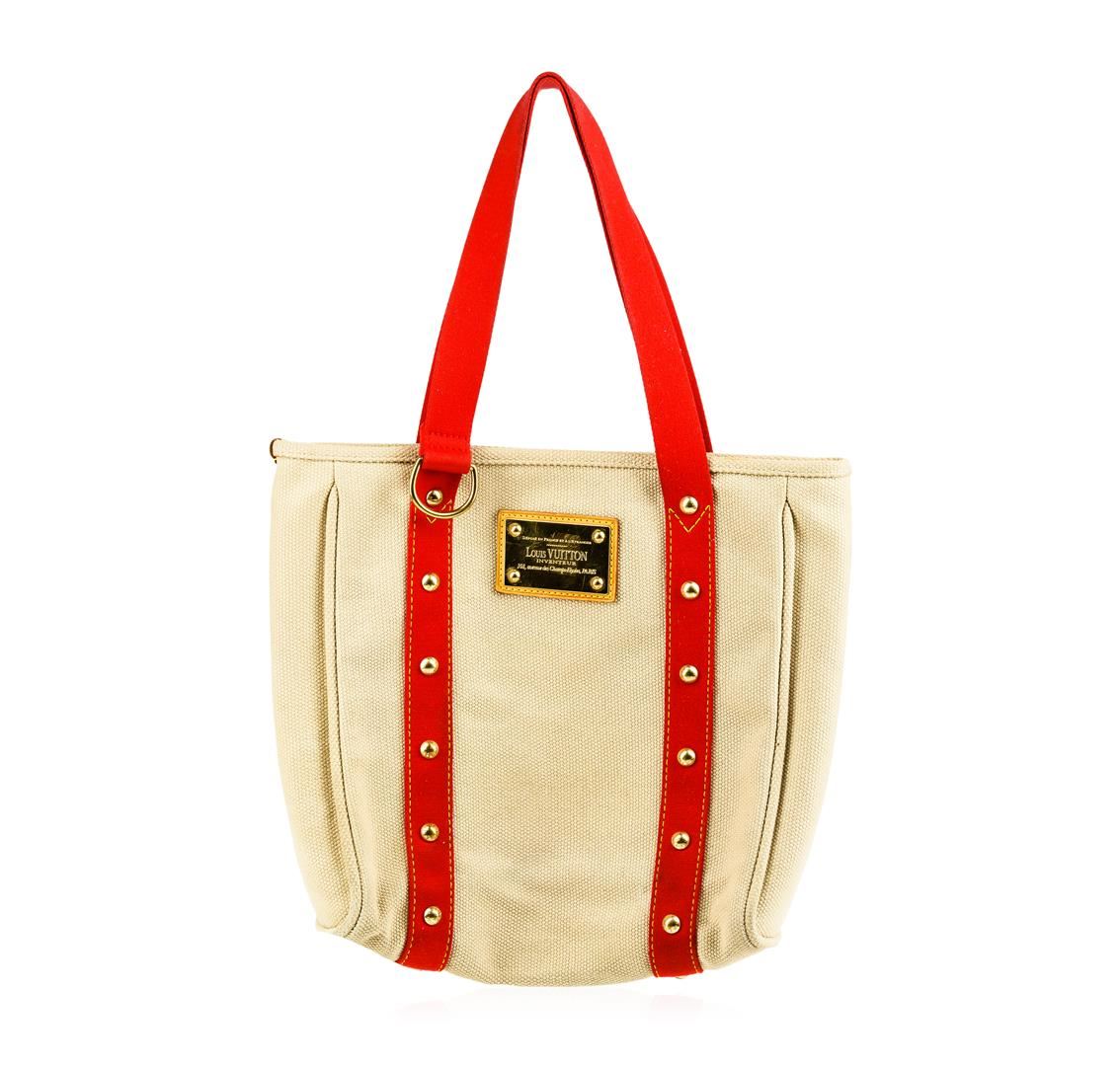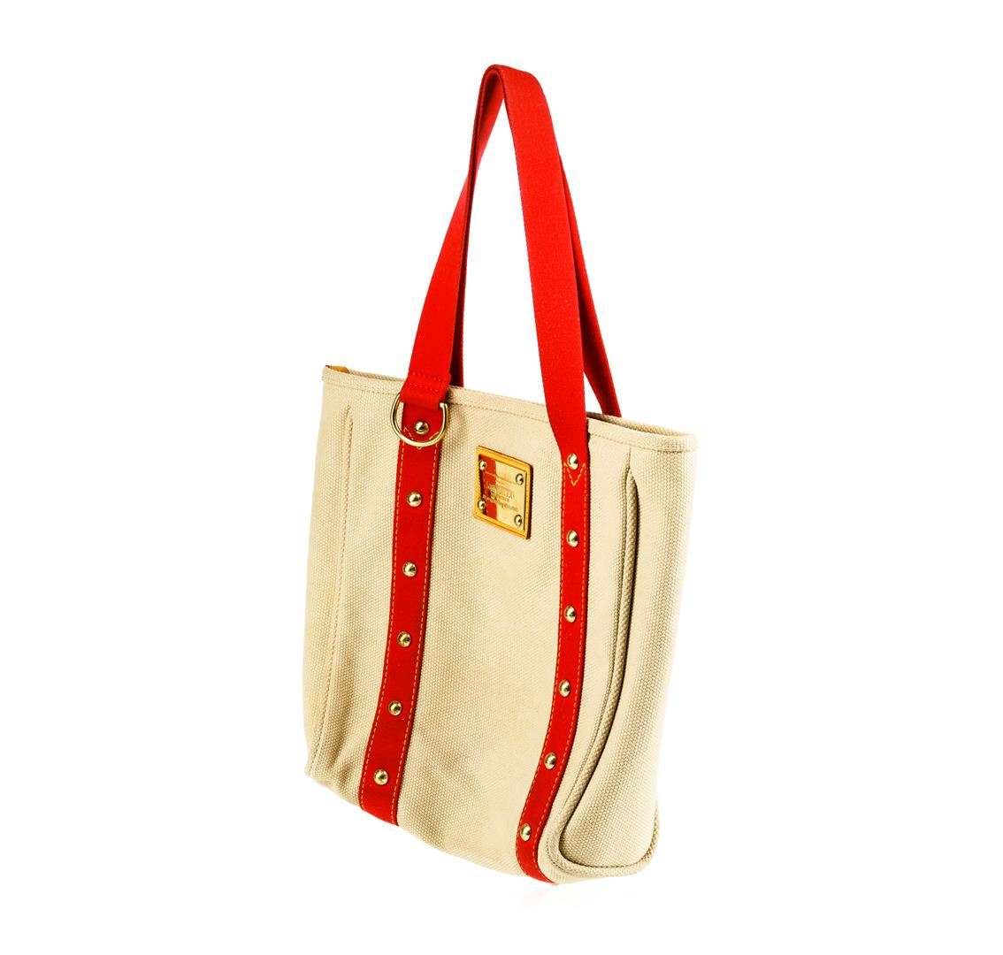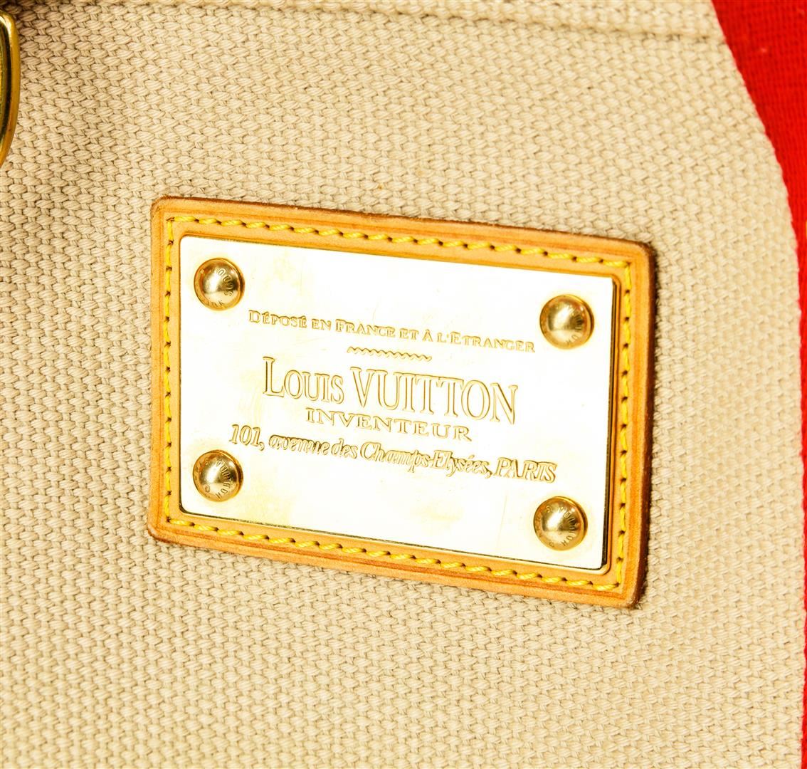 One Louis Vuitton Antigua Tan / Red Canvas tote bag. The bag features canvas with brass hardware, one inner non-zip pocket, a D-Ring for keys, and the LV Inventeur plate. The bag is in overall good condition.