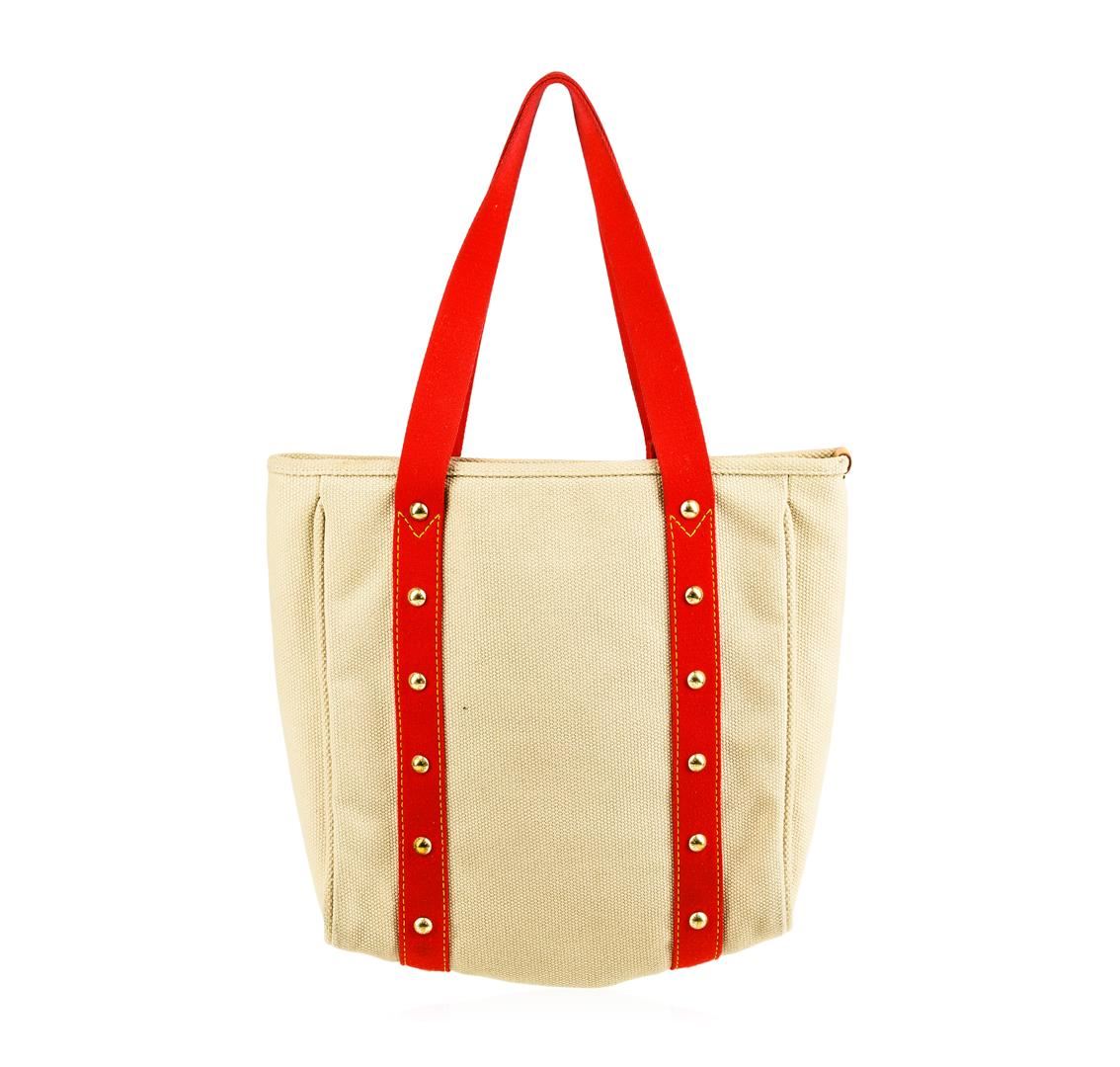 One Louis Vuitton Antigua Tan / Red Canvas tote bag. The bag features canvas with brass hardware, one inner non-zip pocket, a D-Ring for keys, and the LV Inventeur plate. The bag is in overall good condition.