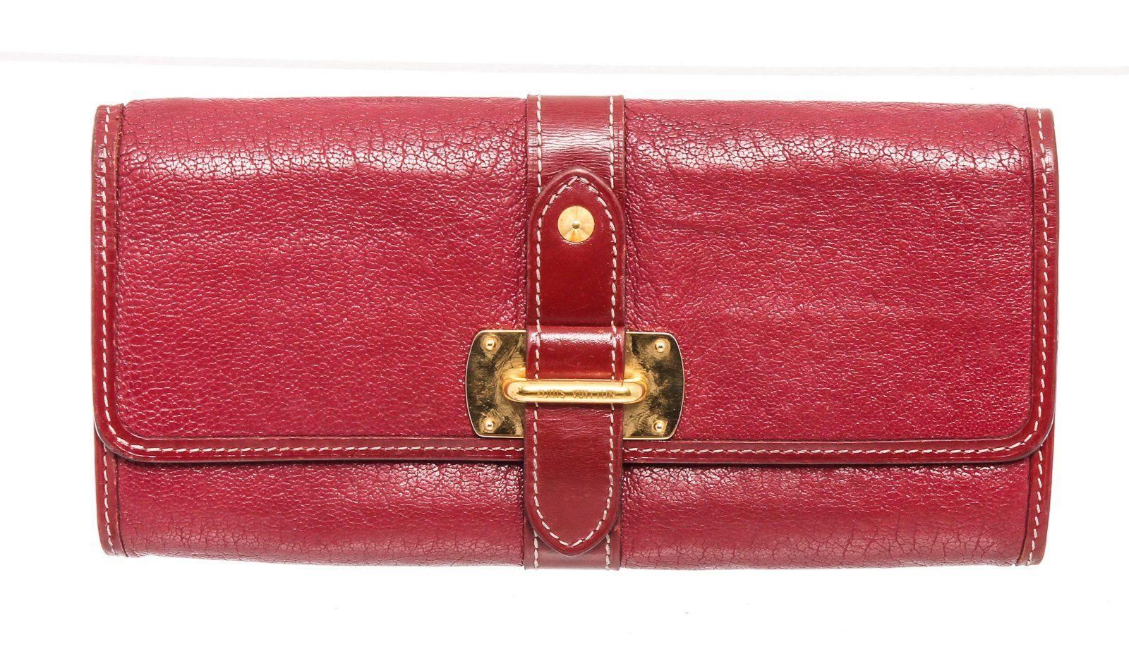 Crimson Suhali leather Louis Vuitton Le Favori wallet with brass hardware, zip pocket at back, six card slots at flap underside, creme contrast stitching throughout, tonal leather lining, three interior compartments; one with zip closure, dual bill compartments at interior walls, eight card slots and snap closure at front flap featuring logo accent. Measurements: Length: 8.25 in / 21 cm Width: 1 in / 3 cm 5.25 in / 13 cm Condition: Pre-Owned Good overall, please see photographs for detail.