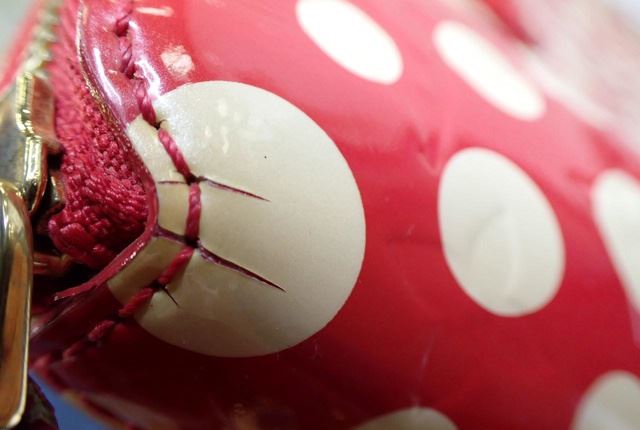 One Louis Vuitton Red Vernis Dot Leather Yayoi Kusama Lockit Vertical MM Satchel Bag. Item is sold AS-IS. All available information is listed in the description and shown in the photo. Red monogram Vernis leather with Yayoi Kusama's polka dot print Louis Vuitton Lockit Vertical MM satchel bag with gold-tone hardware, dual rolled handles, red printed canvas lining & three interior pockets, zip closure at top and protective feet at base. Height: 11.5" Width: 15" Depth: 6.5" Handle Drop: 4"