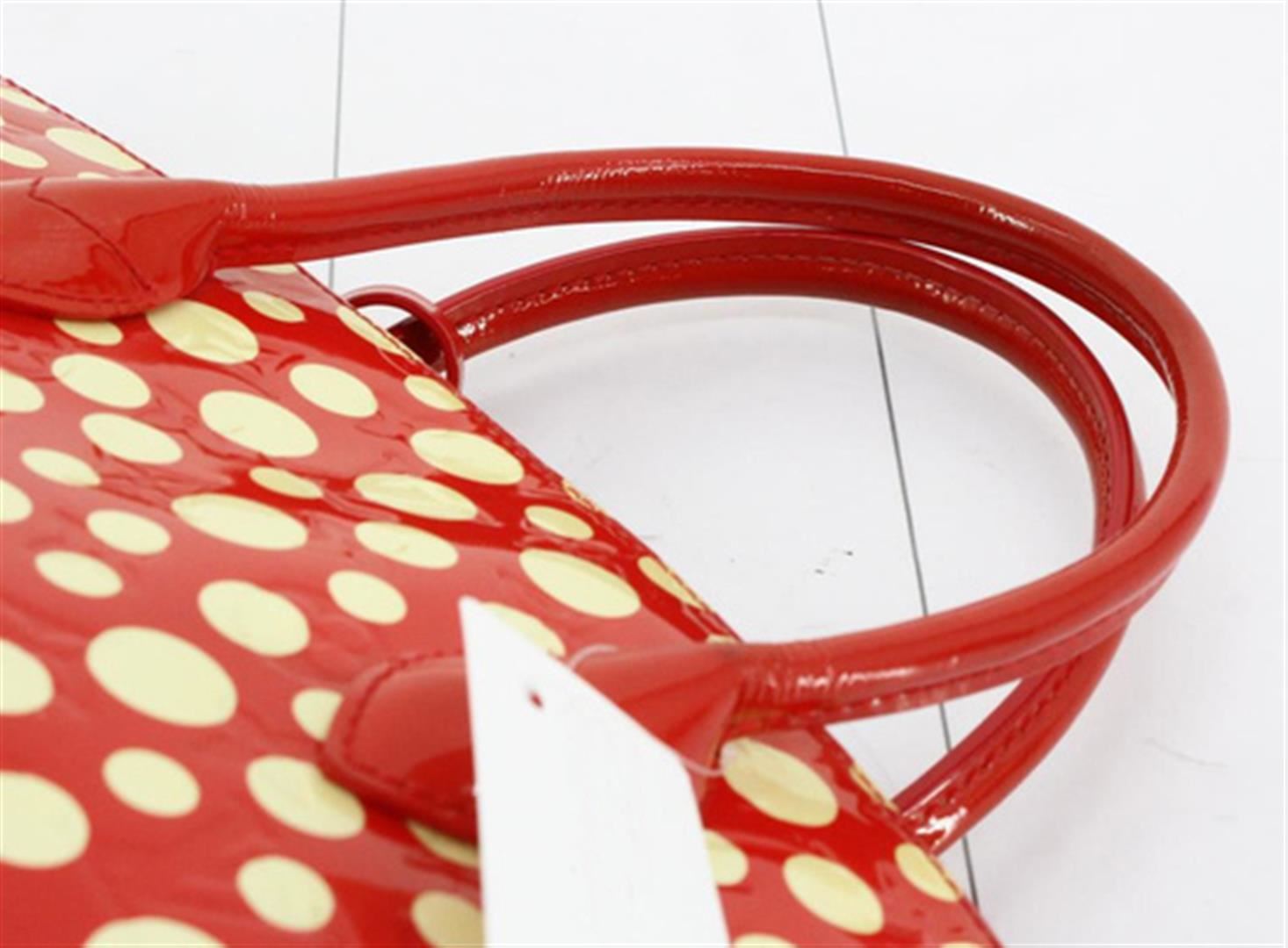 One Louis Vuitton Red Vernis Dot Leather Yayoi Kusama Lockit Vertical MM Satchel Bag. Item is sold AS-IS. All available information is listed in the description and shown in the photo. Red monogram Vernis leather with Yayoi Kusama's polka dot print Louis Vuitton Lockit Vertical MM satchel bag with gold-tone hardware, dual rolled handles, red printed canvas lining & three interior pockets, zip closure at top and protective feet at base. Height: 11.5" Width: 15" Depth: 6.5" Handle Drop: 4"