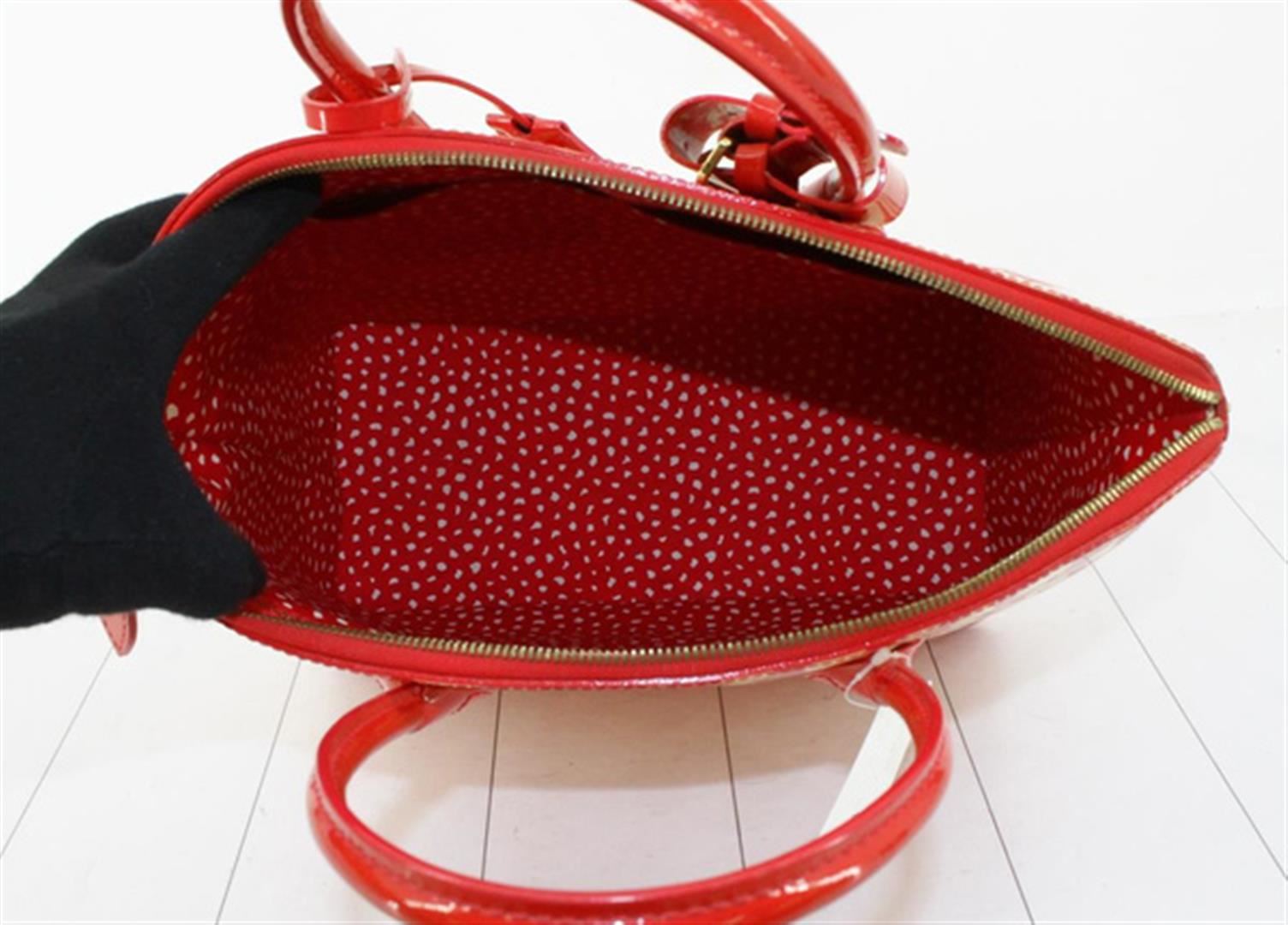 One Louis Vuitton Red Vernis Dot Leather Yayoi Kusama Lockit Vertical MM Satchel Bag. Item is sold AS-IS. All available information is listed in the description and shown in the photo. Red monogram Vernis leather with Yayoi Kusama's polka dot print Louis Vuitton Lockit Vertical MM satchel bag with gold-tone hardware, dual rolled handles, red printed canvas lining & three interior pockets, zip closure at top and protective feet at base. Height: 11.5" Width: 15" Depth: 6.5" Handle Drop: 4"