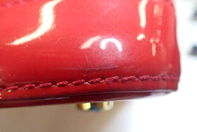 One Louis Vuitton Red Vernis Dot Leather Yayoi Kusama Lockit Vertical MM Satchel Bag. Item is sold AS-IS. All available information is listed in the description and shown in the photo. Red monogram Vernis leather with Yayoi Kusama's polka dot print Louis Vuitton Lockit Vertical MM satchel bag with gold-tone hardware, dual rolled handles, red printed canvas lining & three interior pockets, zip closure at top and protective feet at base. Height: 11.5" Width: 15" Depth: 6.5" Handle Drop: 4"