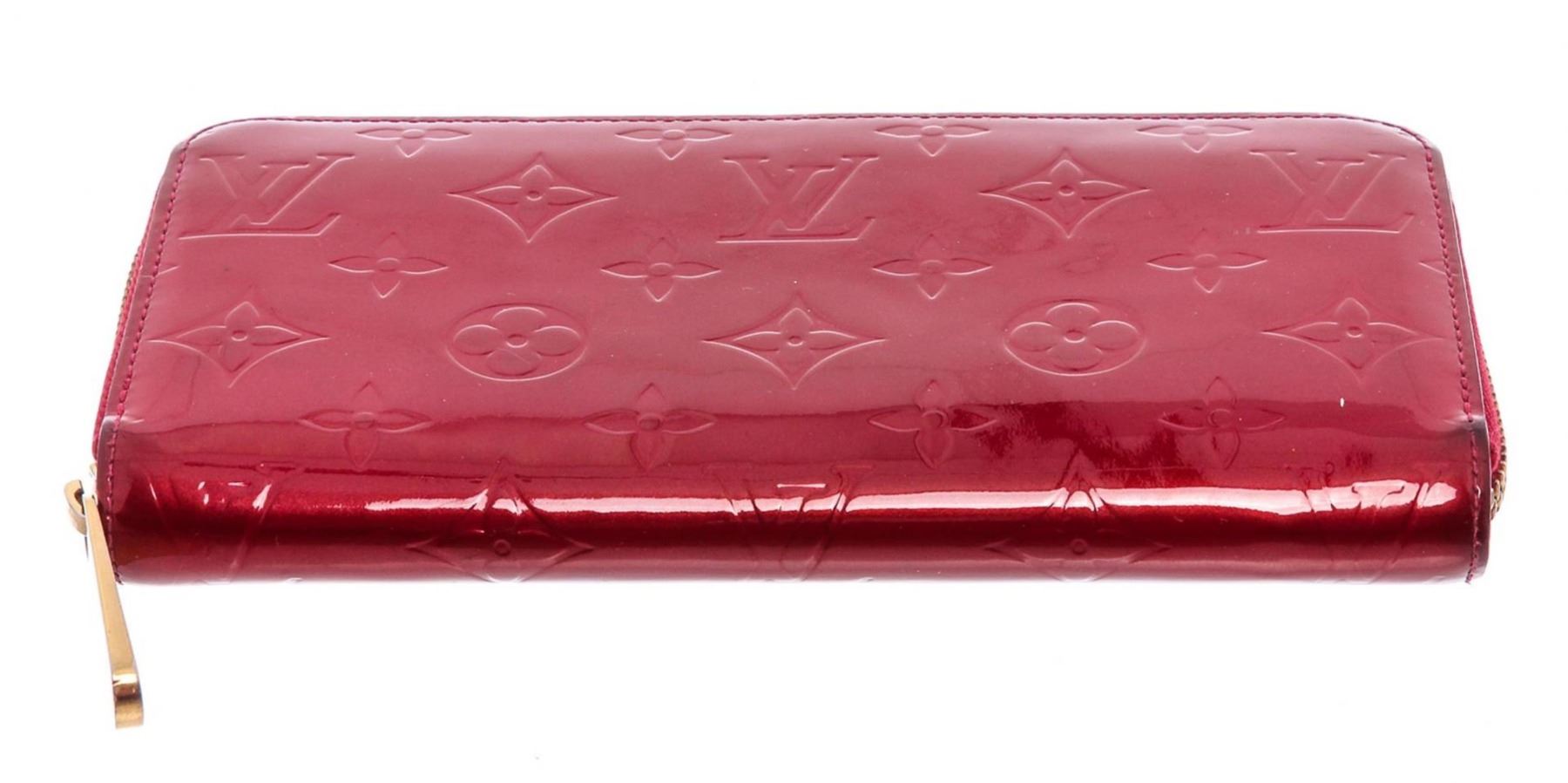 One Louis Vuitton Red Vernis Leather Monogram Zippy Wallet. Monogram Vernis leather Louis Vuitton Zippy wallet with brass hardware, tonal leather lining, four interior compartments; one with zip closure, three bill compartments, eight card slots and zip-around closure.