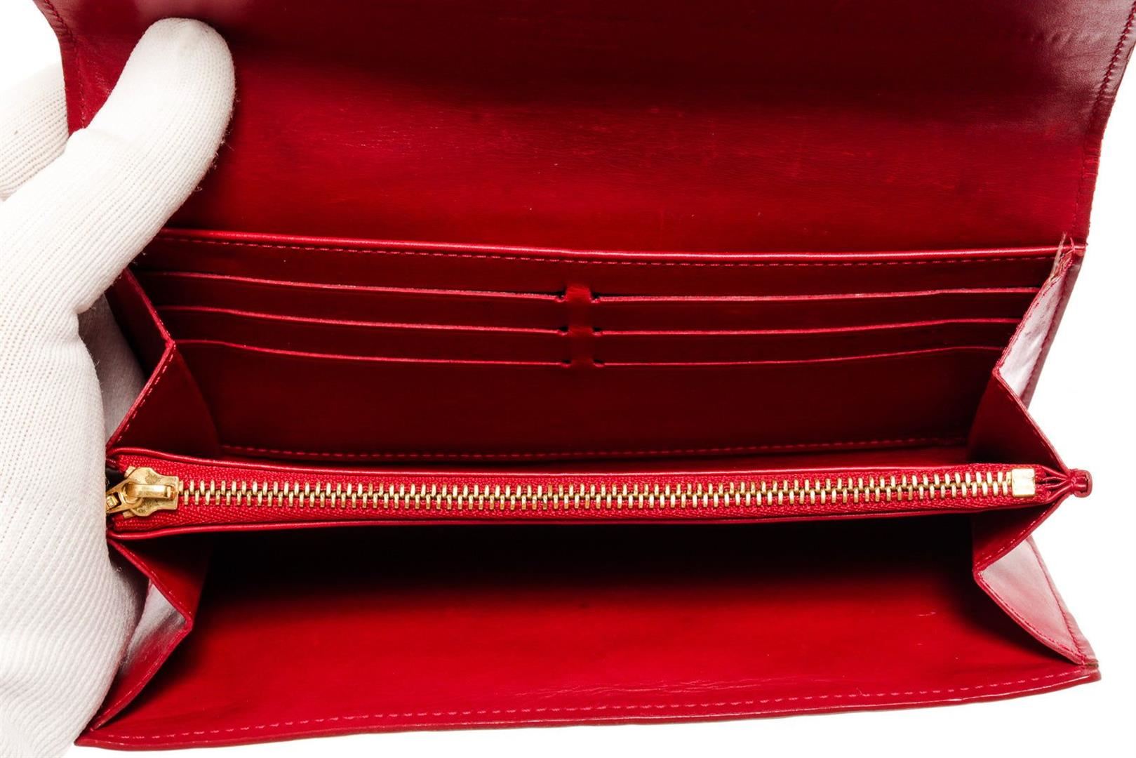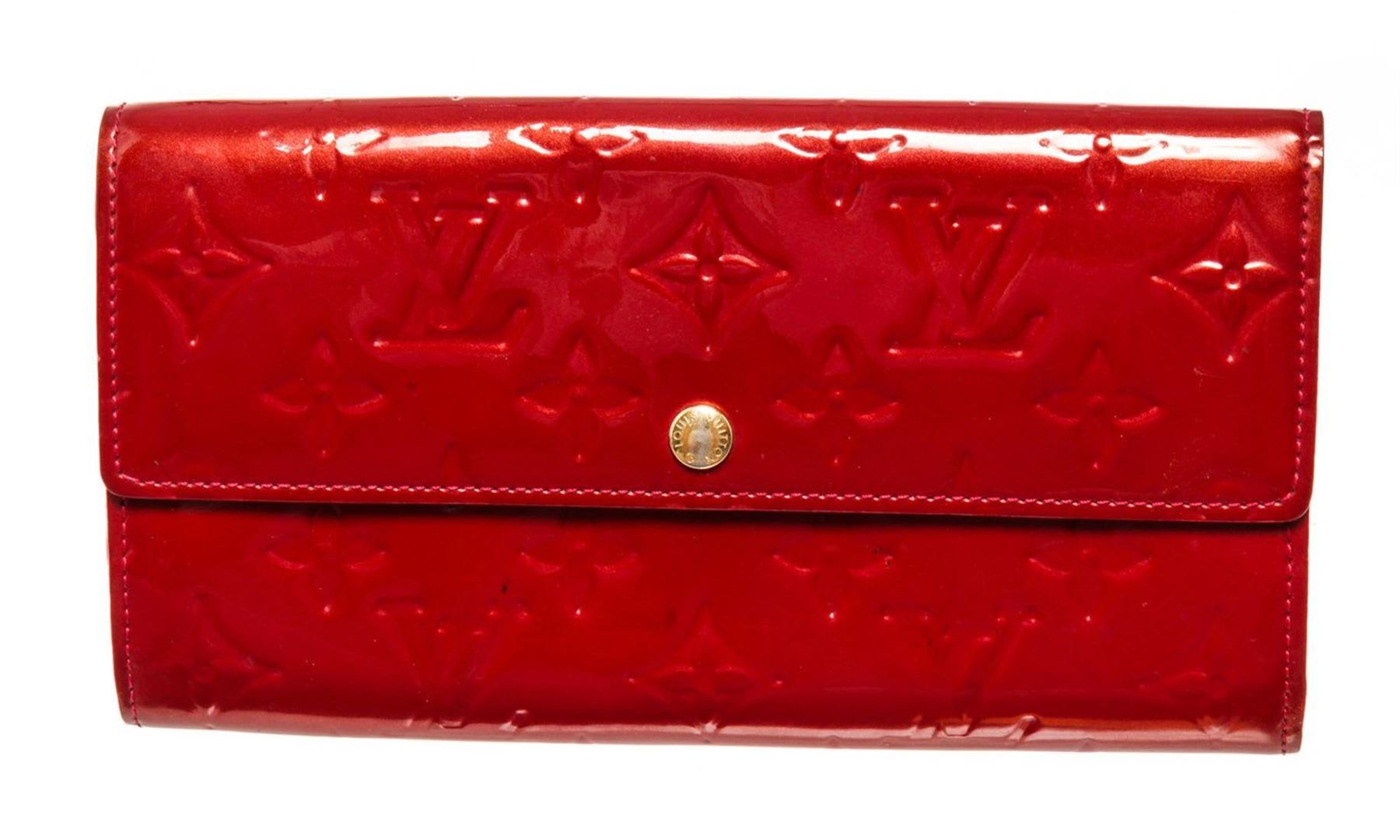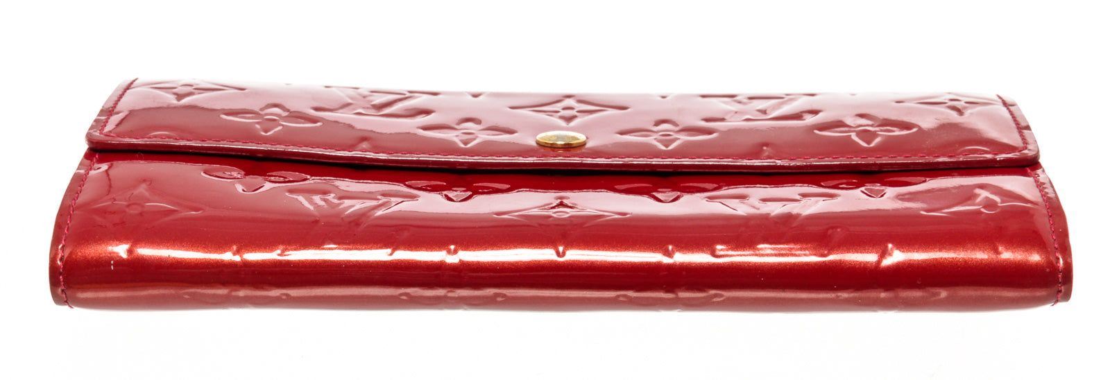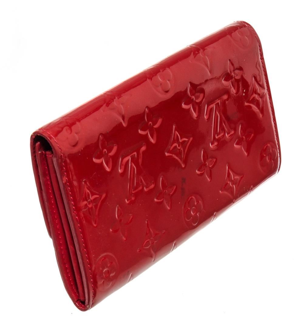 Louis Vuitton Red Vernis Leather Sarah Wallet with red Vernis with Monogram leather, gold-tone hardware, three interior compartments pockets, vachetta leather trim and snap closure.