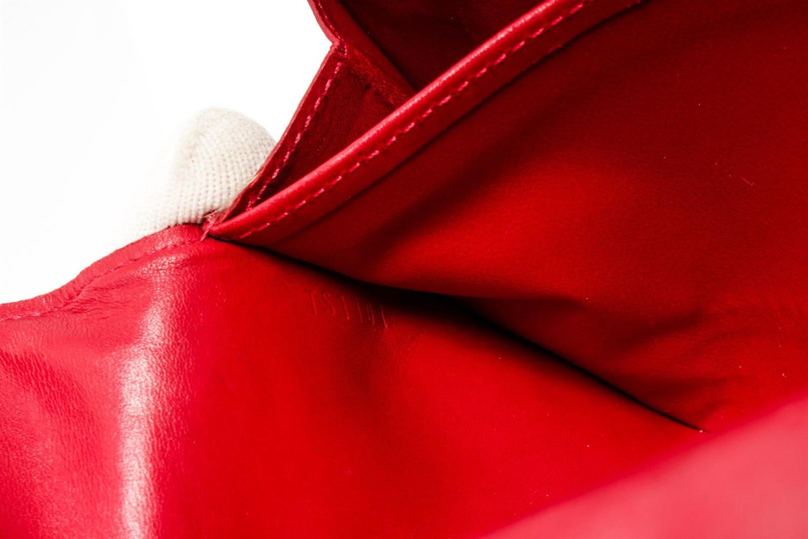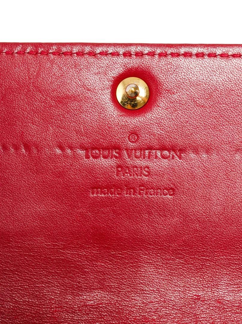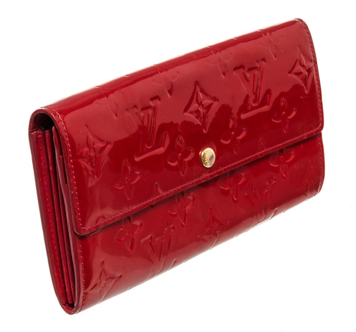 Louis Vuitton Red Vernis Leather Sarah Wallet with red Vernis with Monogram leather, gold-tone hardware, three interior compartments pockets, vachetta leather trim and snap closure.