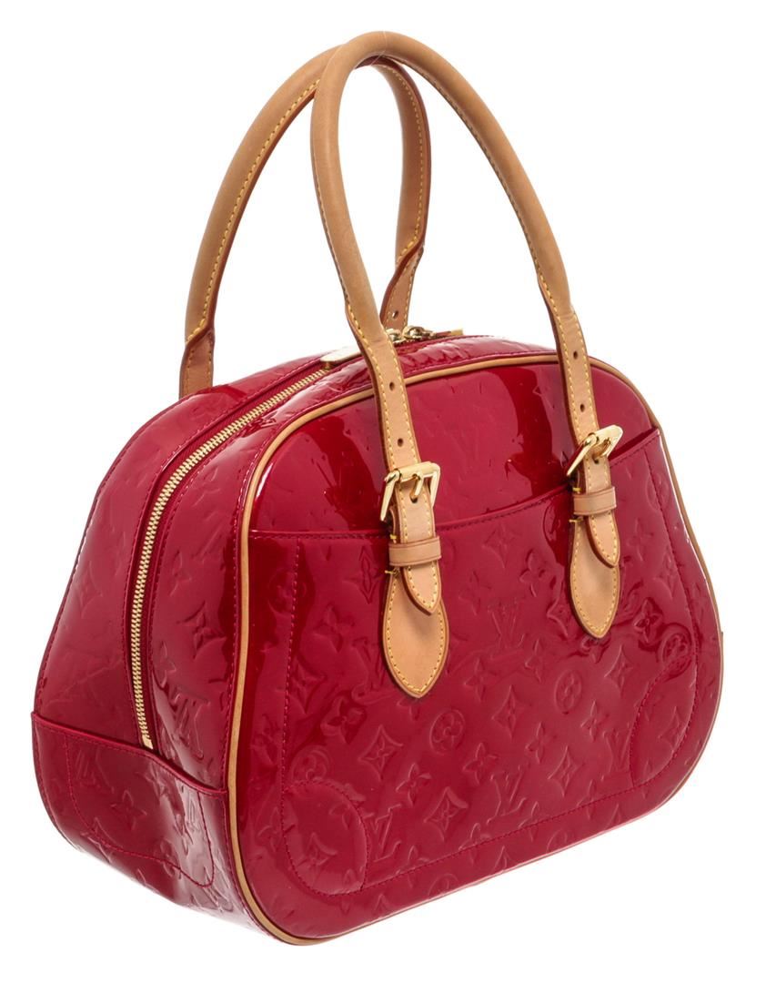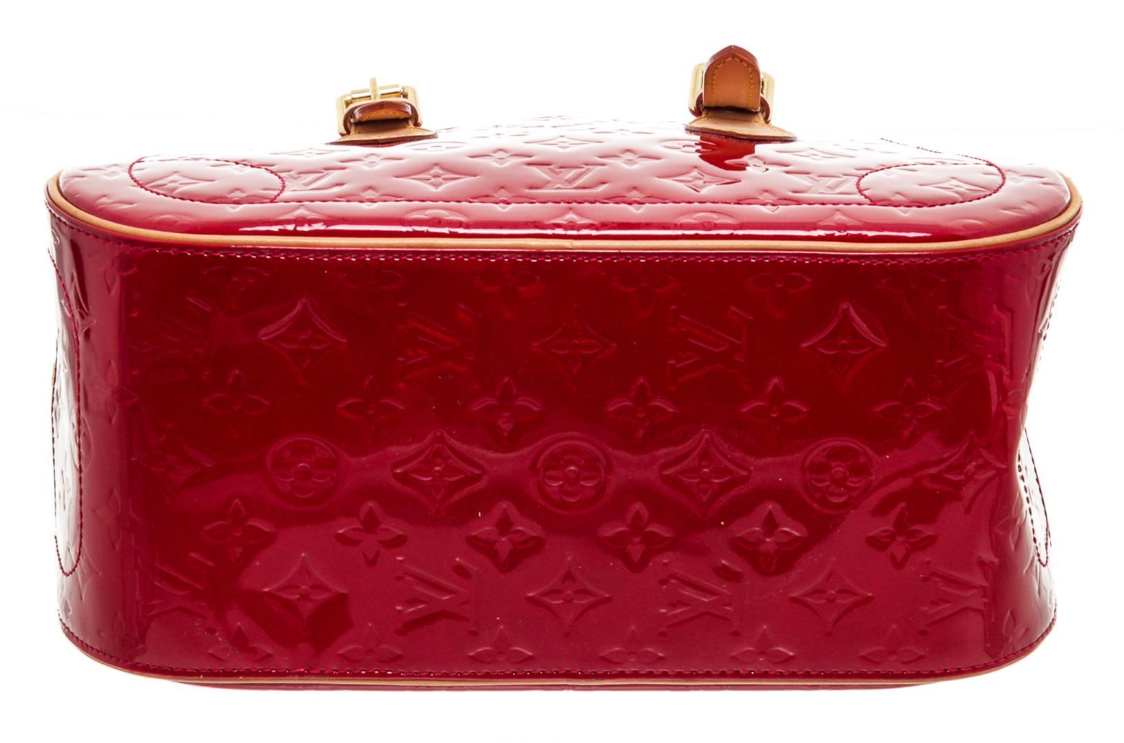 Red Vernis monogram leather Louis Vuitton Summit Drive bag with brass hardware, tan vachetta leather trim, dual exterior slip pockets, tonal woven lining, dual slip pockets at interior wall and two-way zip closure at top. Authentic.