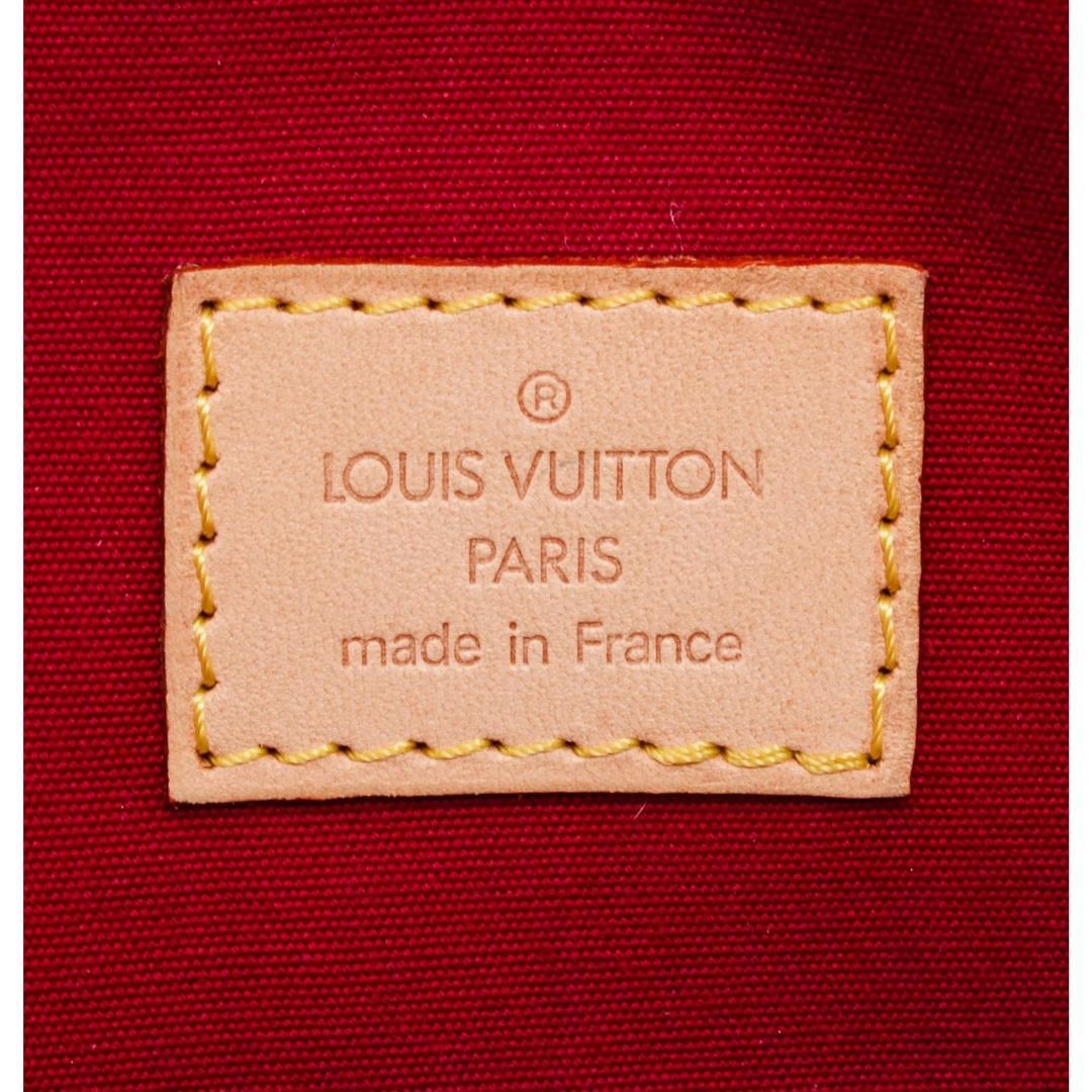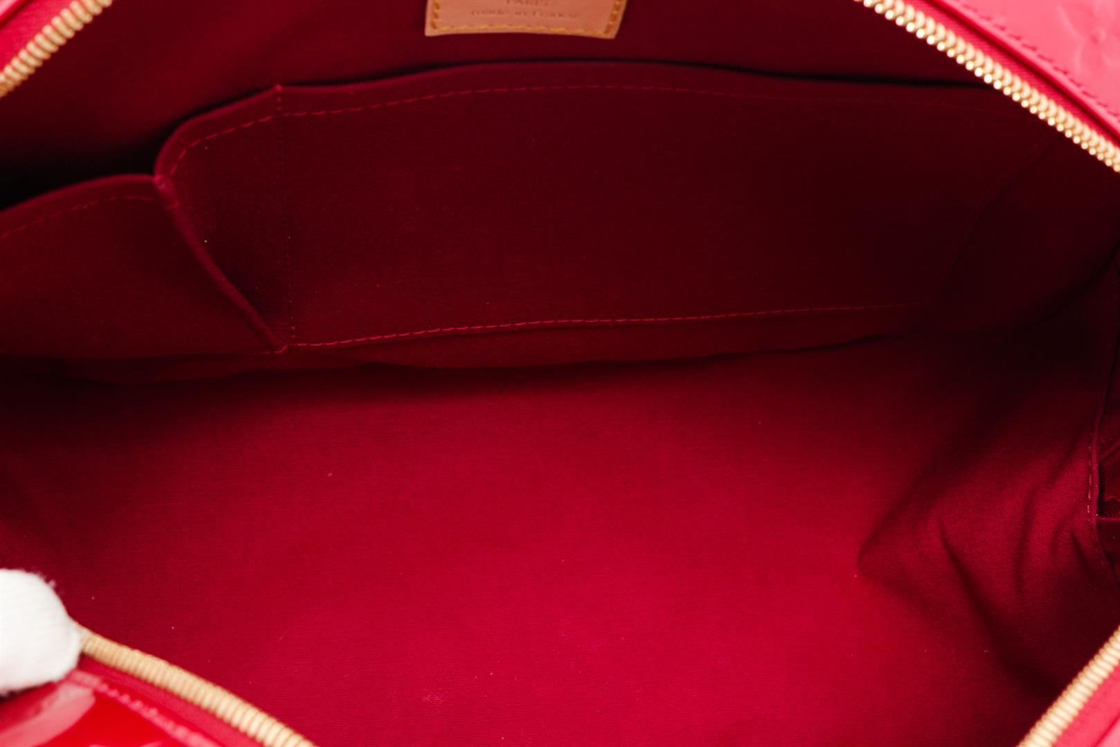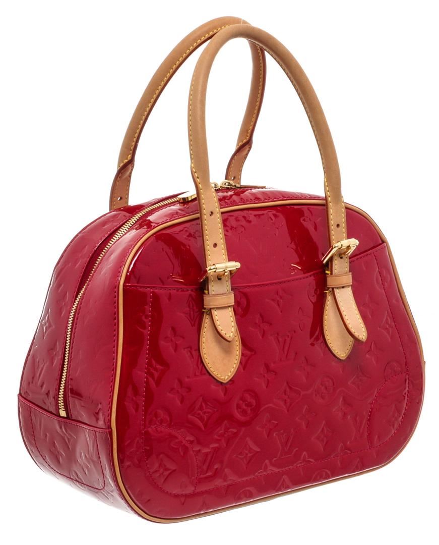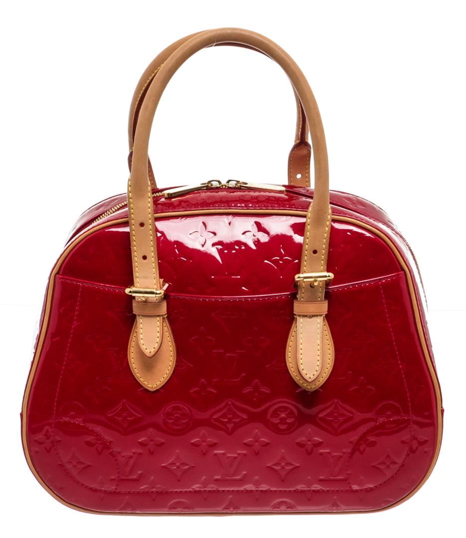 Red Vernis monogram leather Louis Vuitton Summit Drive bag with brass hardware, tan vachetta leather trim, dual exterior slip pockets, tonal woven lining, dual slip pockets at interior wall and two-way zip closure at top. Authentic.