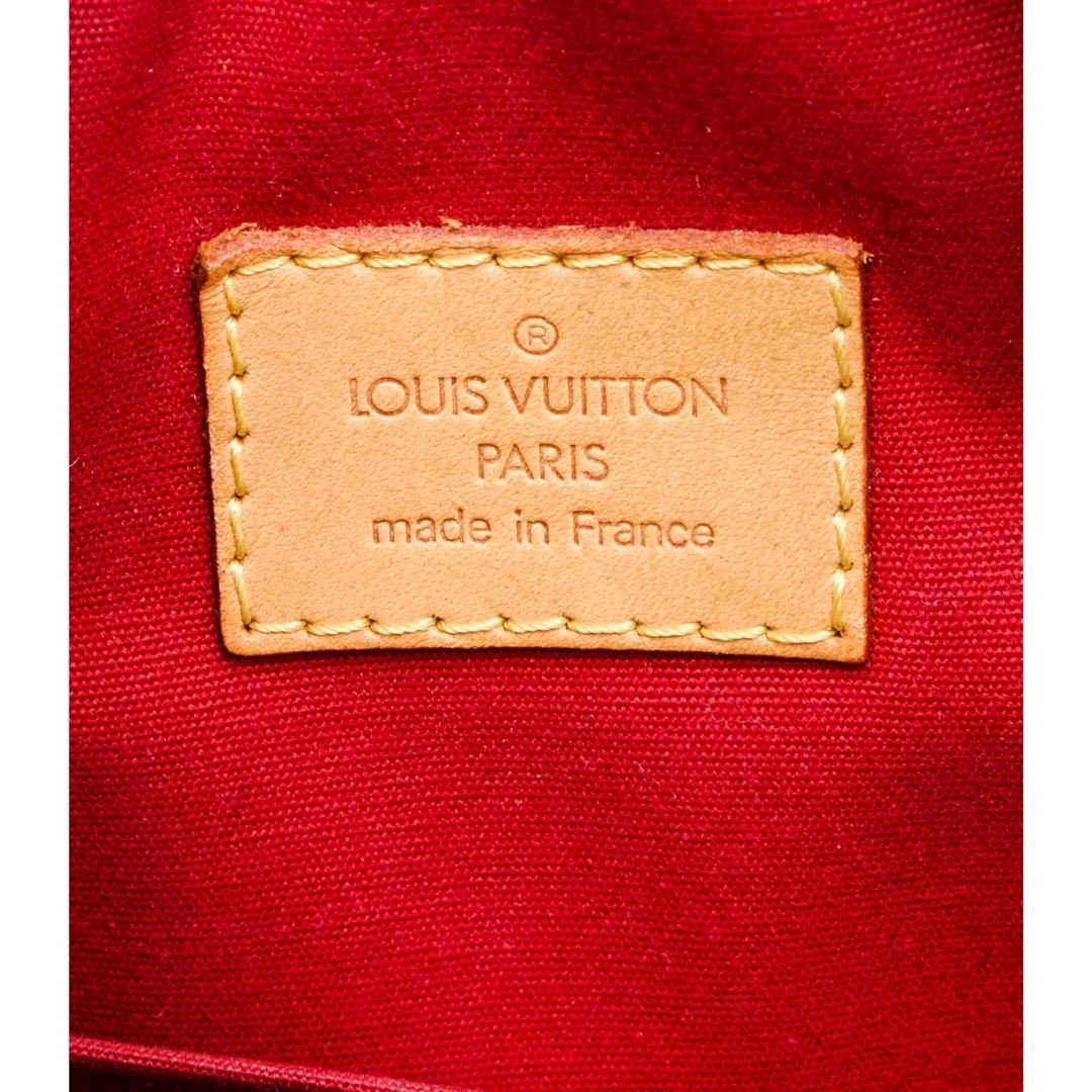 Red Vernis monogram leather Louis Vuitton Summit Drive bag with brass hardware, tan vachetta leather trim, dual exterior slip pockets, tonal woven lining, dual slip pockets at interior wall and two-way zip closure at top. Authentic.