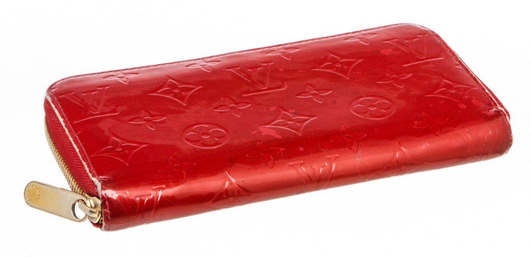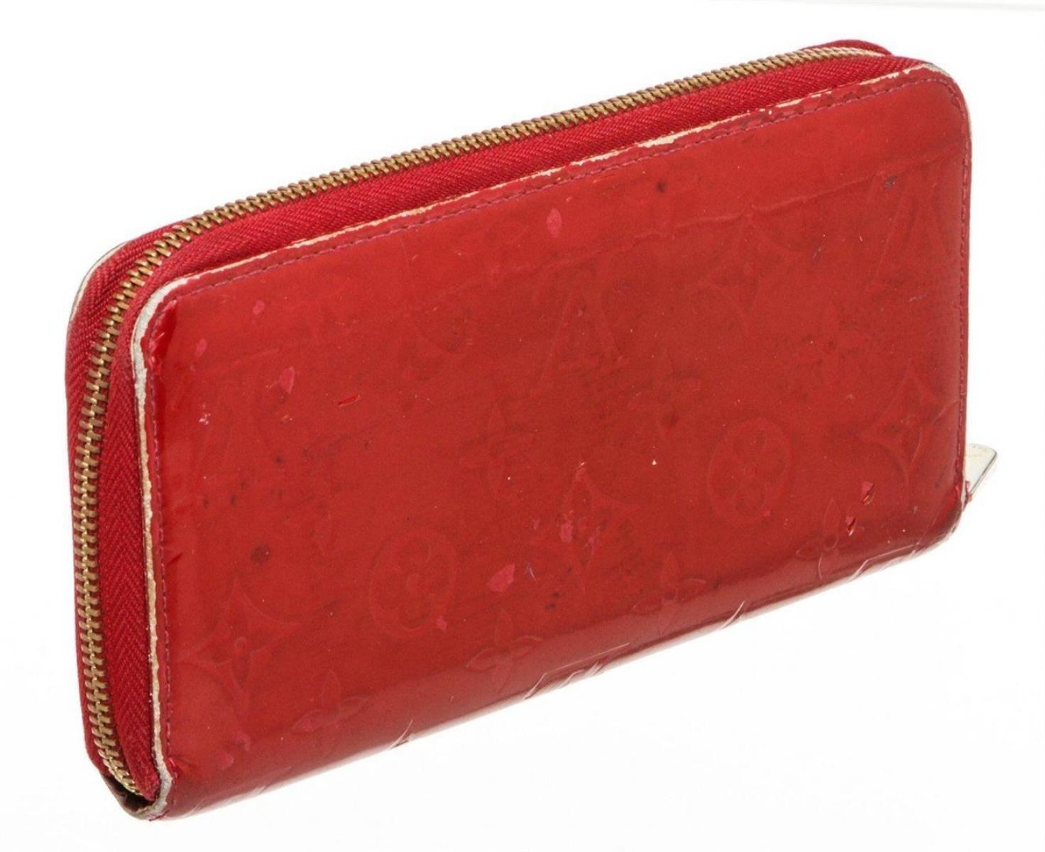 Red Vernis leather Louis Vuitton Zippy wallet with gold-tone hardware, tonal leather lining, four interior compartments; one with zip closure, three bill compartments, eight card slots and zip-around closure. Measurements: Length: 8 in / 20 cm Width: 1 in / 3 cm 4 in / 10 cm Condition: Pre-Owned Good overall, please see photographs for detail.