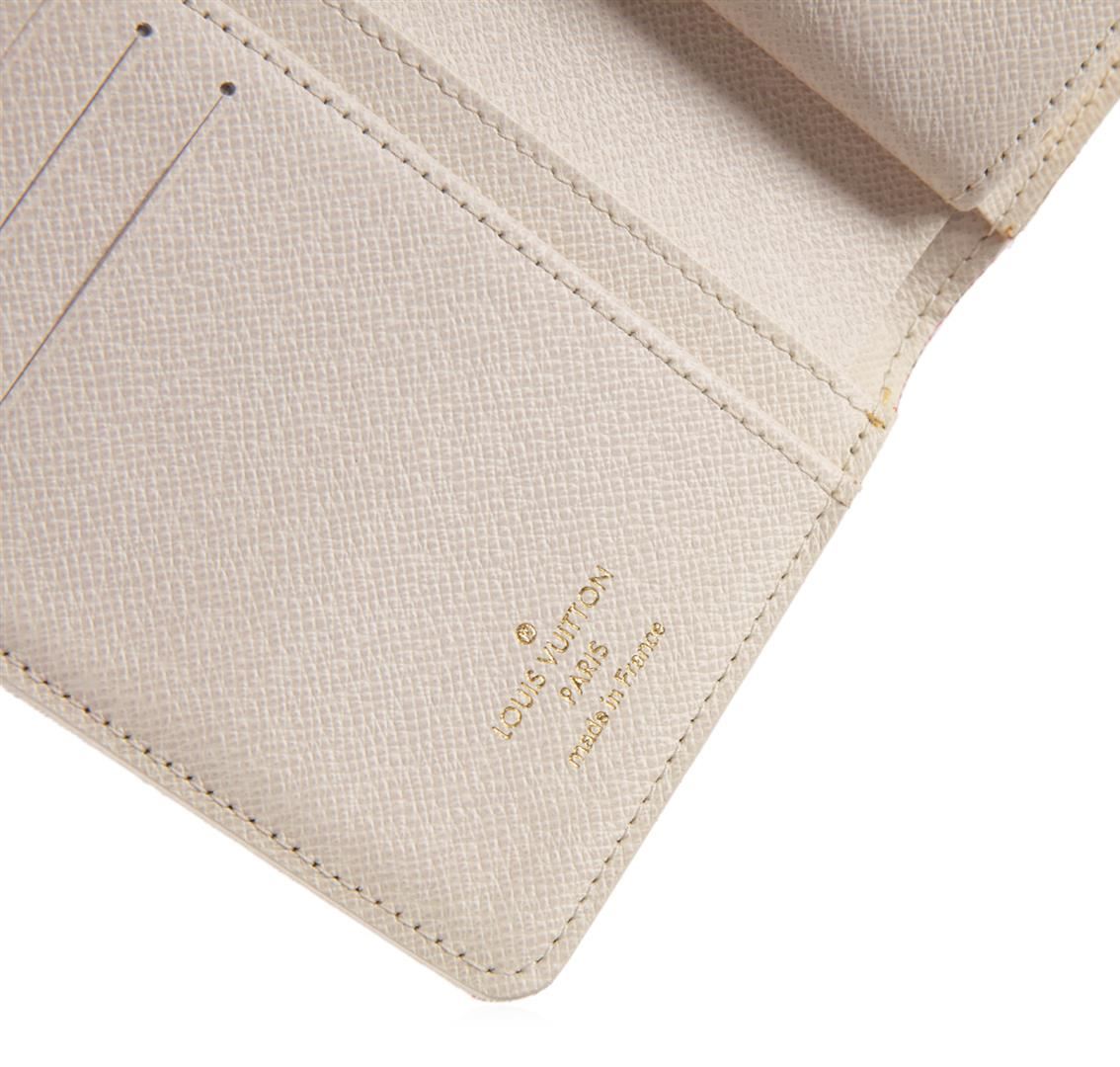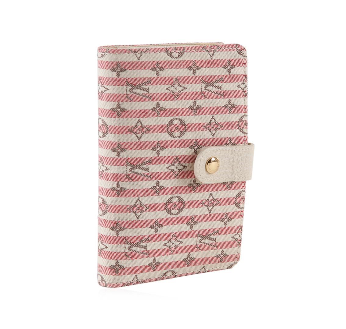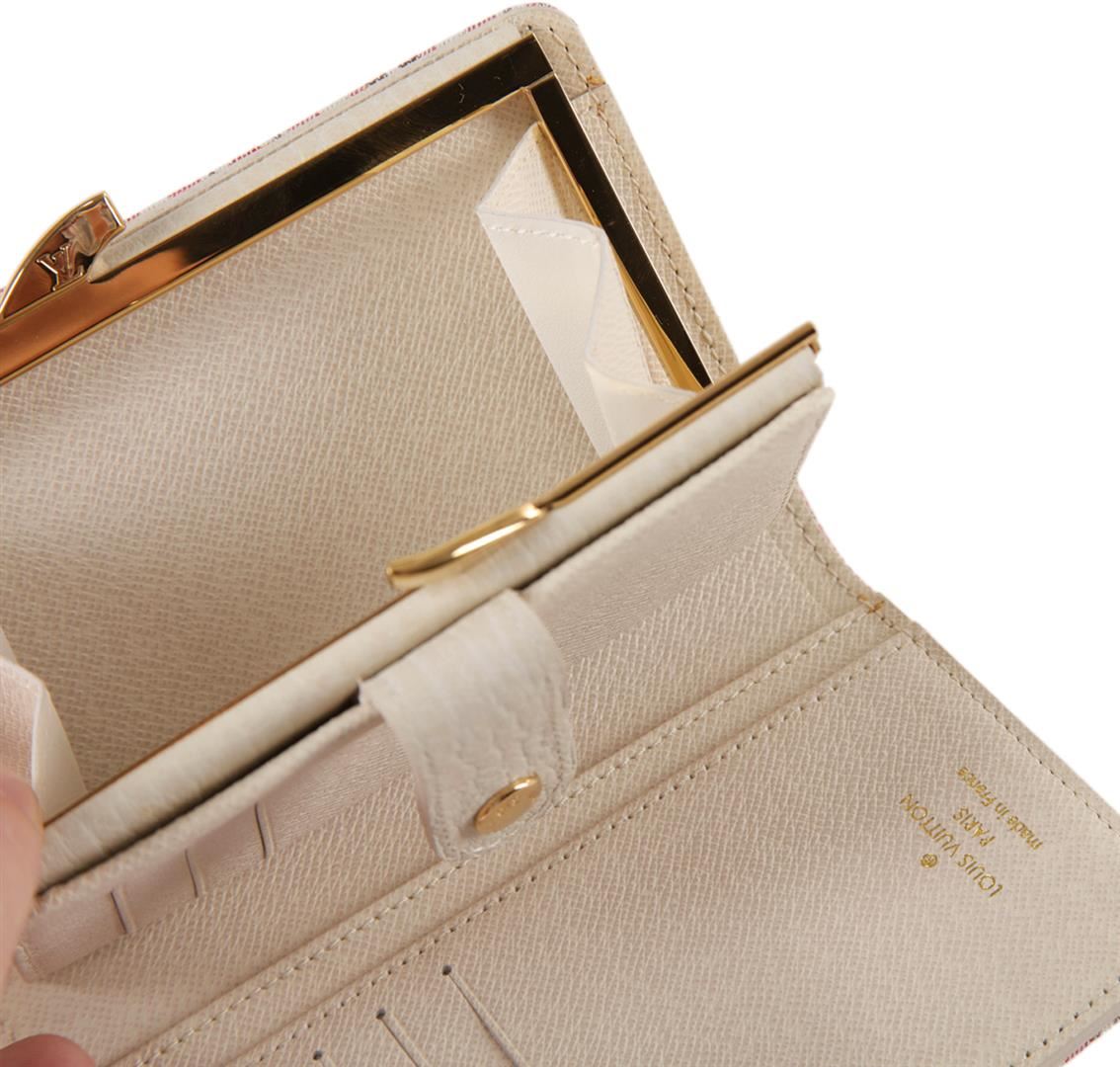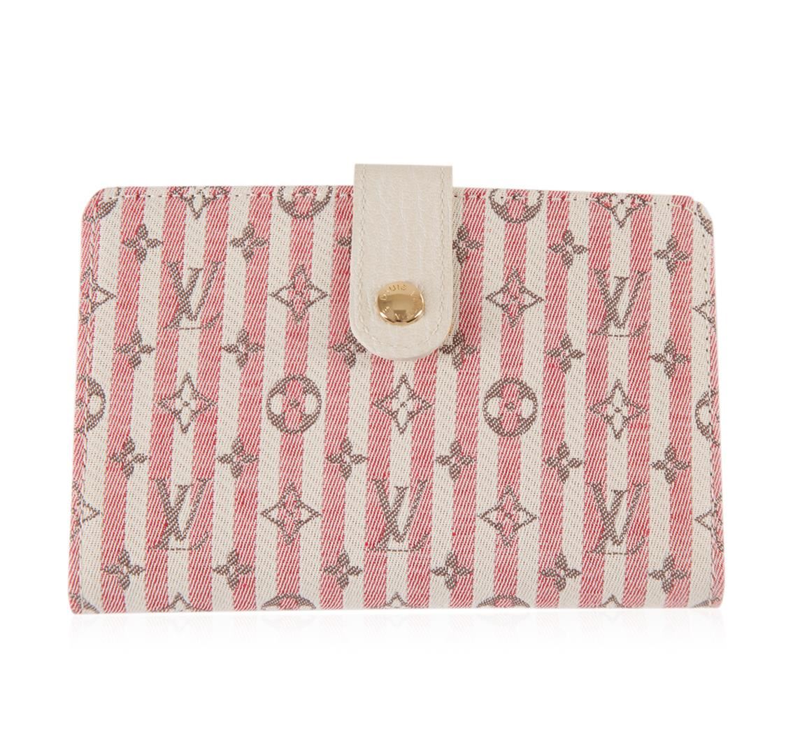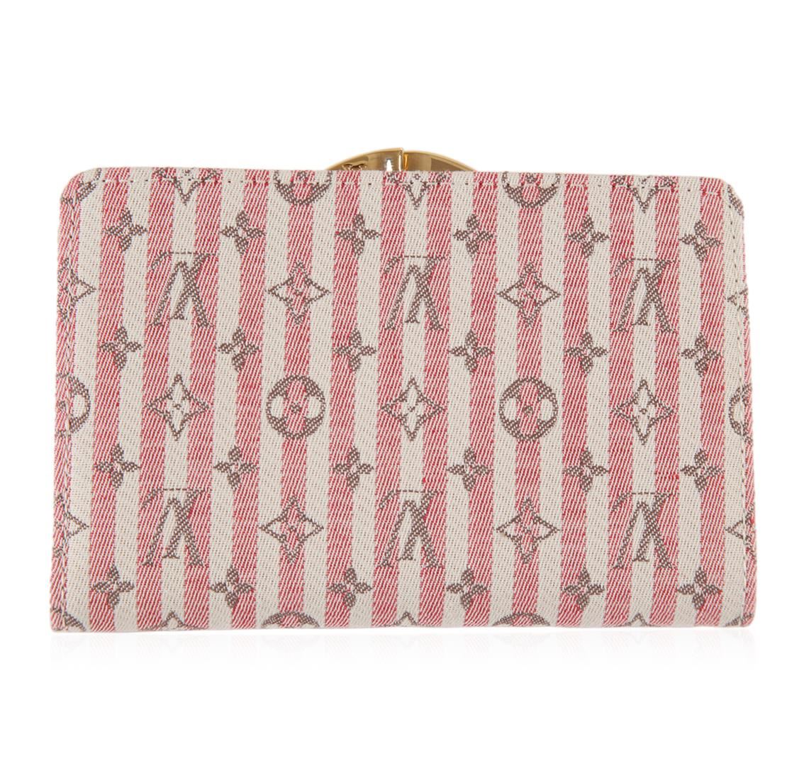 One Louis Vuitton red and white striped monogram wallet in good condition, measuring approximately 5.5 inches wide by 3.5 inches tall. Minor blemish on the clasp. The wallet features an internal pouch, two slots for bills and eight slots for cards. Comes with a Louis Vuitton cover bag.