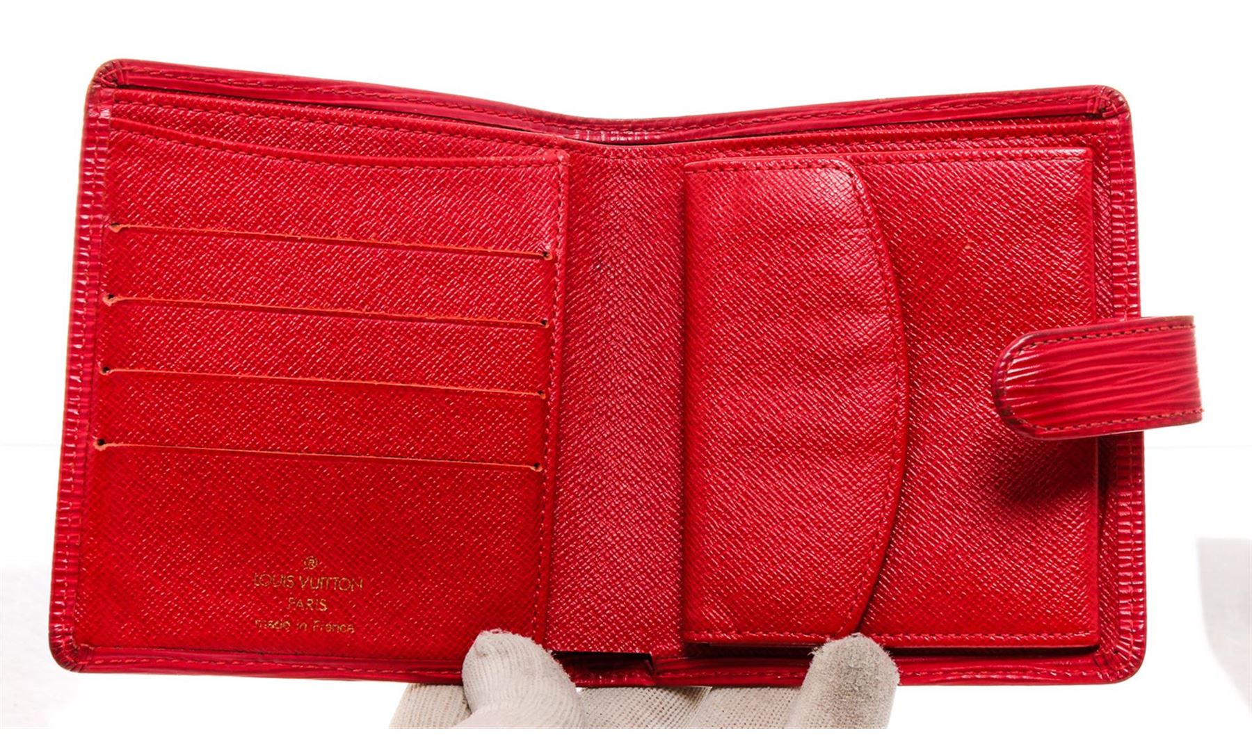 One Louis Vuitton Rouge Epi Leather Porte Billet Compact Wallet. Rouge Epi leather Louis Vuitton Epi Porte Billets compact wallet with brass hardware, embossed logo at front, tonal leather lining, four card slots at interior walls, dual slip pockets, single flap coin compartment, single bill compartment and snap closure at side strap.