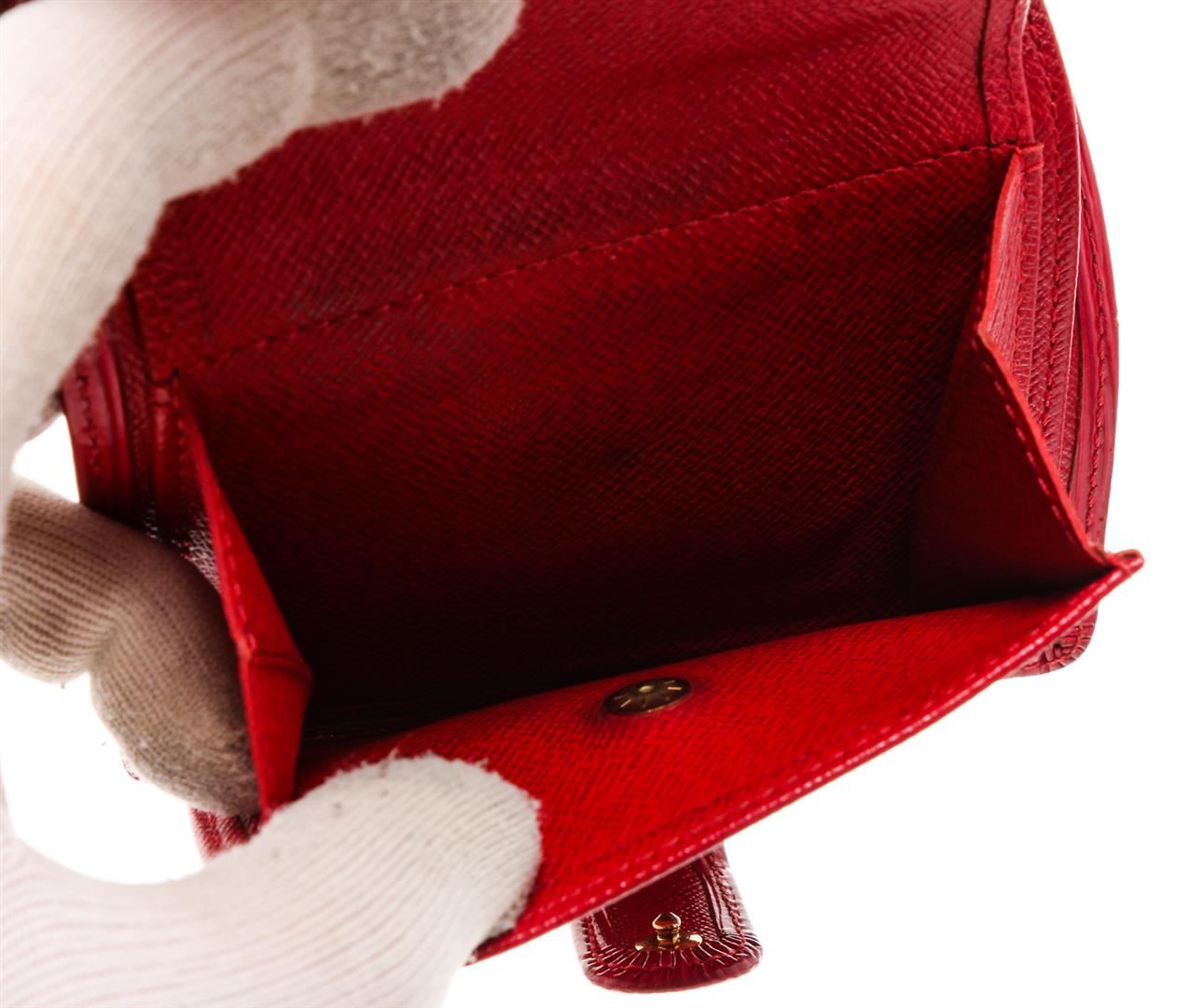 Rouge Epi leather Louis Vuitton Epi Porte Billets compact wallet with brass hardware, embossed logo at front, tonal leather lining, four card slots at interior walls, dual slip pockets, single flap coin compartment, single bill compartment and snap closure at side strap.