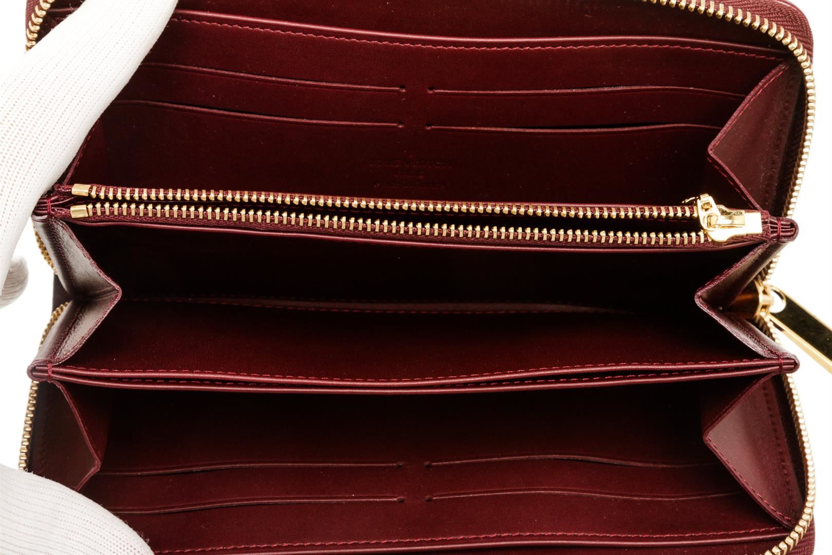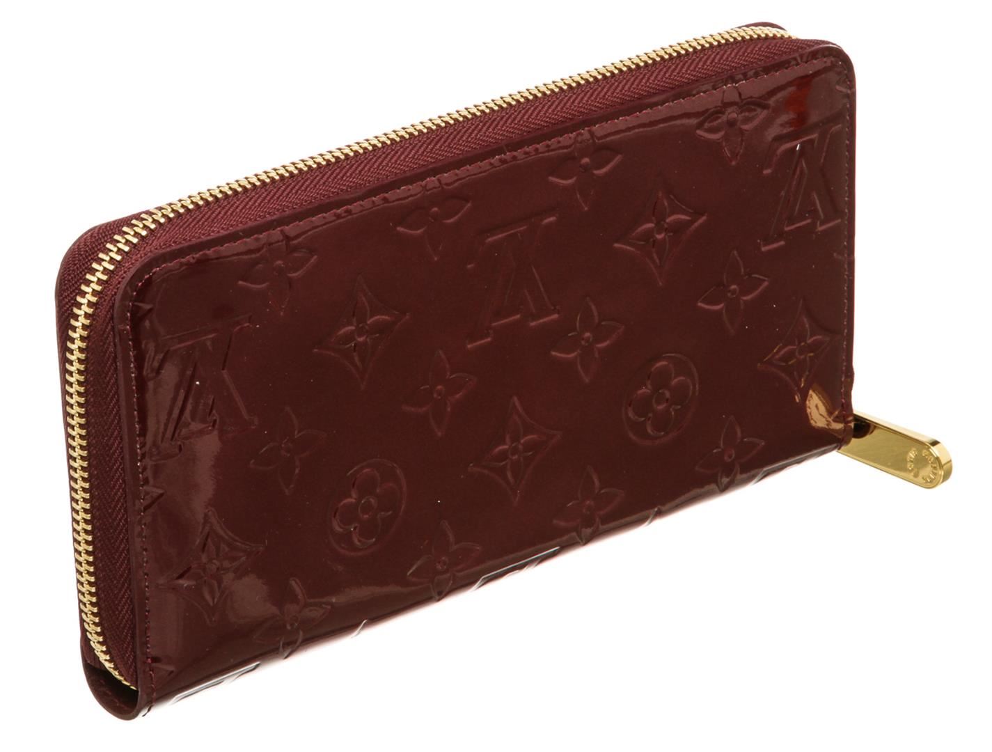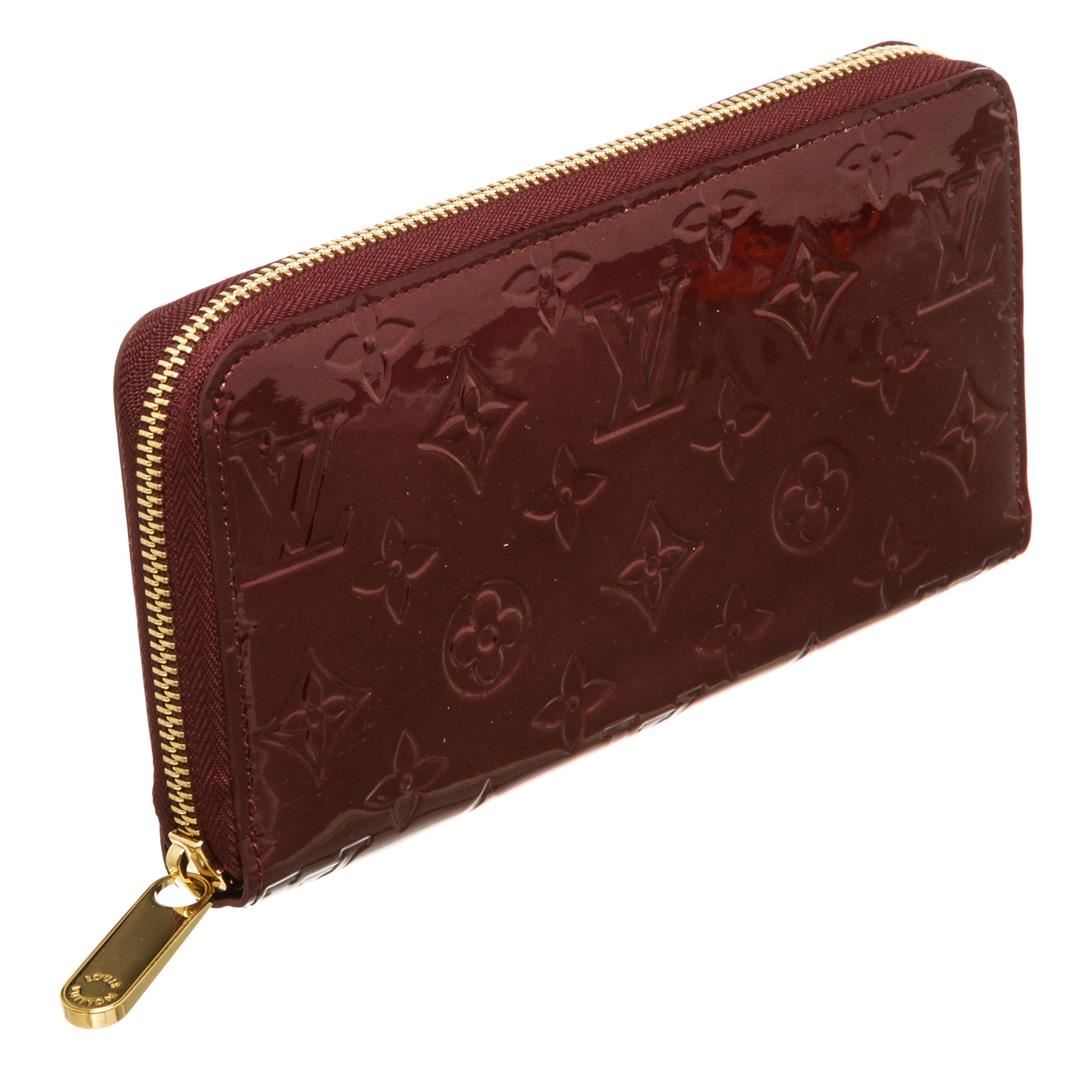 Rouge Monogram Vernis leather Louis Vuitton Zippy wallet with brass hardware, tonal leather lining, four interior compartments; one with zip closure, three bill compartments, eight card slots and zip-around closure. Authentic.