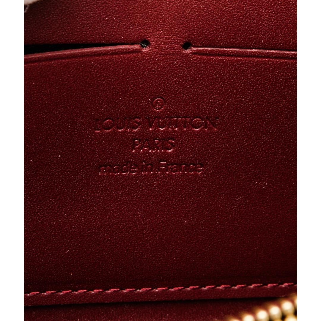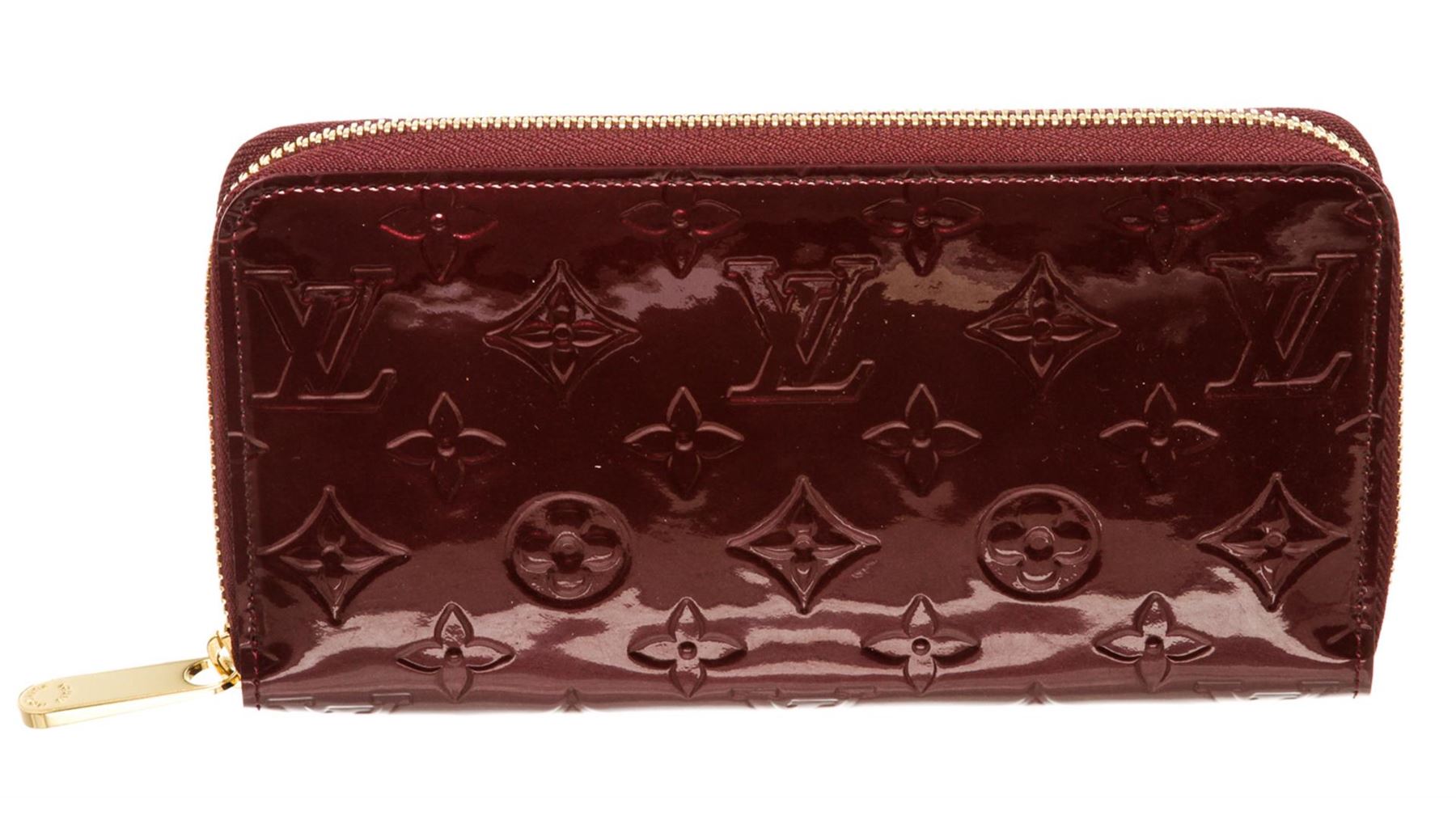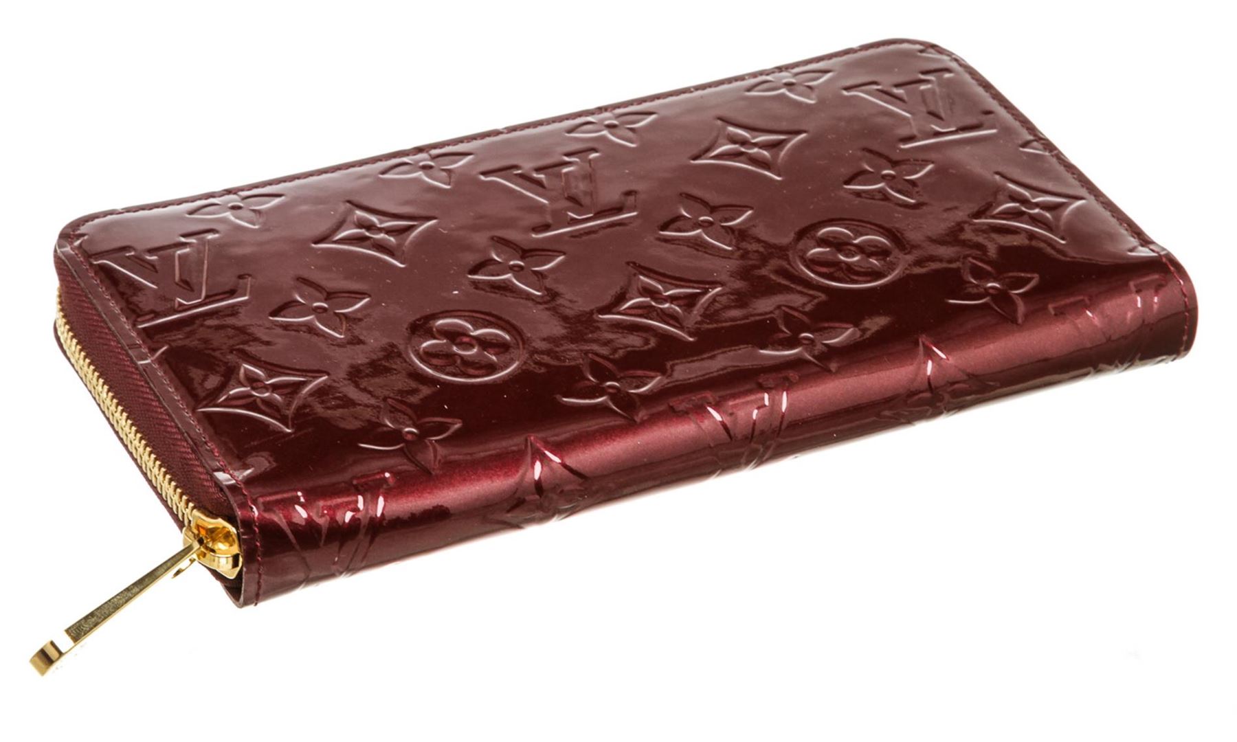 Rouge Monogram Vernis leather Louis Vuitton Zippy wallet with brass hardware, tonal leather lining, four interior compartments; one with zip closure, three bill compartments, eight card slots and zip-around closure. Authentic.