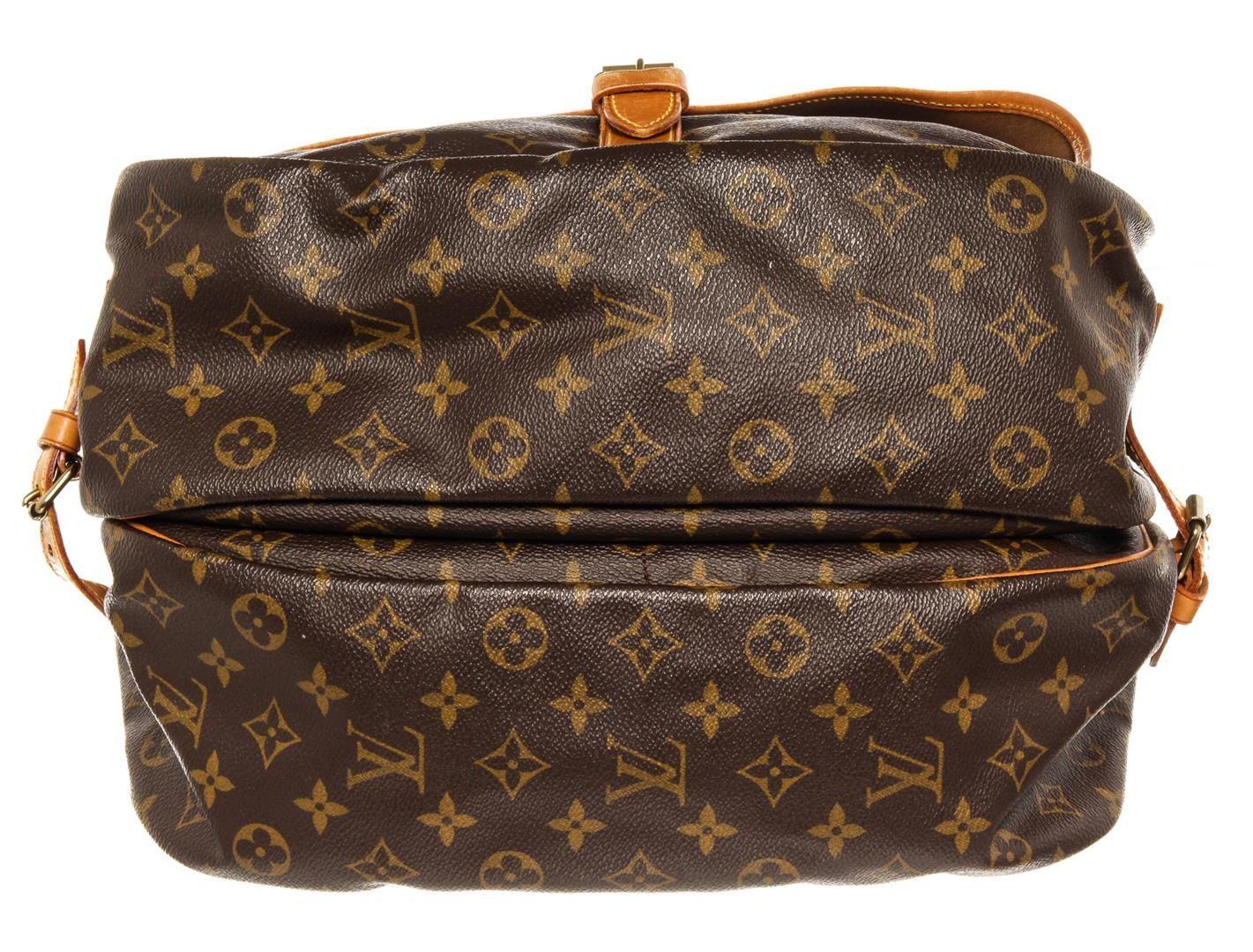 One Louis Vuitton Saumur 35cm. Item is sold AS-IS. All available information is listed in the description and shown in the photo. Brown and tan monogram coated canvas Louis Vuitton Saumur 35 with gold-tone hardware, tan vachetta leather trim, single adjustable flat shoulder strap, brown canvas lining, dual compartments, three pockets at interior walls and dual buckle closures at exterior flap.