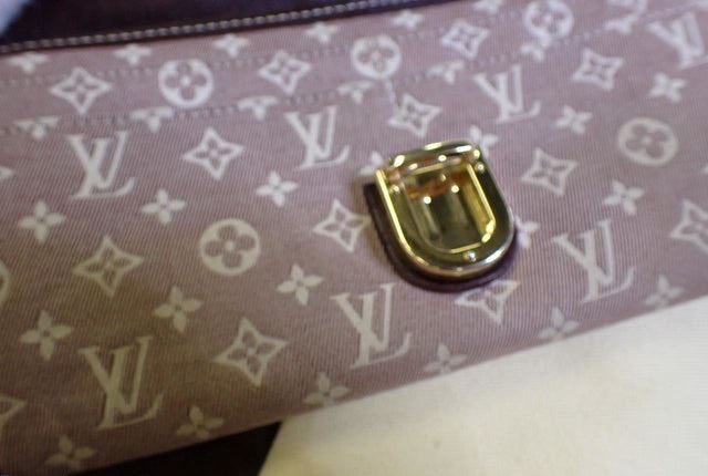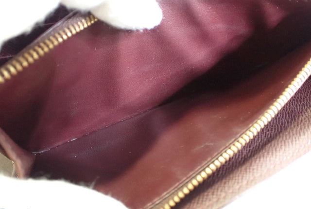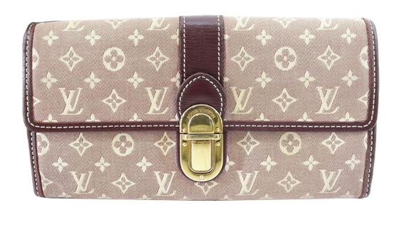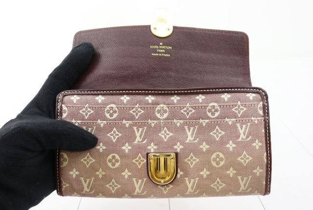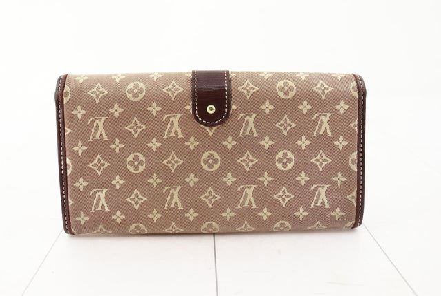Sepia monogram Idylle Canvas Louis Vuitton Sarah Wallet with gold-tone hardware, flap top with push-lock closure, dark brown leather trim, brown cross-grain leather lining, four card slots in front, six card slots inside, one zip pocket, one bill compartm