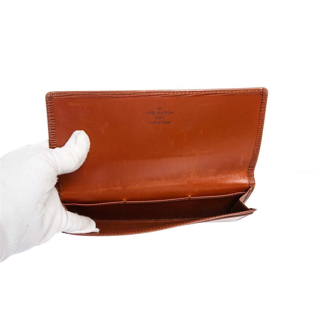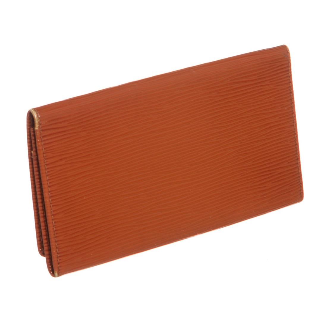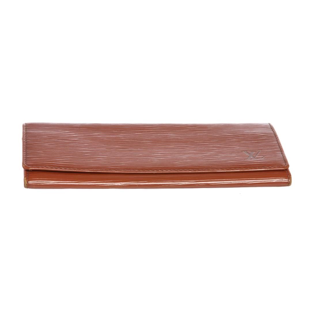 Overall flap closure. Interior contains one bill compartment and three side card slip pockets. Dimensions = 3.75"x7"x0.25". Item is pre-owned.