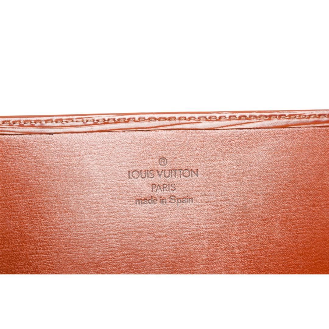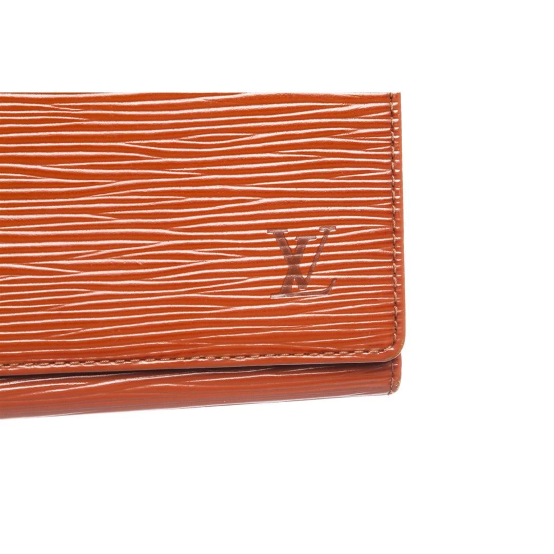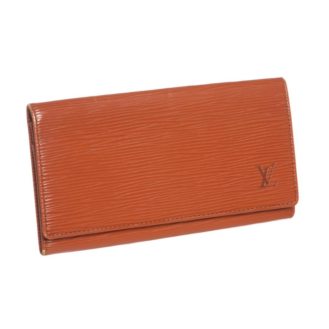 Overall flap closure. Interior contains one bill compartment and three side card slip pockets. Dimensions = 3.75"x7"x0.25". Item is pre-owned.