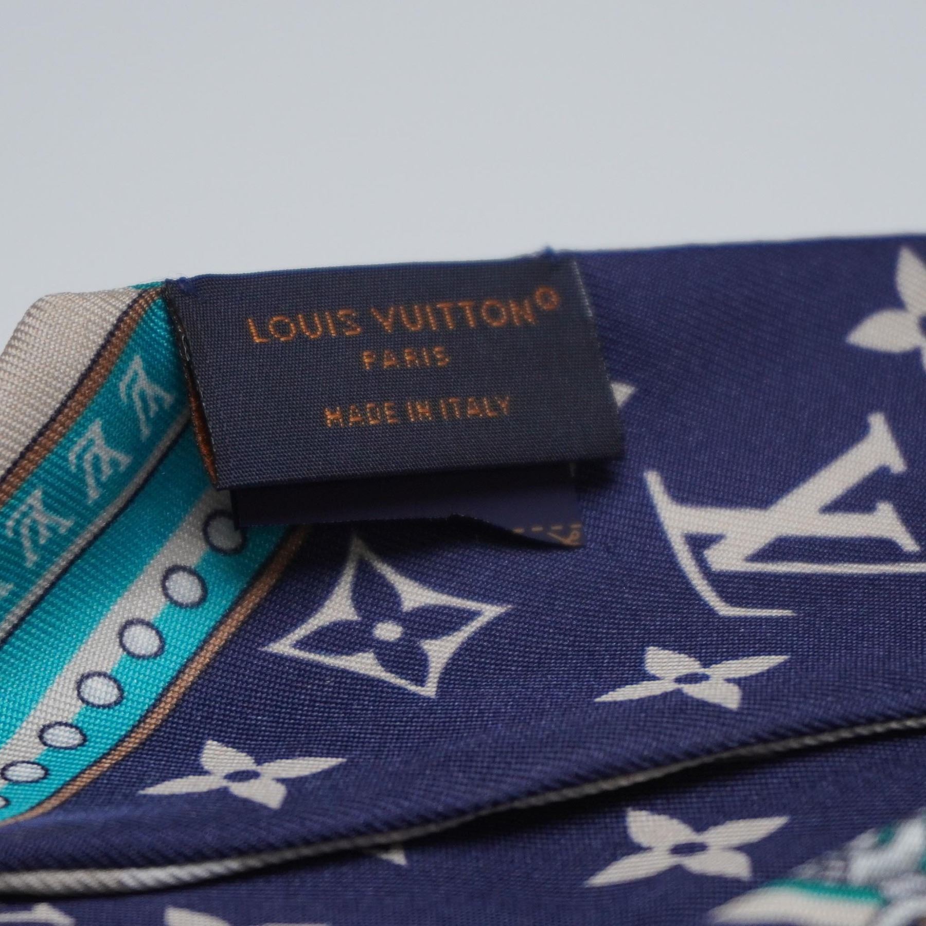 Louis Vuitton designer silk bandeau scarf featuring a reversible motif with oversized LV Monogram symbols on one side and an intricate belt-and-chain pattern on the other. Color palette includes beige, navy, and teal. Measures approx. 46"L. Includes stitched LV tag.
