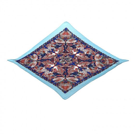 Bleu scarf is 100% silk and features a beautiful design of swans in multicolor with a blue border.