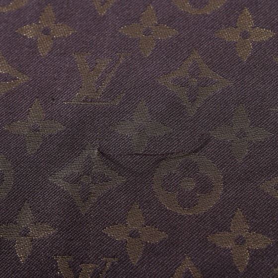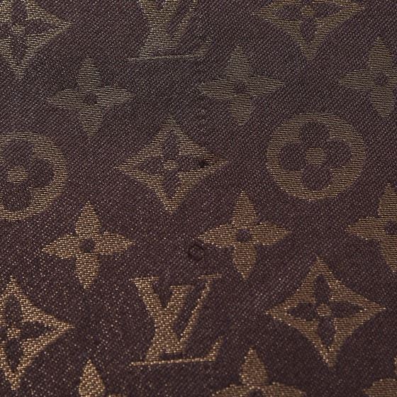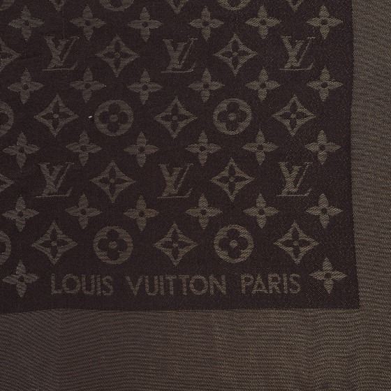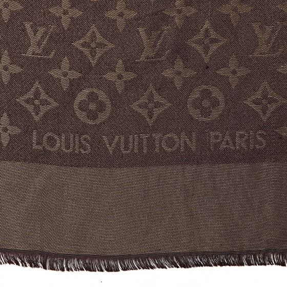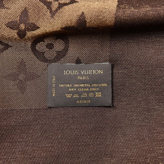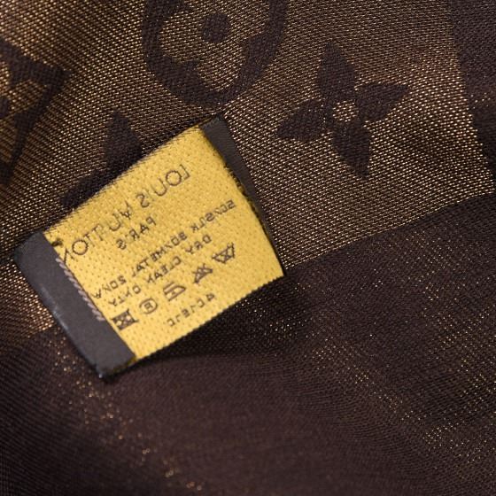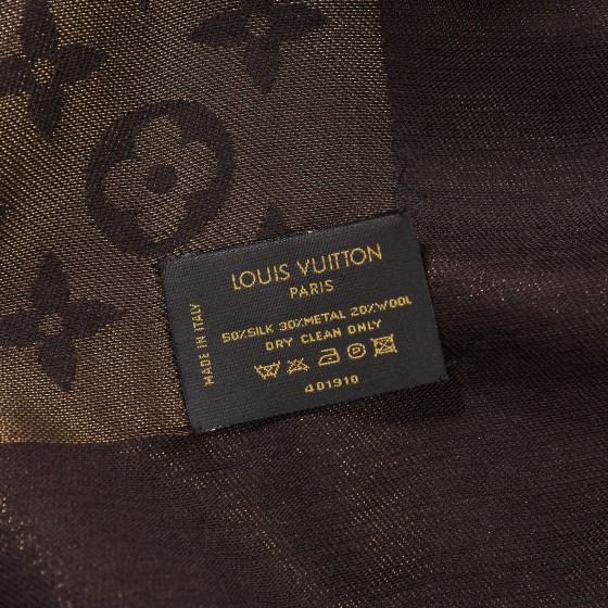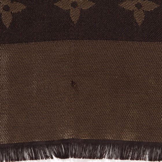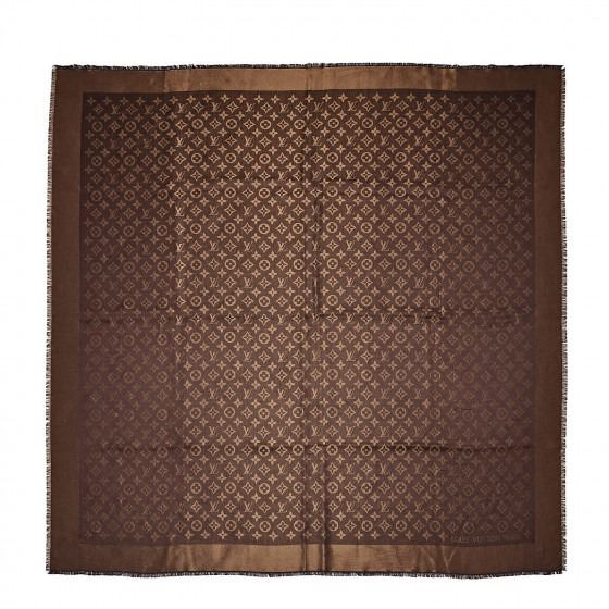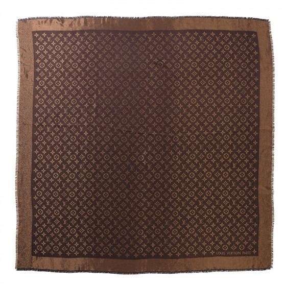 This stunning shawl is finely crafted of 50% silk, 30% metal, and 20% wool, and features classic Louis Vuitton monogram in beautiful dark brown and gold, with fringe trim.