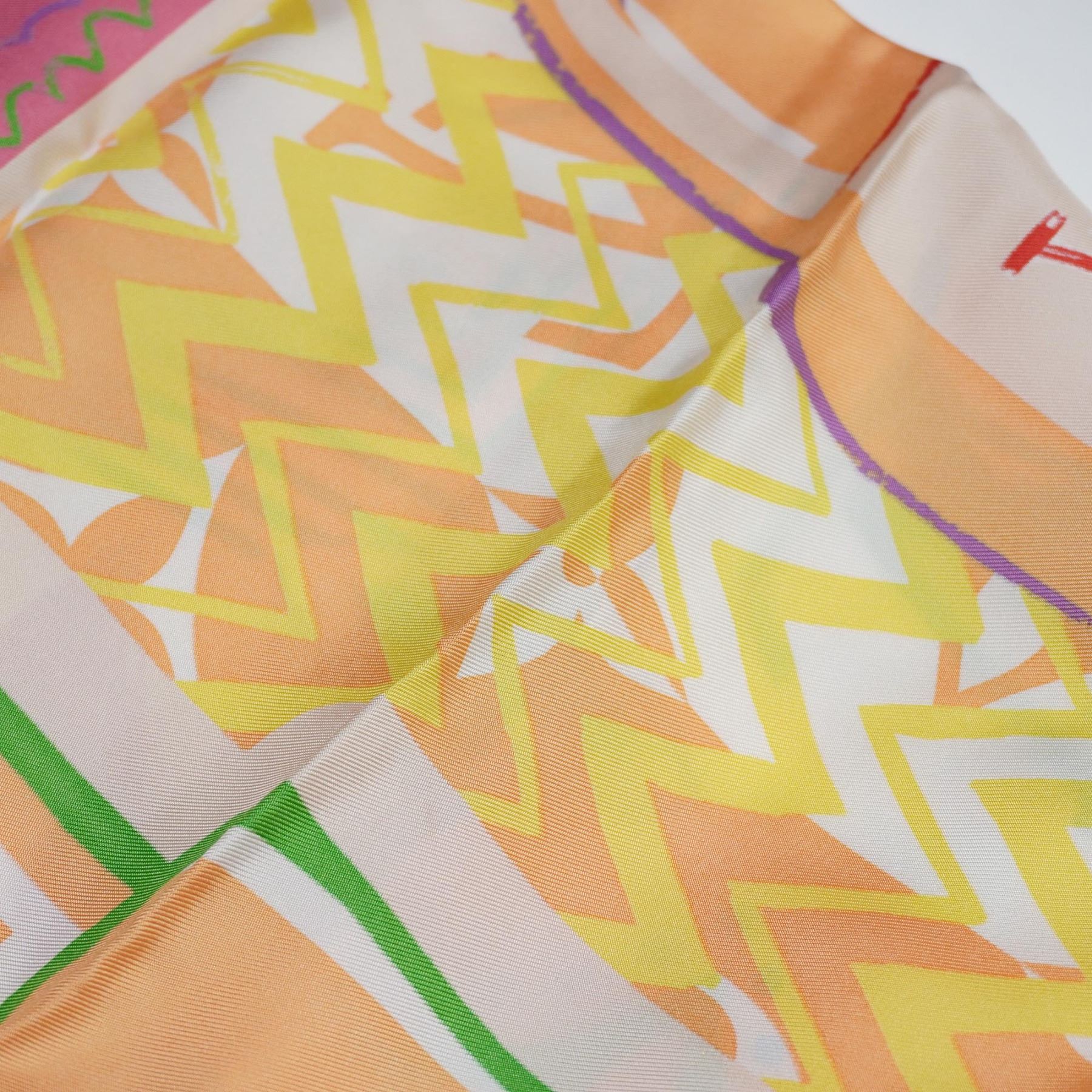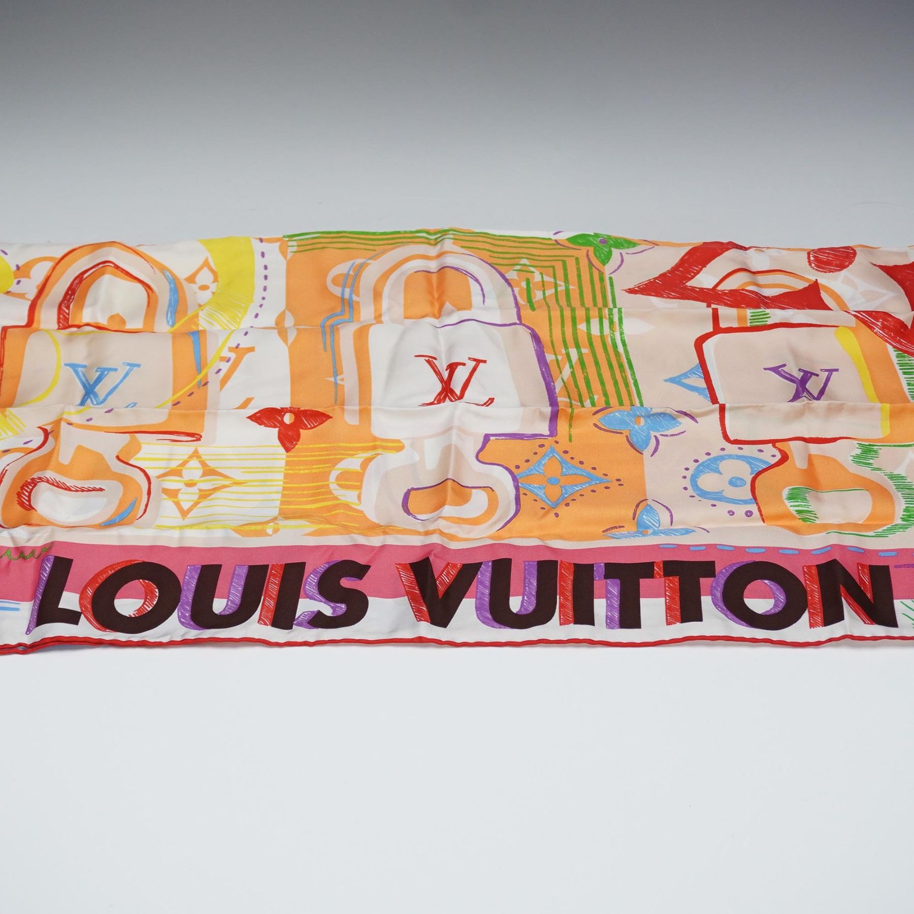 Vibrant Louis Vuitton scarf featuring a playful multicolor design of monogram emblems and stylized handbag illustrations on a silky smooth textile. The scarf is boldly bordered with the Louis Vuitton name and finished with a bright red rolled hem. Made in Italy, this piece captures the brand's artistic approach to accessories with both elegance and whimsy. A stylish collector's item or accent to elevate any outfit. Measures approximately 33"L when fully extended.