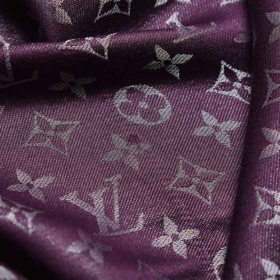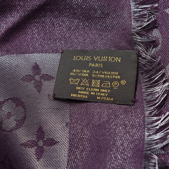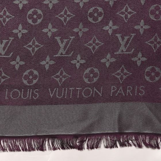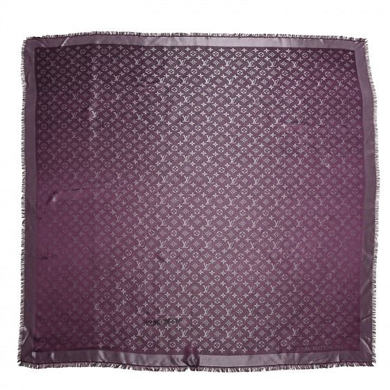 Amarante , dark purple ,shawl is crafted of 49% silk, 24% viscose, 18% wool and 9% polyester. This sizable shawl features a shiny Louis Vuitton monogram with a fringe detail along the border.