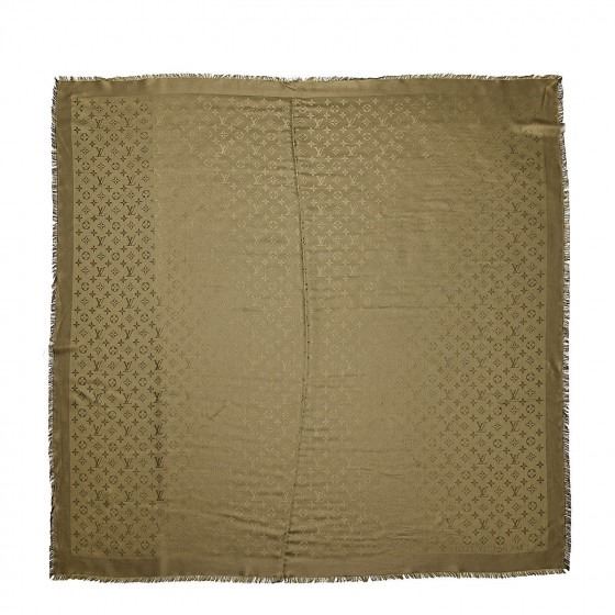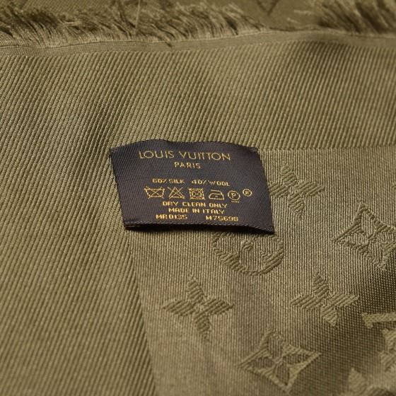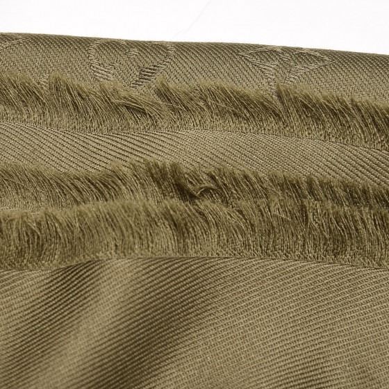 Crafted of 60% silk and 40% wool in a dark forest green. This sizable scarf features a tonal Louis Vuitton monogram.