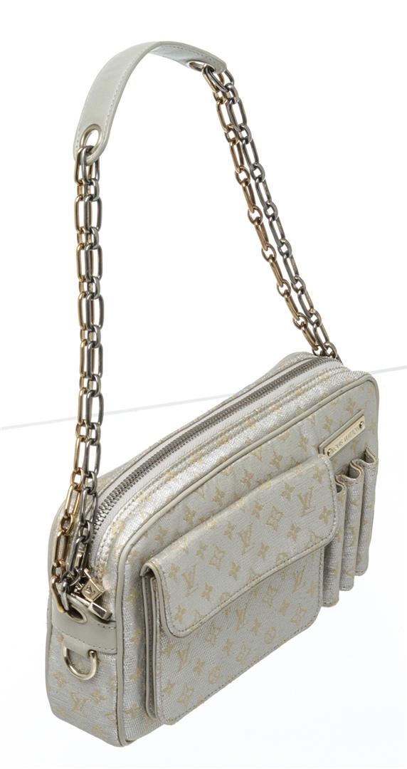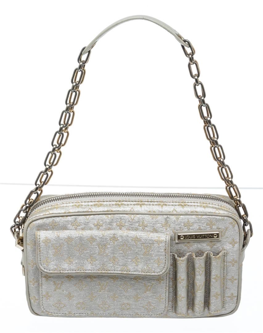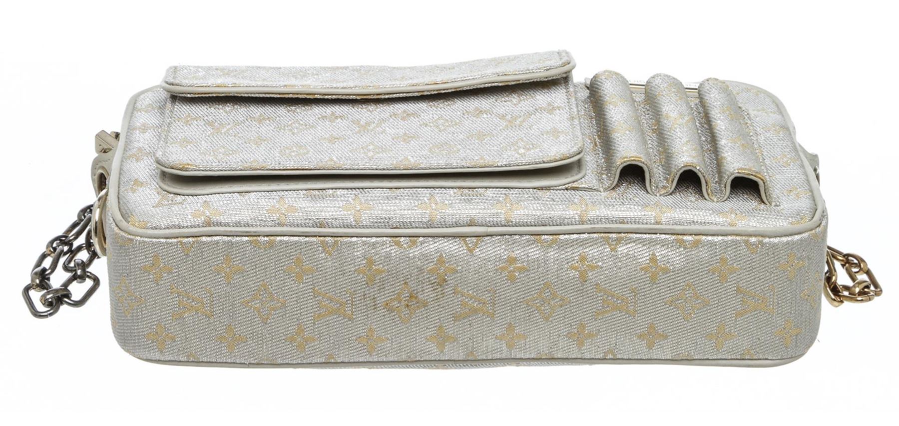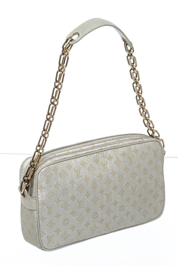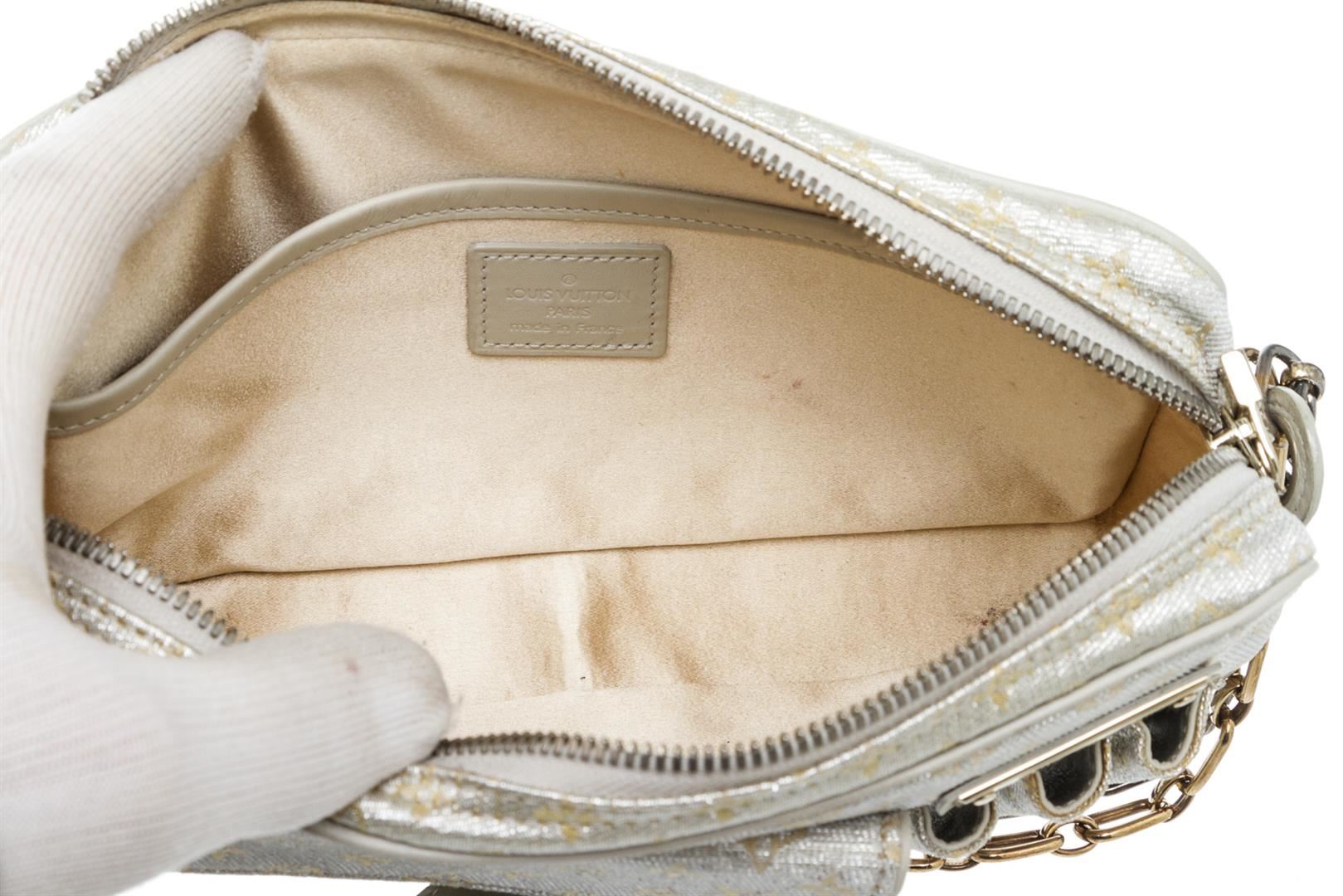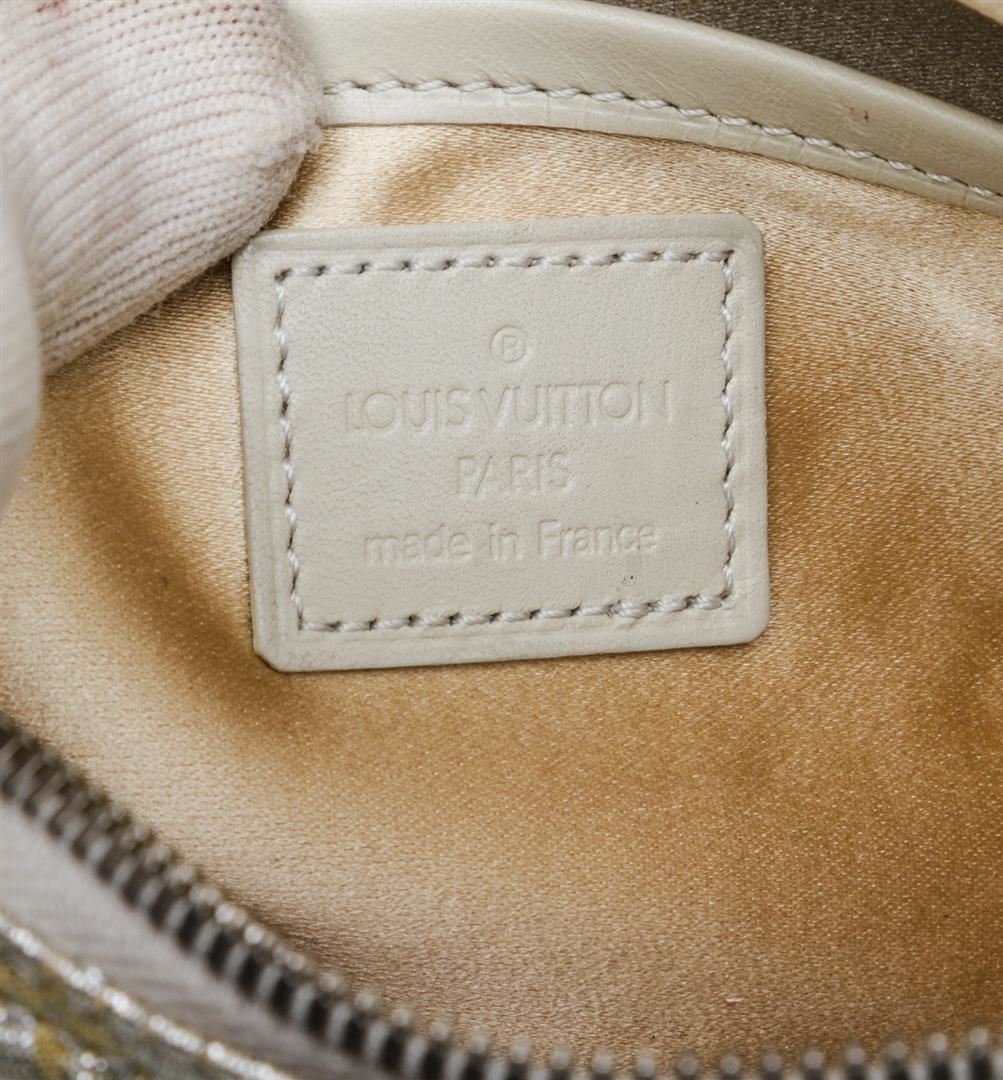 One Louis Vuitton Silver Gold Metallic Canvas Monogram Shine McKenna Bag. Silver and gold metallic canvas bag with leather trim, gold and silver-tone hardware, outer flap pocket and satin interior with top zip closure.
