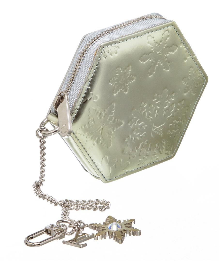 Silver metallic Monogram Vernis leather Louis Vuitton Flocon snowflake coin wallet. Zip around closure, silver-tone hardware, and silver metallic leather lining.