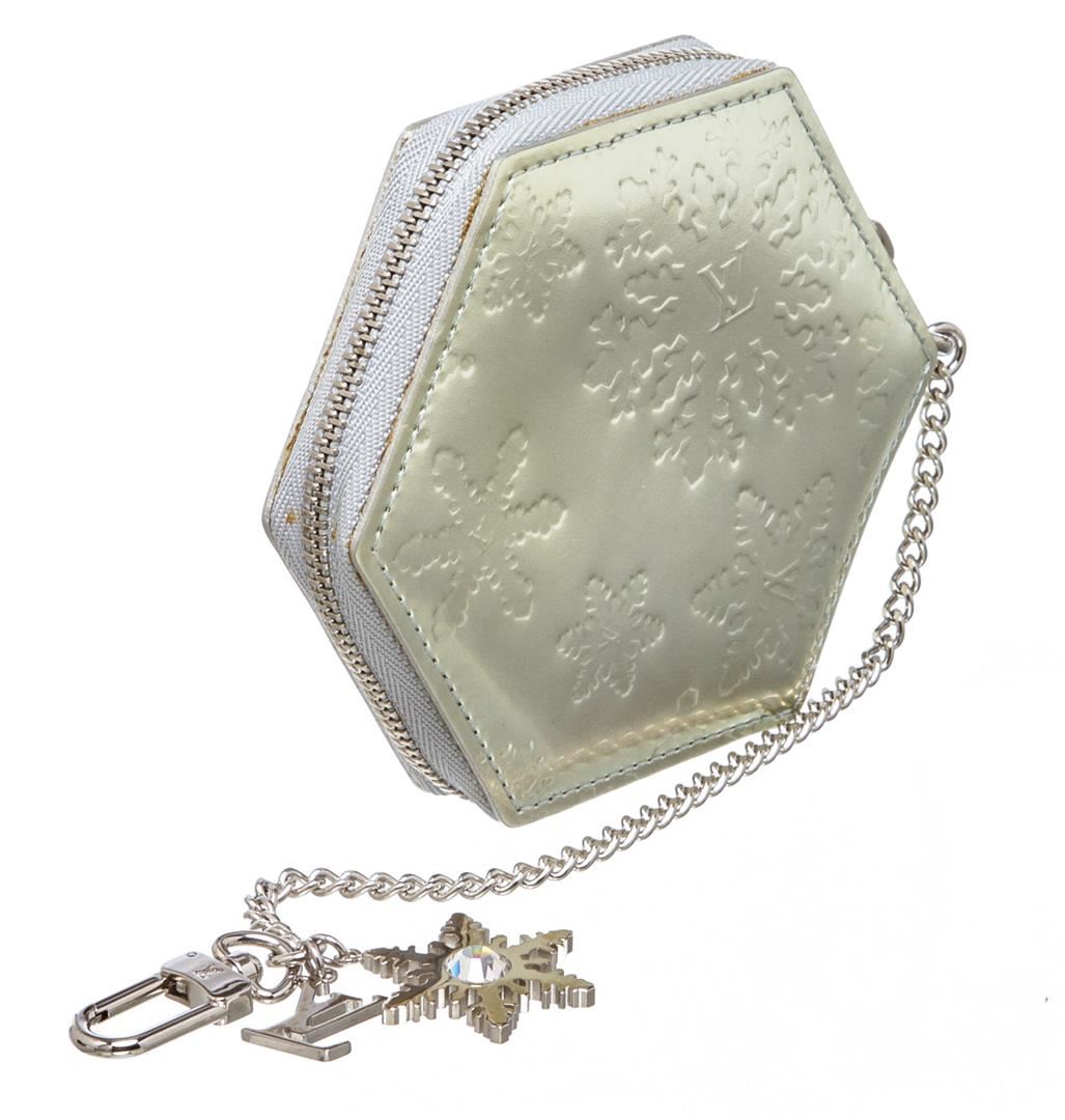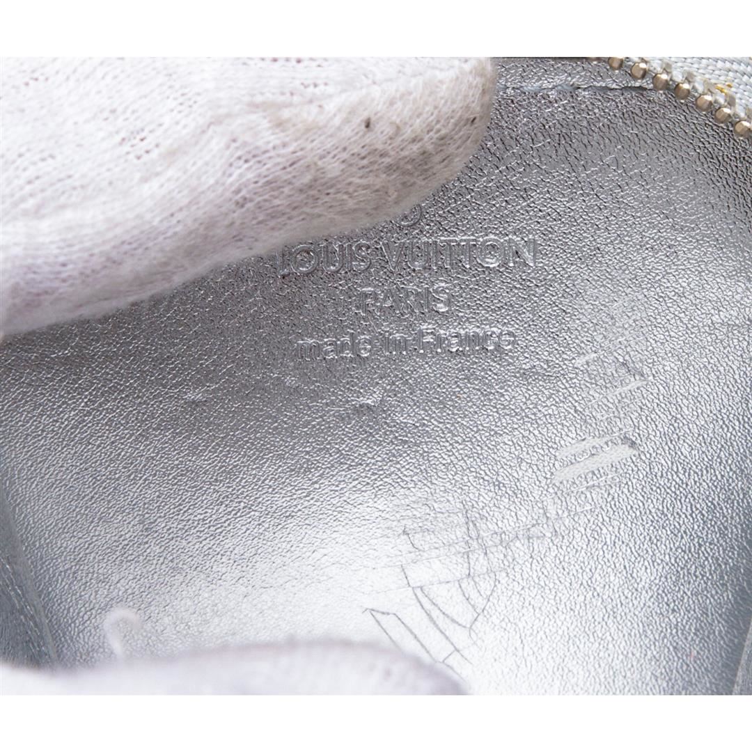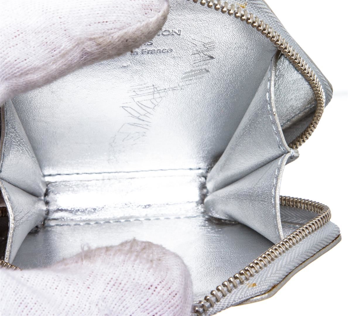 Silver metallic Monogram Vernis leather Louis Vuitton Flocon snowflake coin wallet. Zip around closure, silver-tone hardware, and silver metallic leather lining.