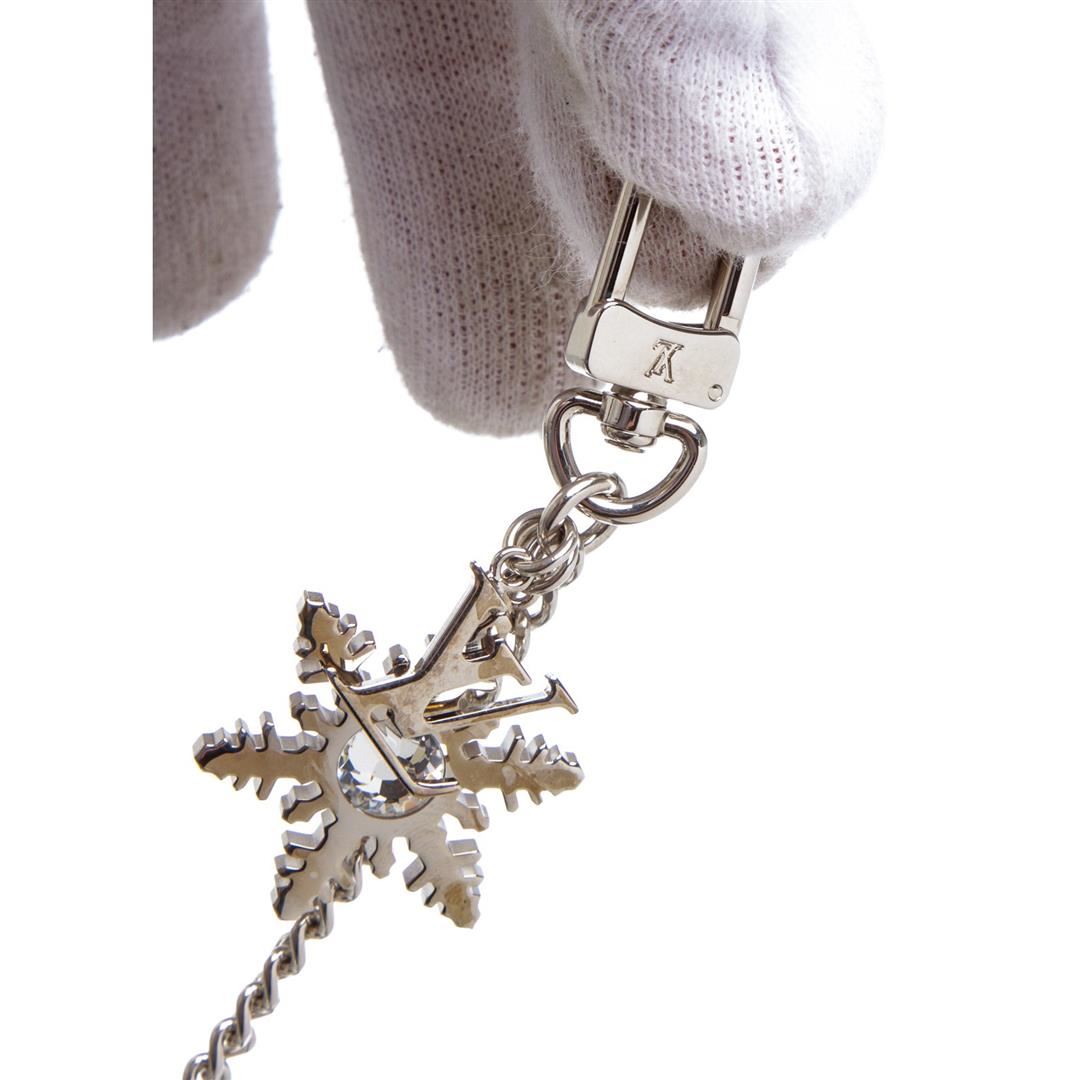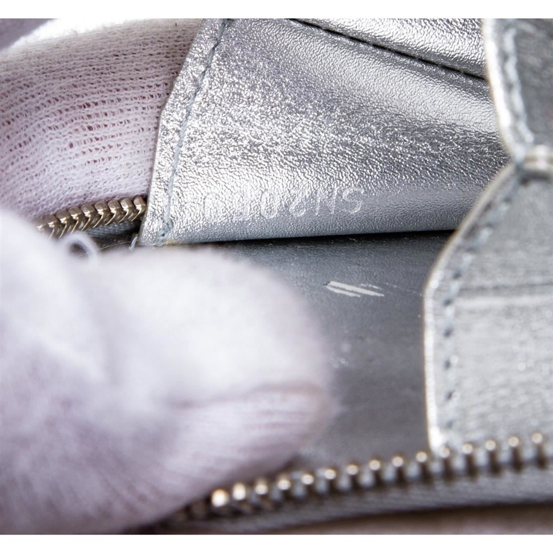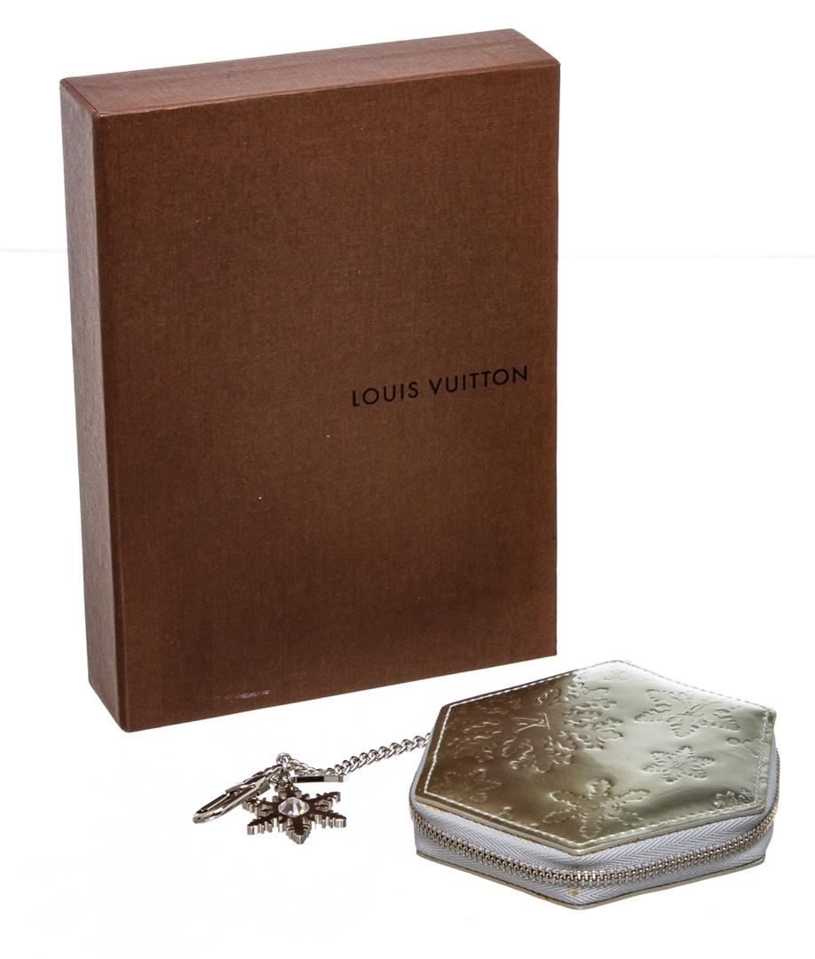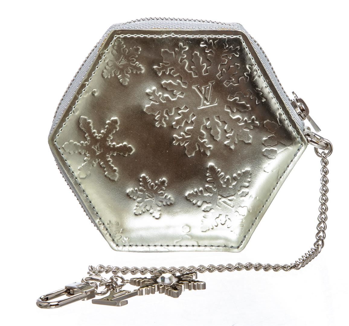 Silver metallic Monogram Vernis leather Louis Vuitton Flocon snowflake coin wallet. Zip around closure, silver-tone hardware, and silver metallic leather lining.