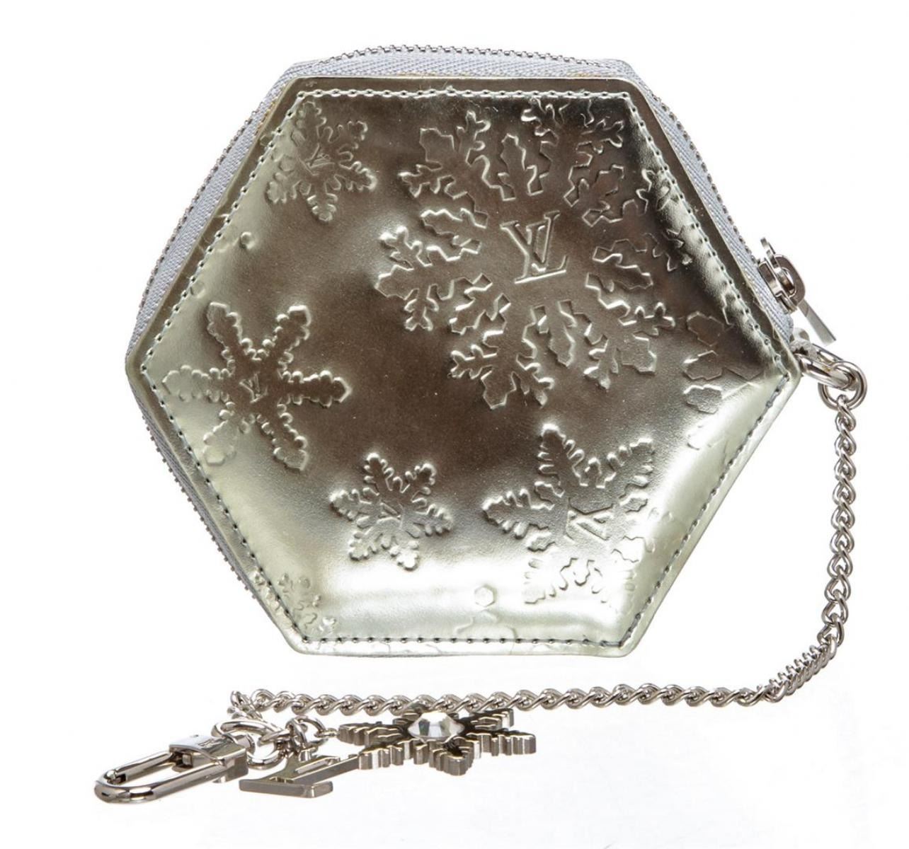 One Louis Vuitton Silver Vernis Monogram Flocon Snowflake Coin Purse Wallet. Silver metallic Monogram Vernis leather Louis Vuitton Flocon snowflake coin wallet. Zip around closure, silver-tone hardware, and silver metallic leather lining..