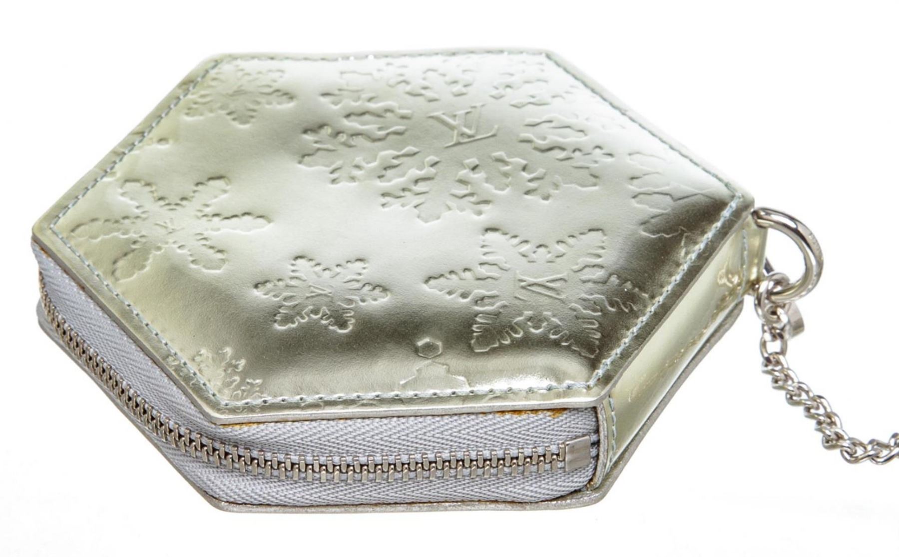 One Louis Vuitton Silver Vernis Monogram Flocon Snowflake Coin Purse Wallet. Silver metallic Monogram Vernis leather Louis Vuitton Flocon snowflake coin wallet. Zip around closure, silver-tone hardware, and silver metallic leather lining..